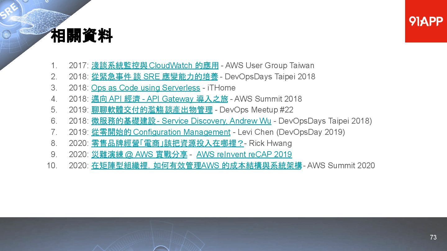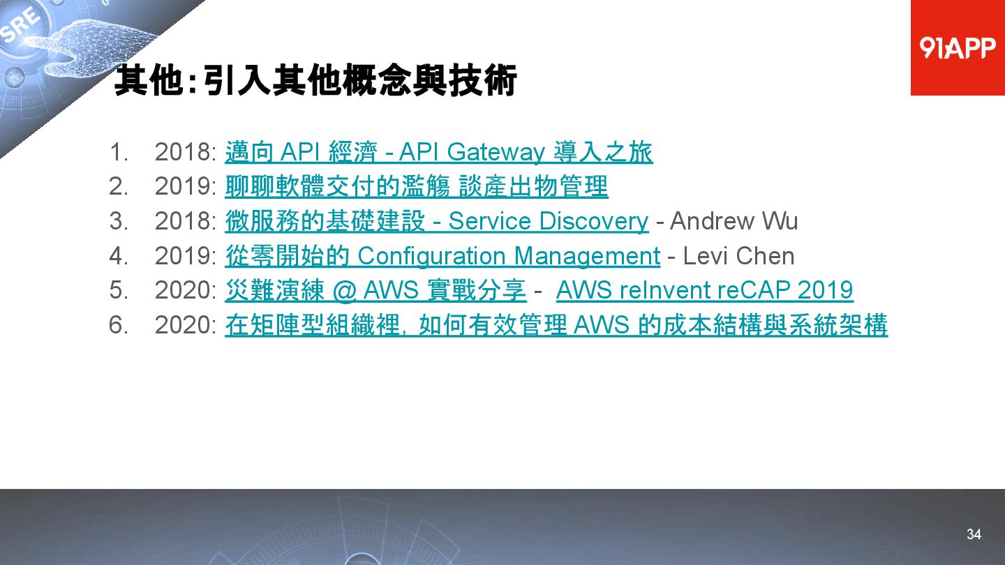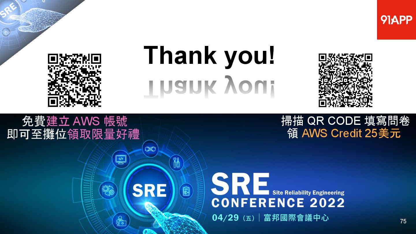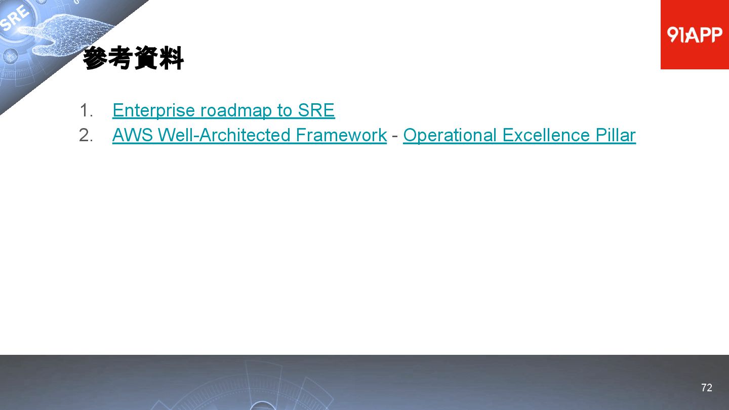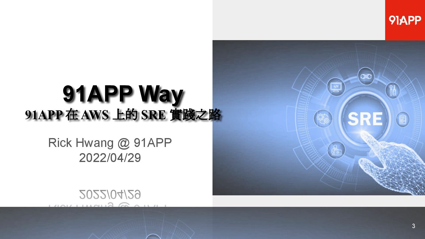 * Date: 2022/04/29 * Title: 91APP 在 AWS 上的 SRE 實踐之路 * SRE Conf 2022 https://sre.ithome.com.tw/ * Youtube: https://youtu.be/f-__anVimq0 * https://rickhw.github.io/2022/05/10/About/2022-SREConf2022/