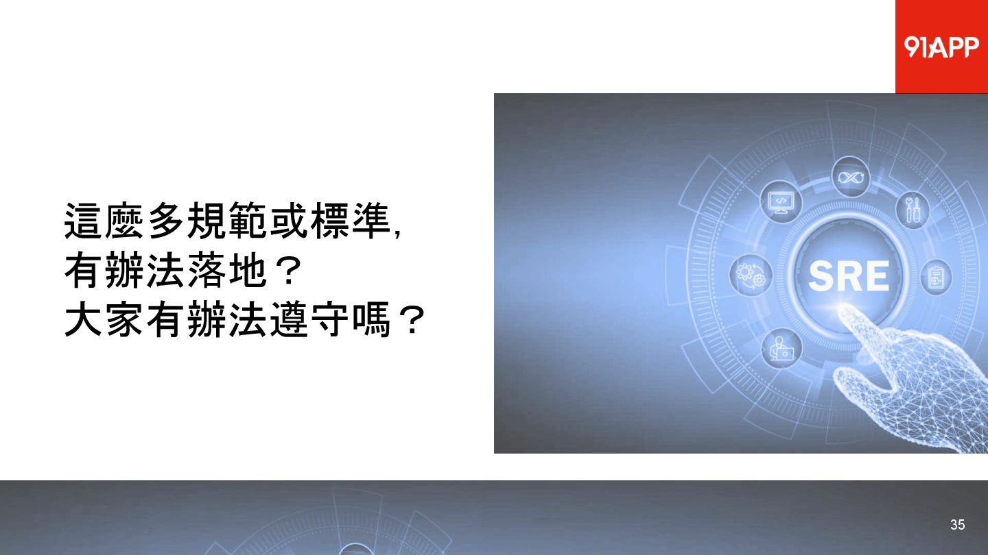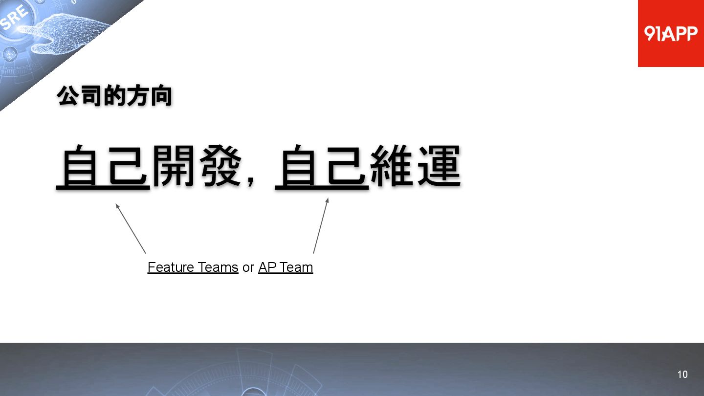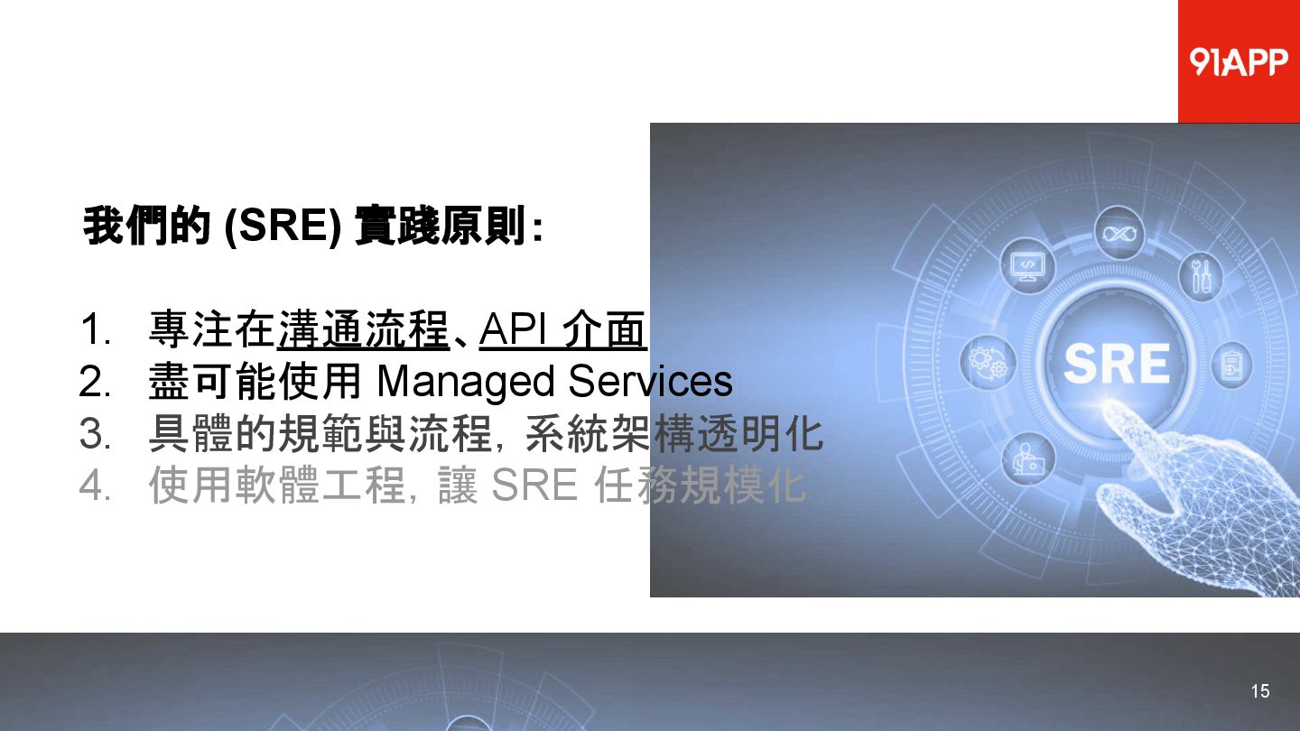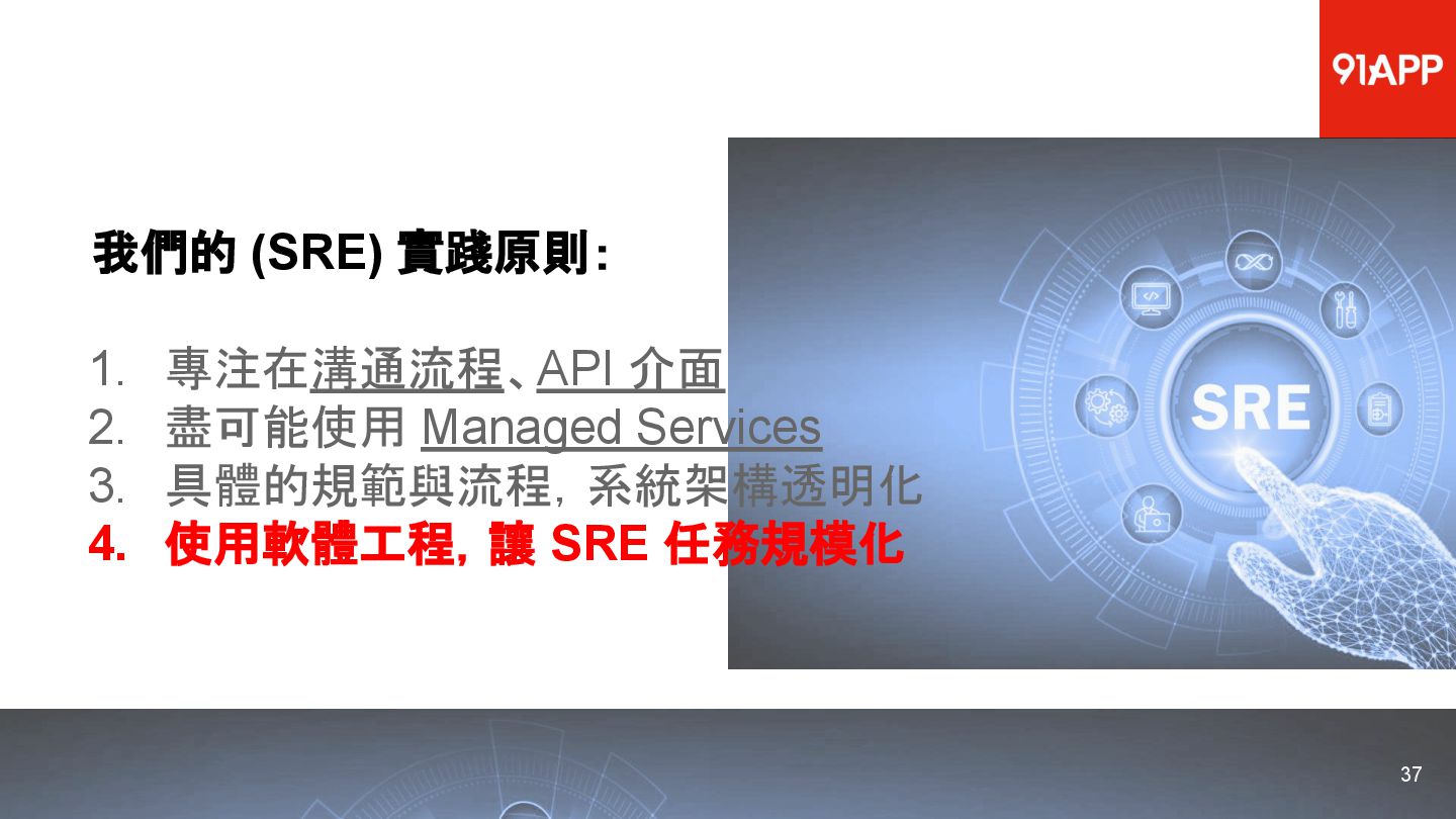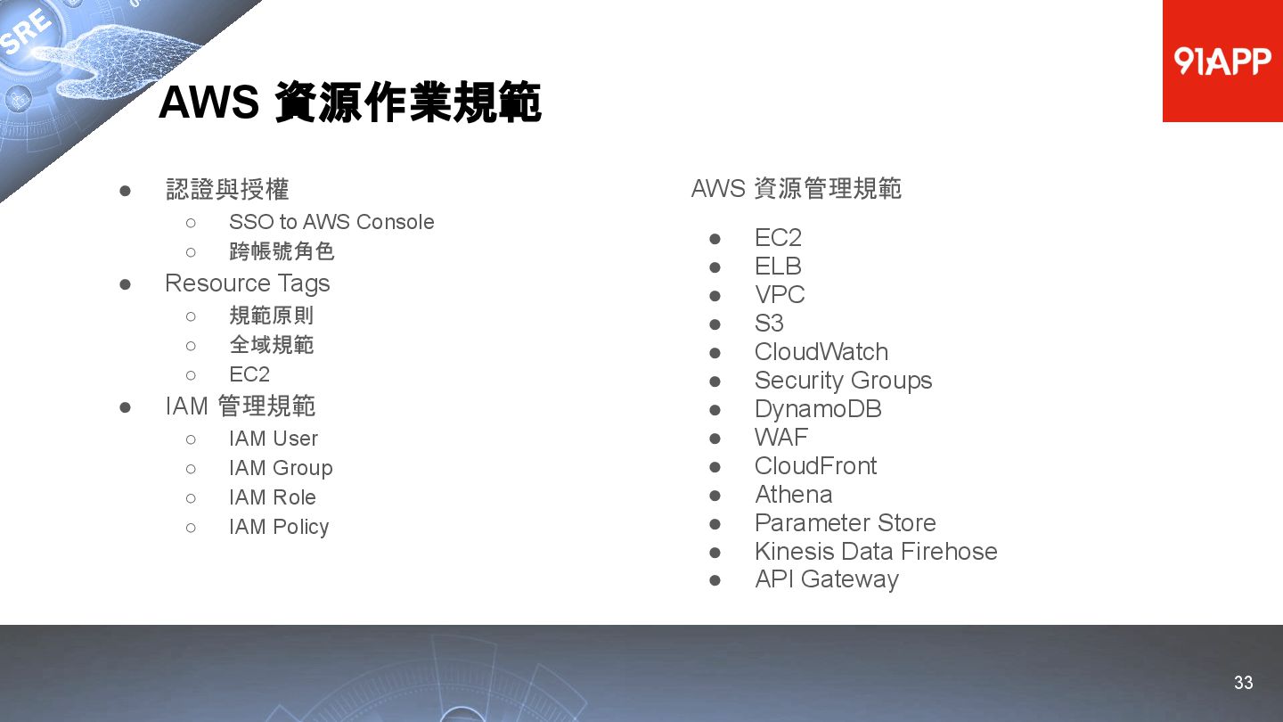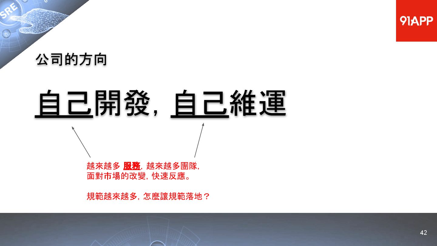 * Date: 2022/04/29 * Title: 91APP 在 AWS 上的 SRE 實踐之路 * SRE Conf 2022 https://sre.ithome.com.tw/ * Youtube: https://youtu.be/f-__anVimq0 * https://rickhw.github.io/2022/05/10/About/2022-SREConf2022/