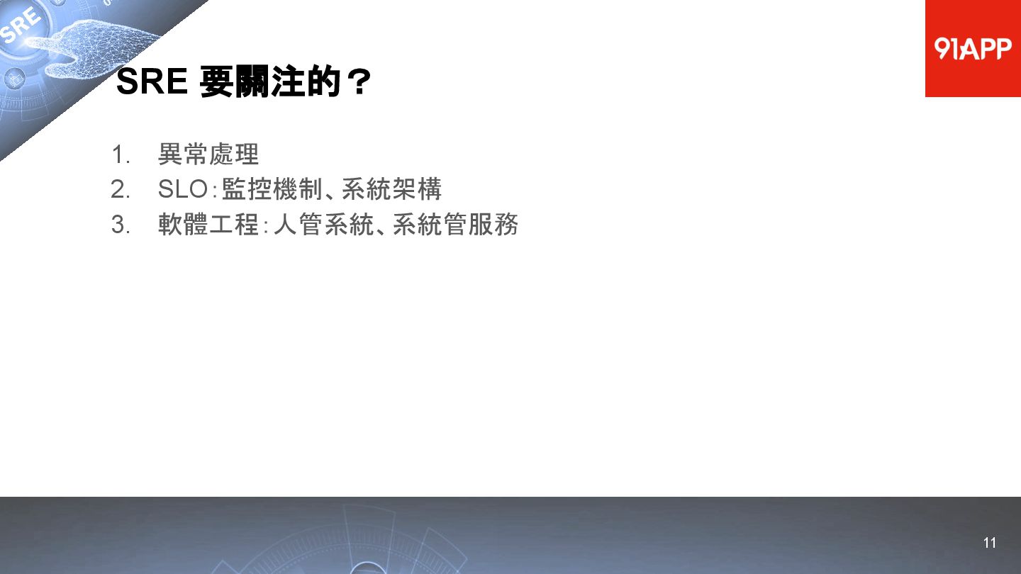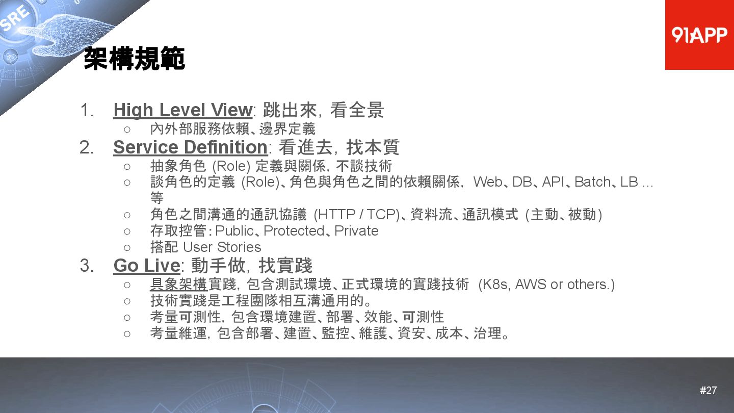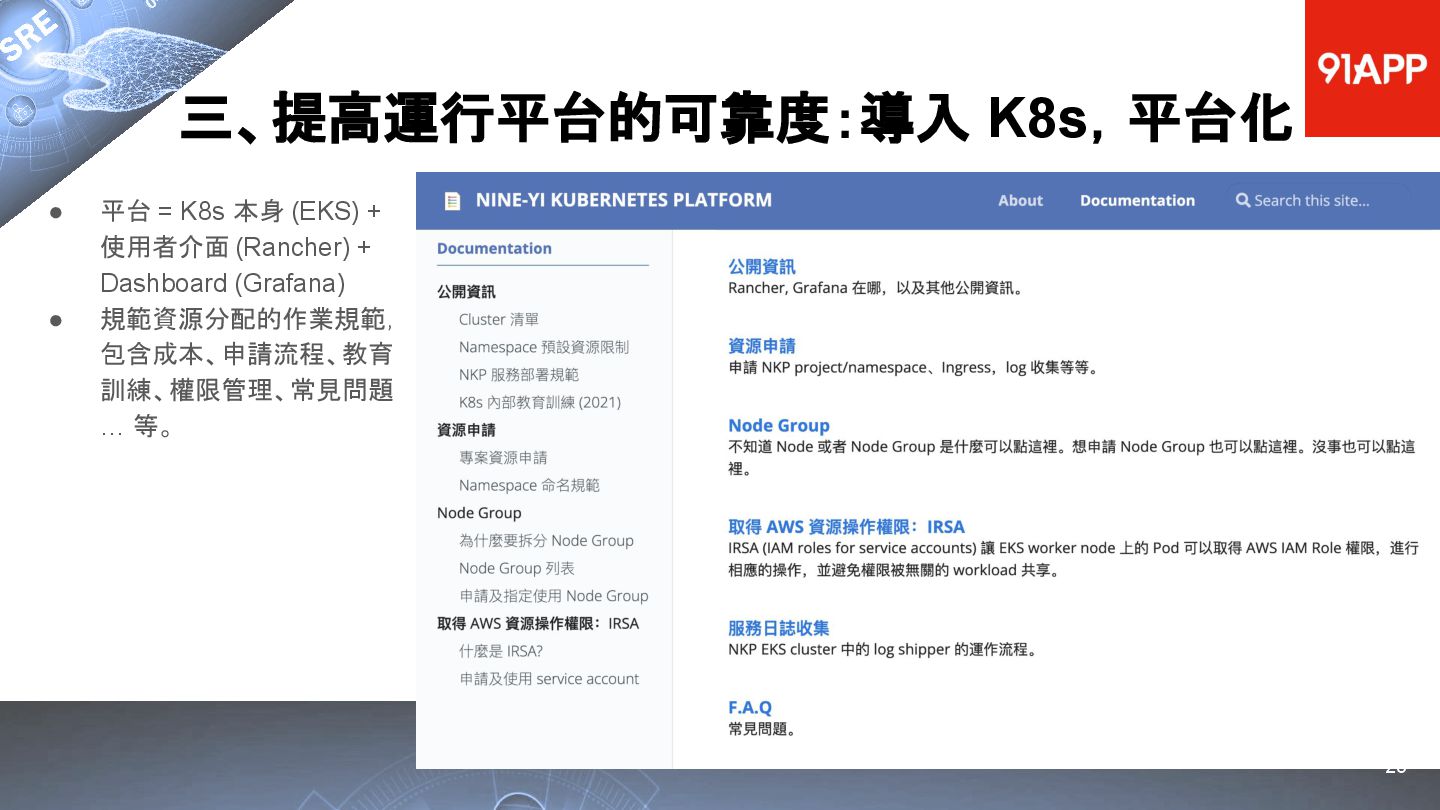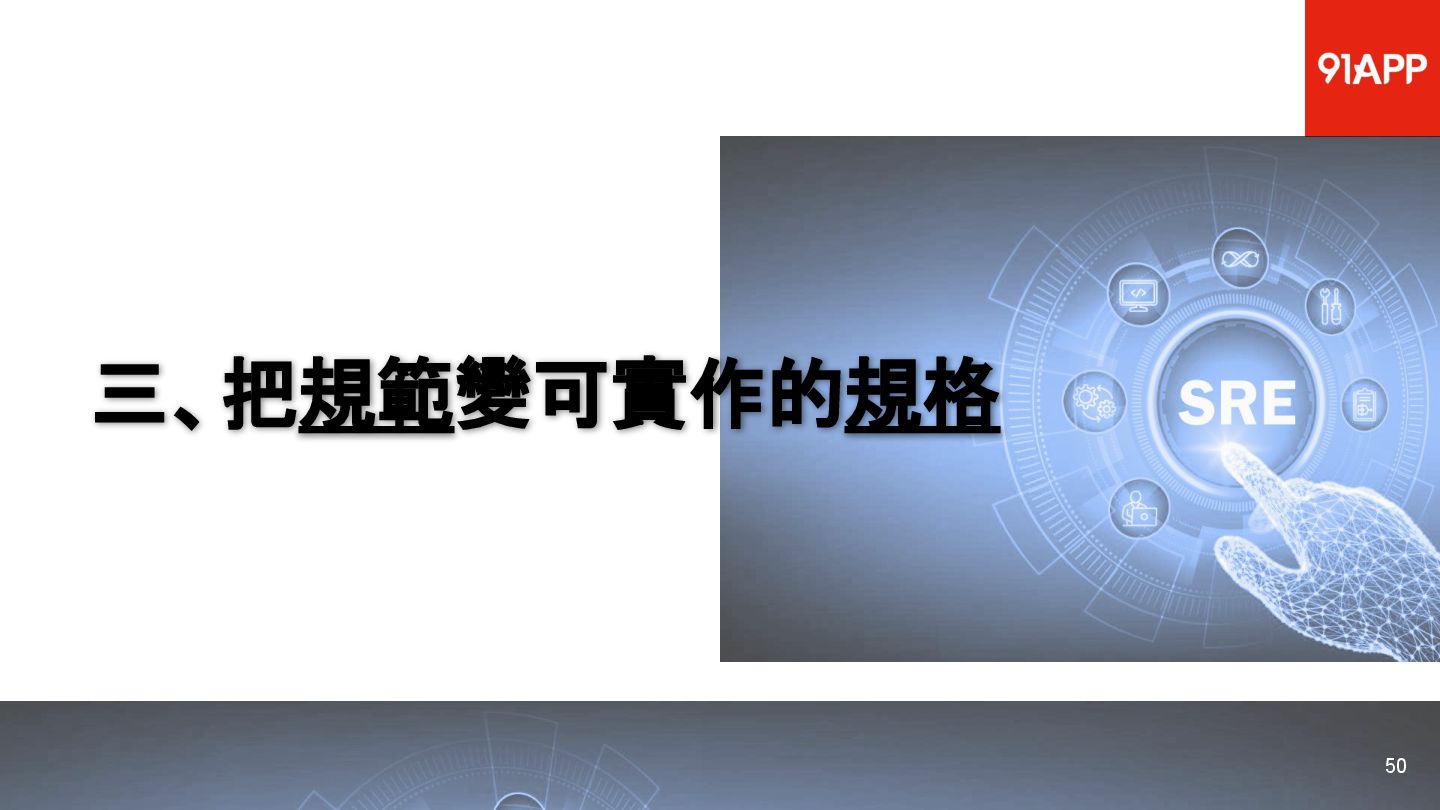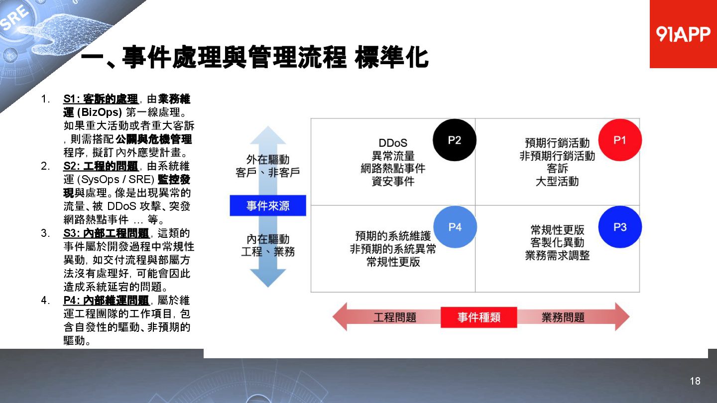 * Date: 2022/04/29 * Title: 91APP 在 AWS 上的 SRE 實踐之路 * SRE Conf 2022 https://sre.ithome.com.tw/ * Youtube: https://youtu.be/f-__anVimq0 * https://rickhw.github.io/2022/05/10/About/2022-SREConf2022/