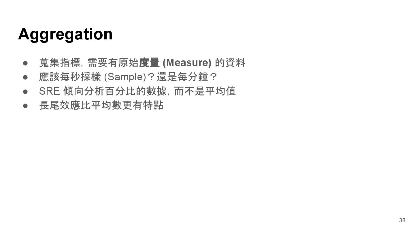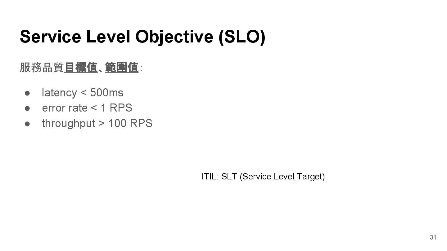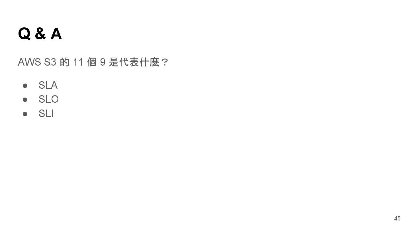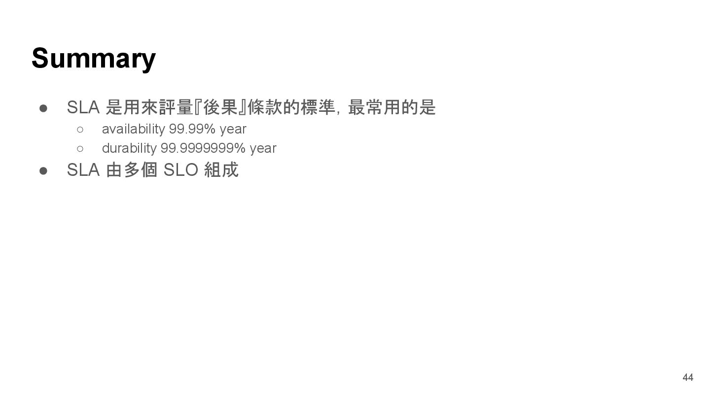 performance ◦ 不能只看眼前,要從全局出發 • Keep it simple ◦ 太複雜的匯總,會難以理解,同時會掩蓋系統性的變化 • Avoid absolutes (絕對值) ◦ 要求擴展系統而沒有增加任何 latency ,或者永遠 Available 都是不切實際的 • Have as few SLOs as possible ◦ 選擇足夠的 SLO 覆蓋系統屬性 • Perfection can wait (不完美也很美) ◦ 隨著時間了解系統之後,進行 SLO 定義與調整。 42