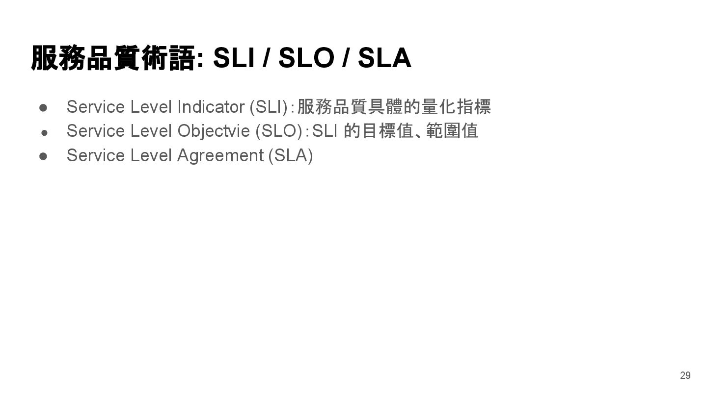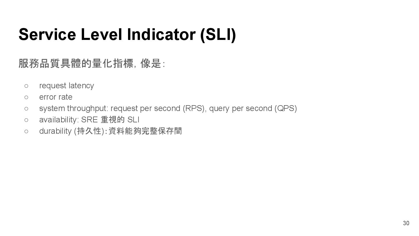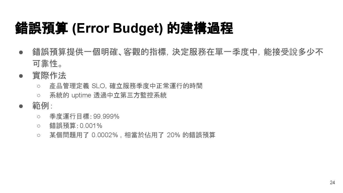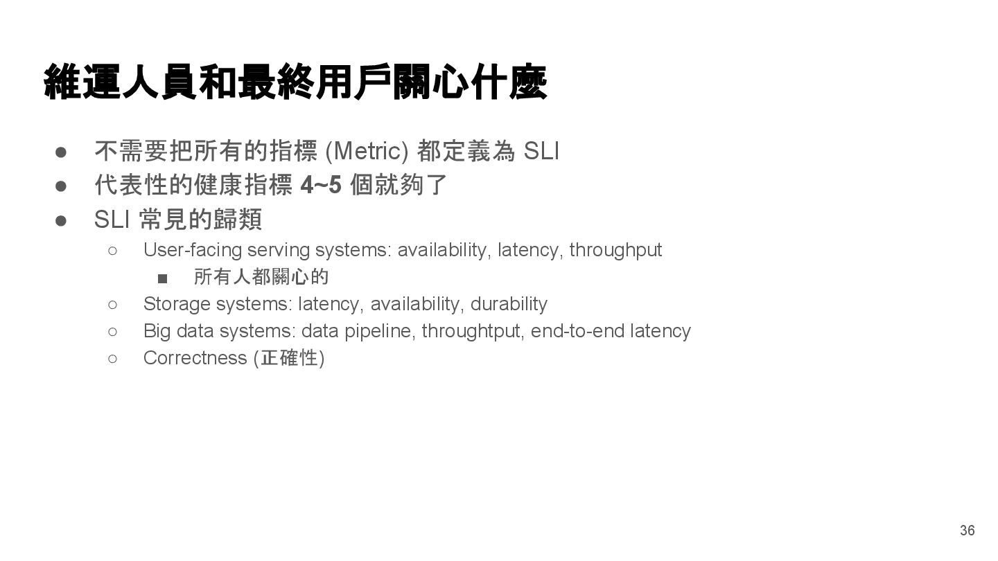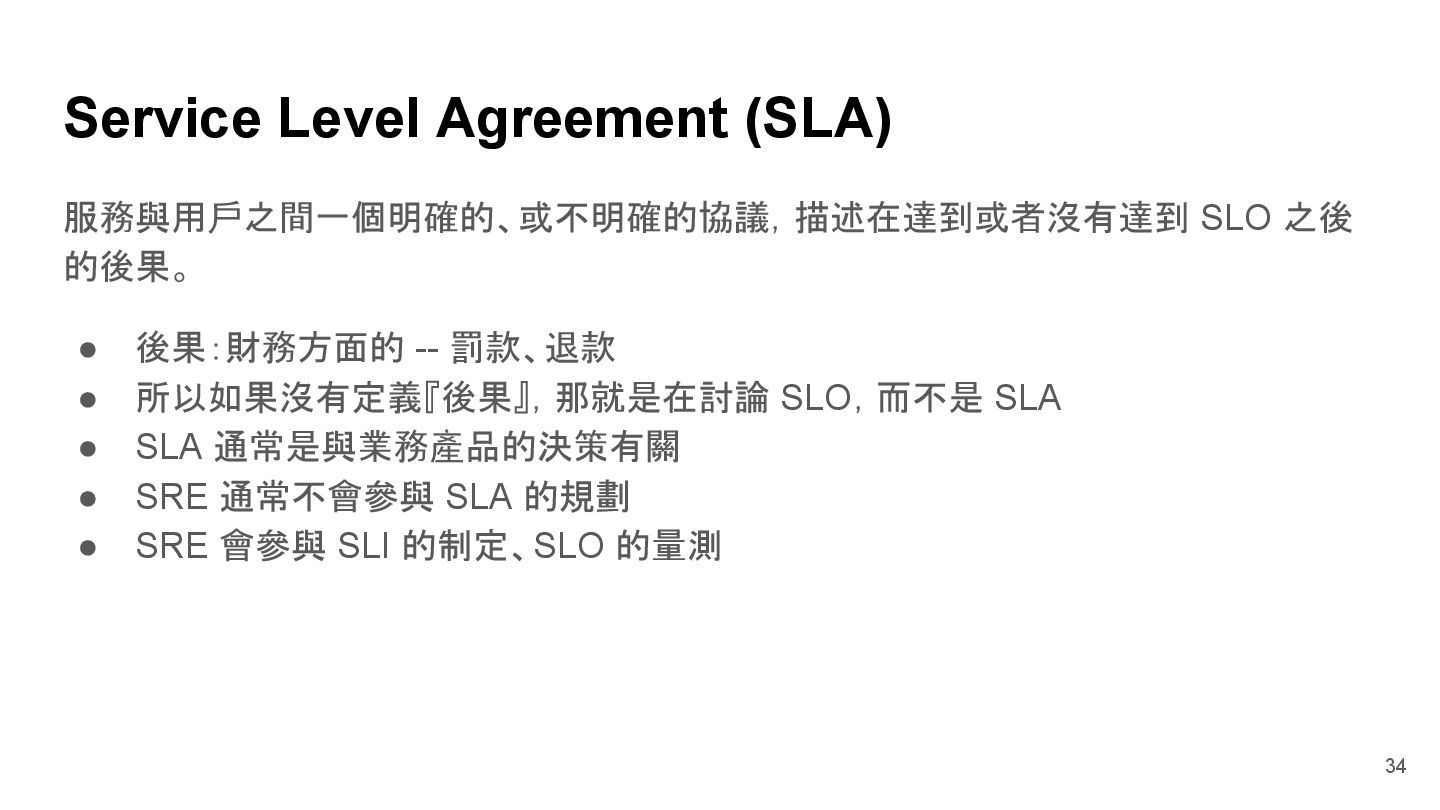 performance ◦ 不能只看眼前,要從全局出發 • Keep it simple ◦ 太複雜的匯總,會難以理解,同時會掩蓋系統性的變化 • Avoid absolutes (絕對值) ◦ 要求擴展系統而沒有增加任何 latency ,或者永遠 Available 都是不切實際的 • Have as few SLOs as possible ◦ 選擇足夠的 SLO 覆蓋系統屬性 • Perfection can wait (不完美也很美) ◦ 隨著時間了解系統之後,進行 SLO 定義與調整。 42