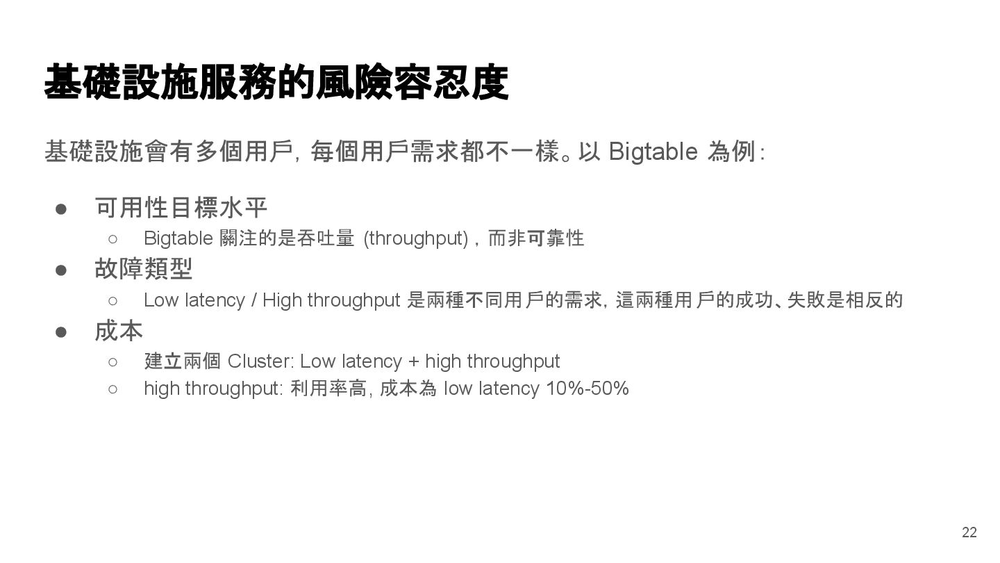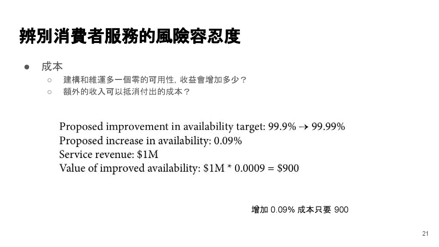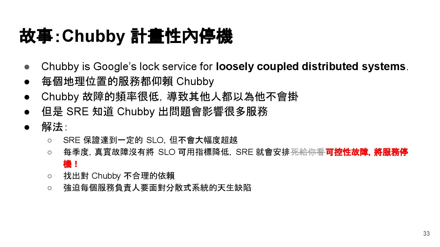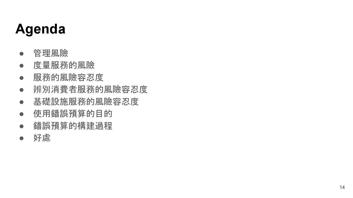 performance ◦ 不能只看眼前,要從全局出發 • Keep it simple ◦ 太複雜的匯總,會難以理解,同時會掩蓋系統性的變化 • Avoid absolutes (絕對值) ◦ 要求擴展系統而沒有增加任何 latency ,或者永遠 Available 都是不切實際的 • Have as few SLOs as possible ◦ 選擇足夠的 SLO 覆蓋系統屬性 • Perfection can wait (不完美也很美) ◦ 隨著時間了解系統之後,進行 SLO 定義與調整。 42