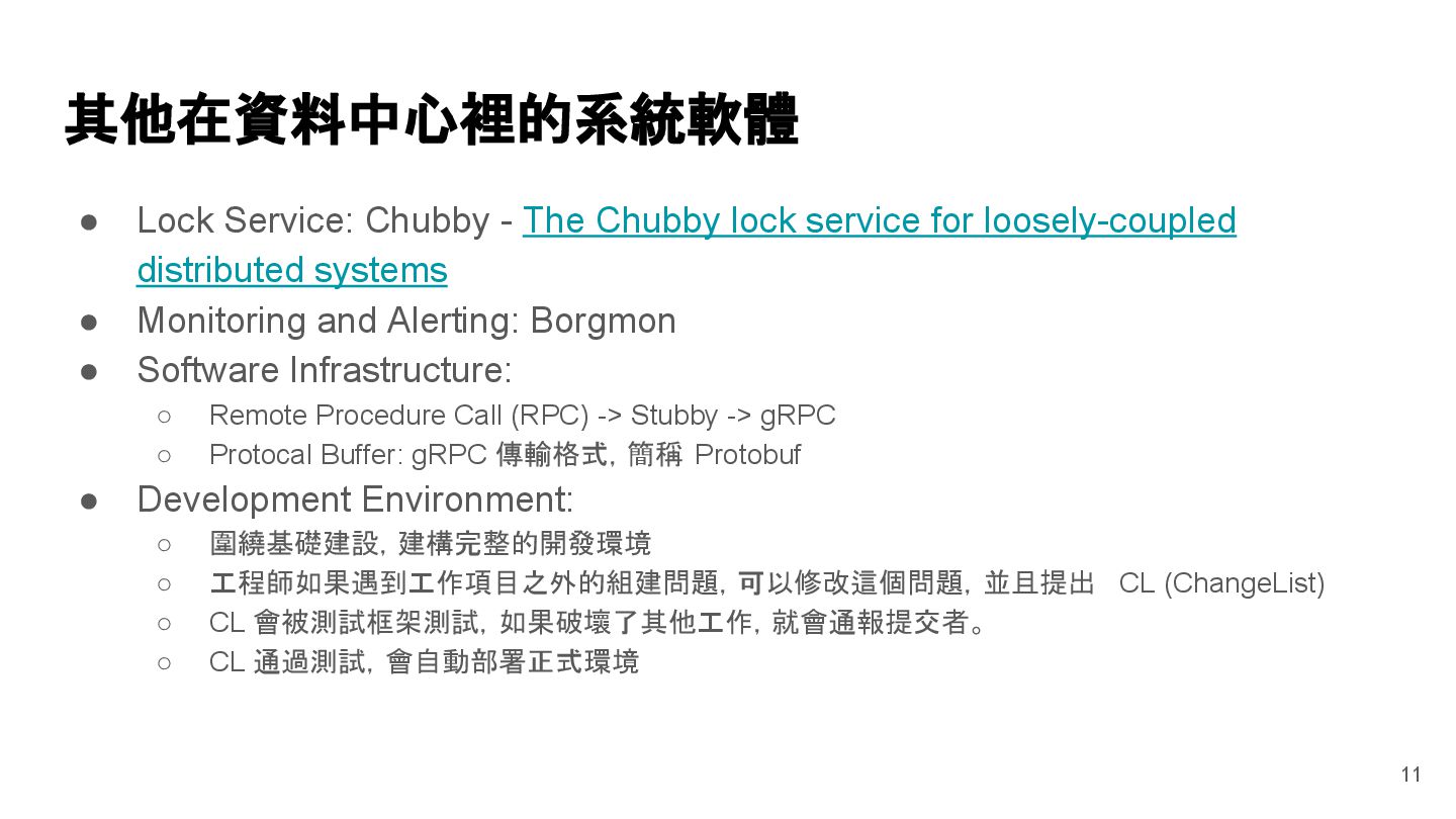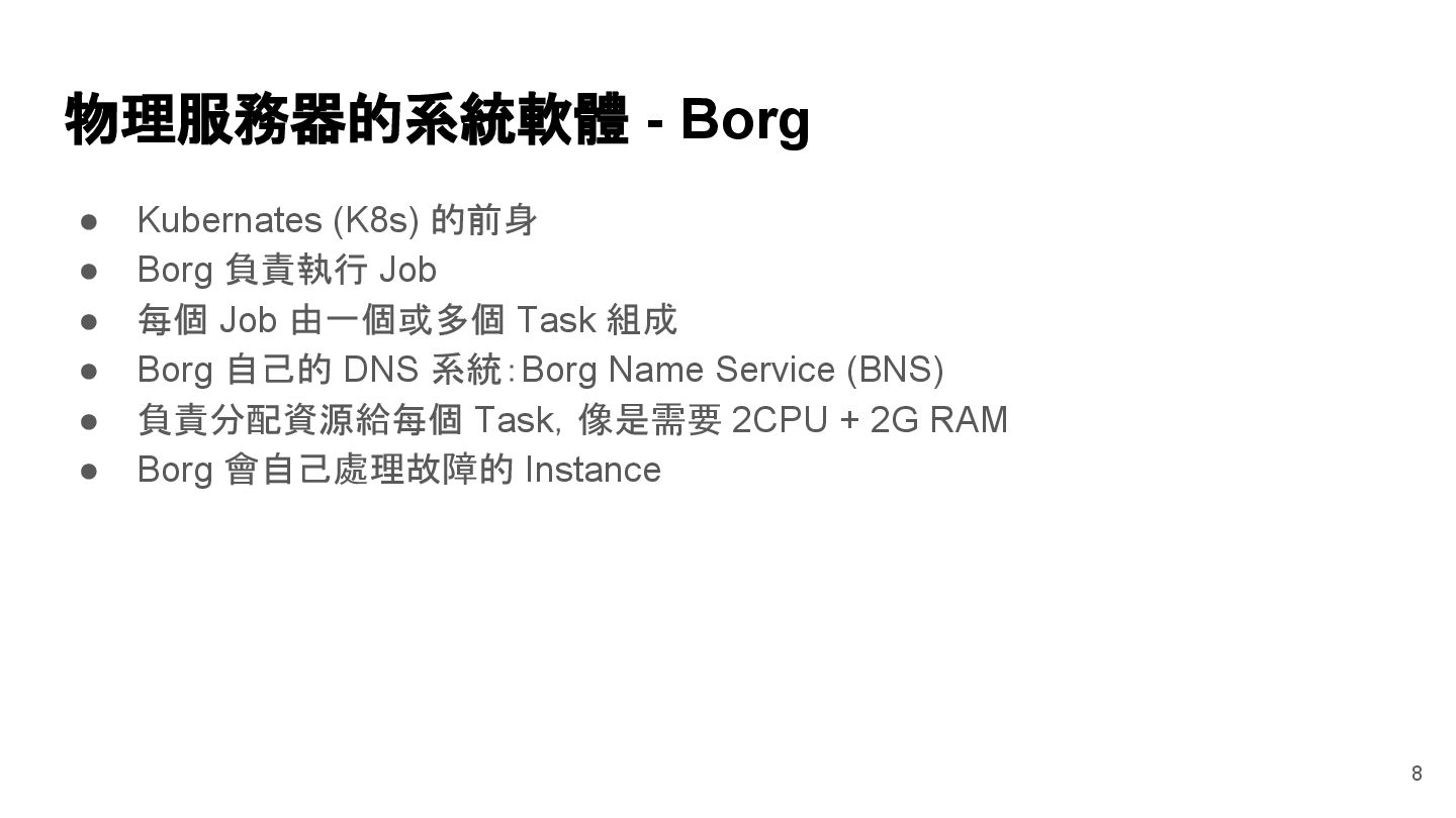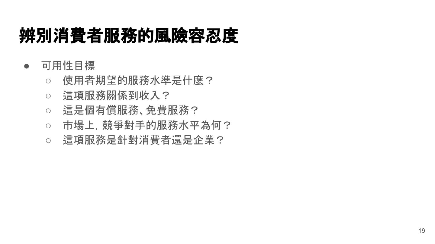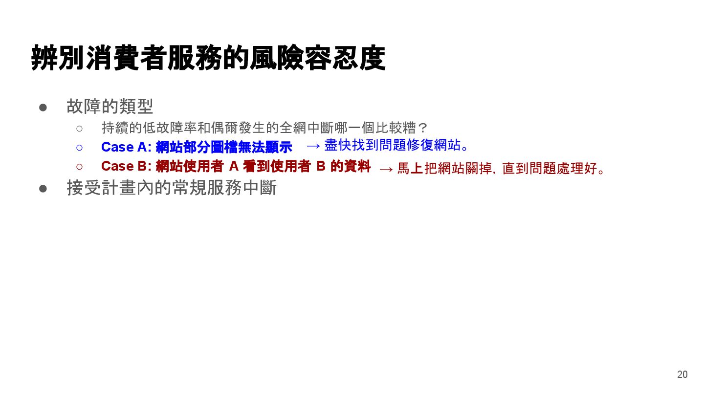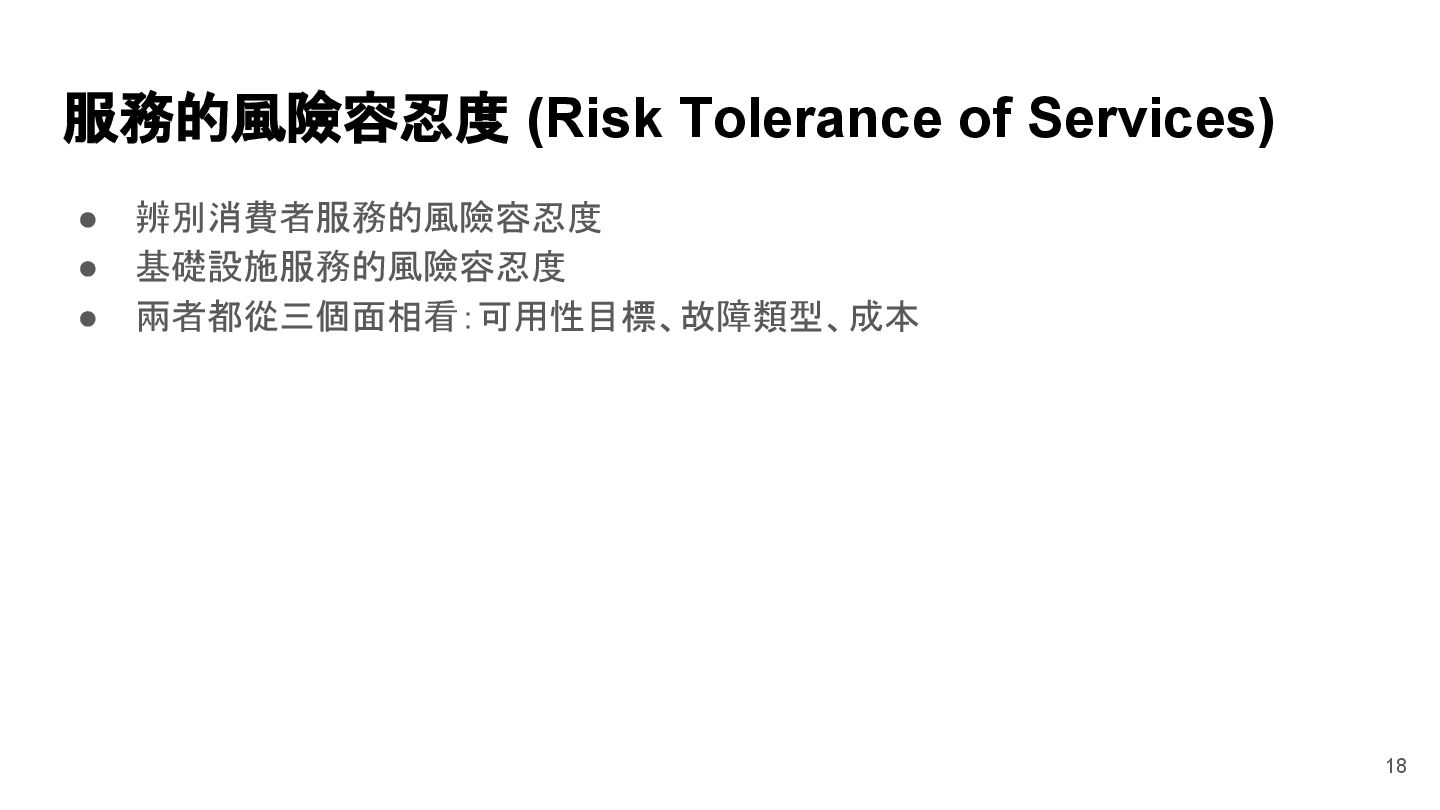 performance ◦ 不能只看眼前,要從全局出發 • Keep it simple ◦ 太複雜的匯總,會難以理解,同時會掩蓋系統性的變化 • Avoid absolutes (絕對值) ◦ 要求擴展系統而沒有增加任何 latency ,或者永遠 Available 都是不切實際的 • Have as few SLOs as possible ◦ 選擇足夠的 SLO 覆蓋系統屬性 • Perfection can wait (不完美也很美) ◦ 隨著時間了解系統之後,進行 SLO 定義與調整。 42