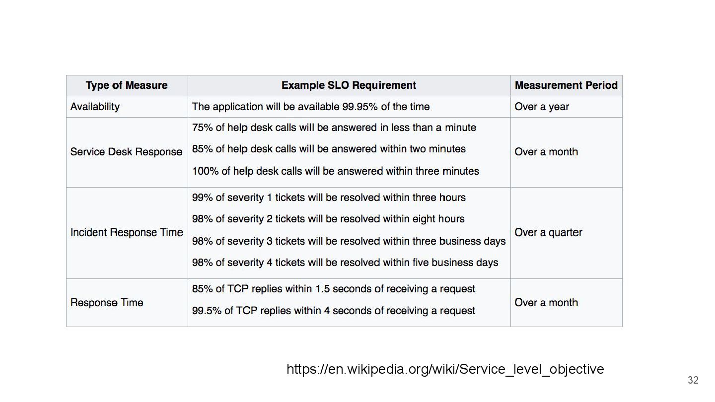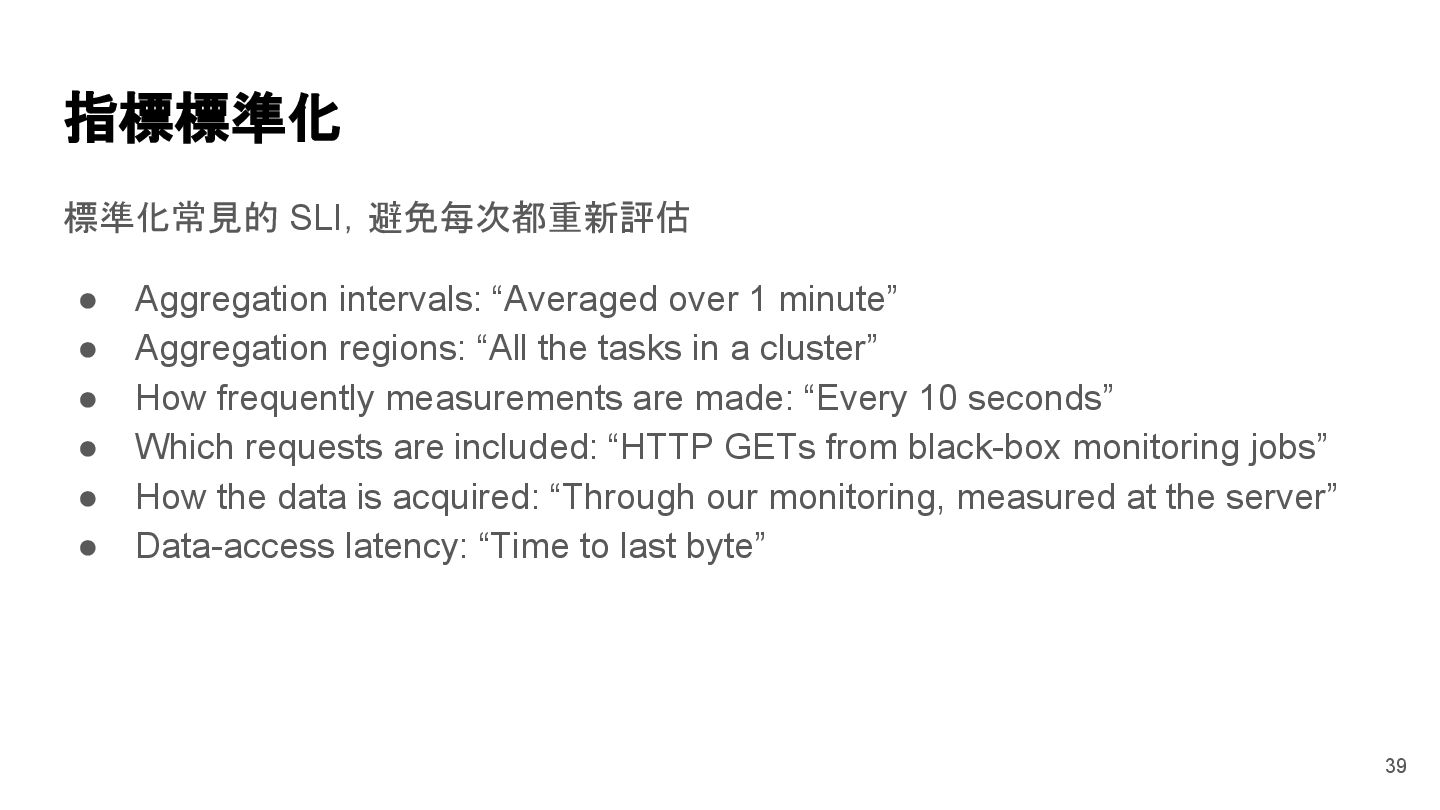 • Aggregation regions: “All the tasks in a cluster” • How frequently measurements are made: “Every 10 seconds” • Which requests are included: “HTTP GETs from black-box monitoring jobs” • How the data is acquired: “Through our monitoring, measured at the server” • Data-access latency: “Time to last byte” 39