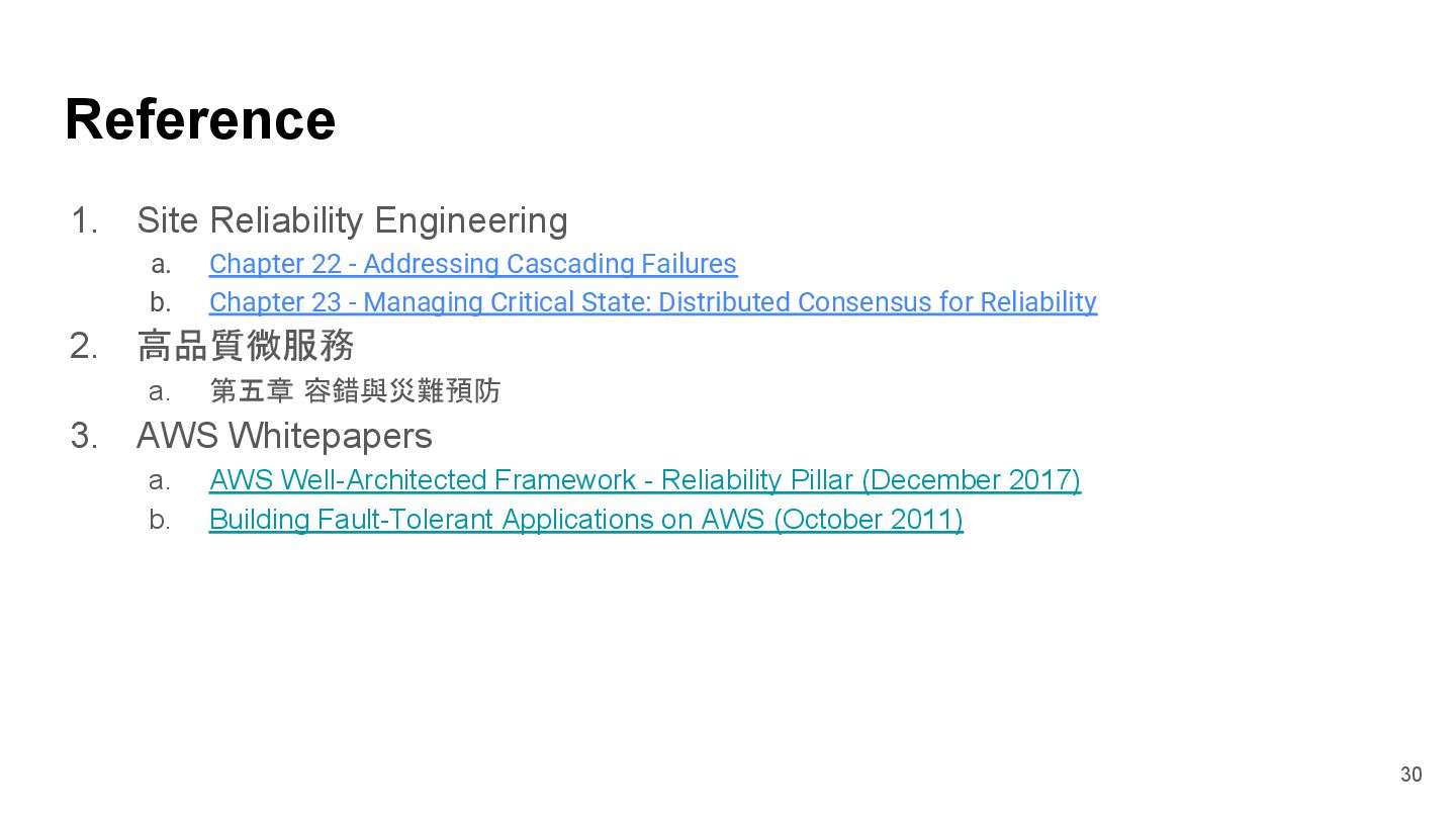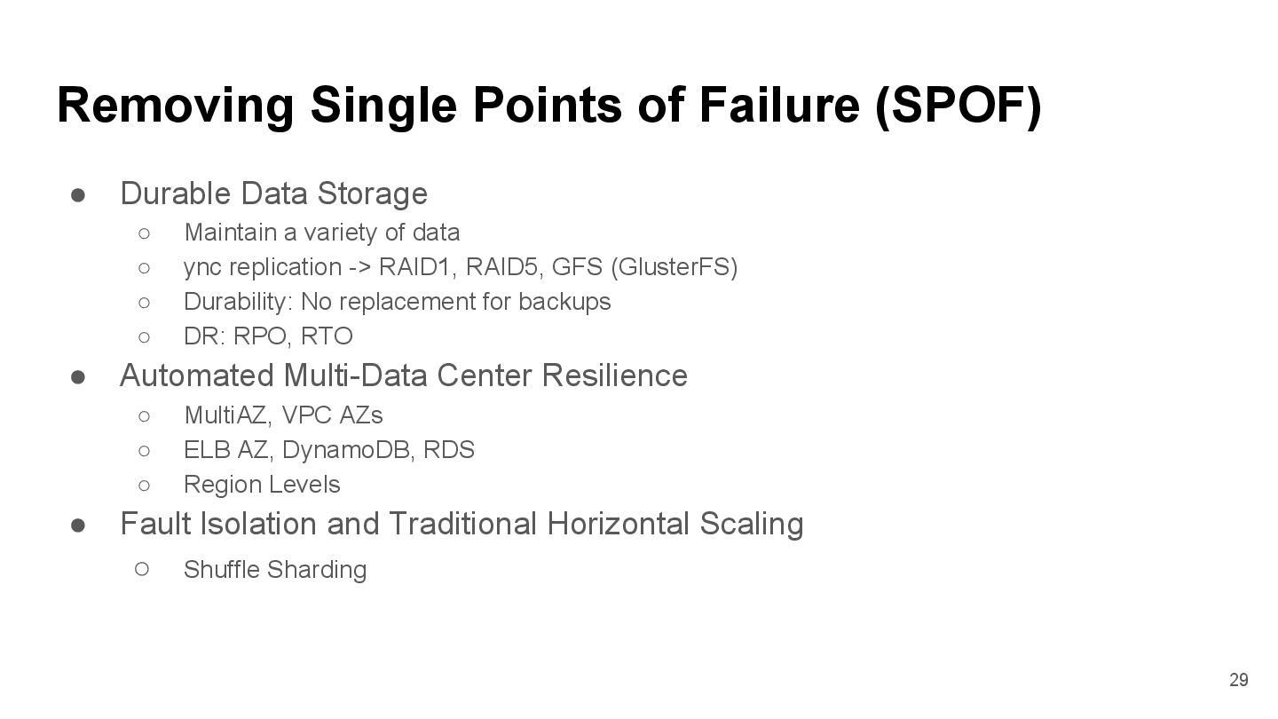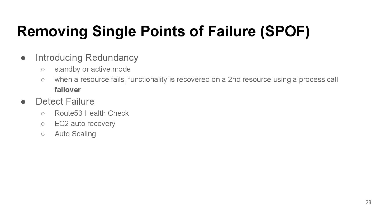 a resource fails, functionality is recovered on a 2nd resource using a process call failover • Detect Failure ◦ Route53 Health Check ◦ EC2 auto recovery ◦ Auto Scaling Removing Single Points of Failure (SPOF) 28
