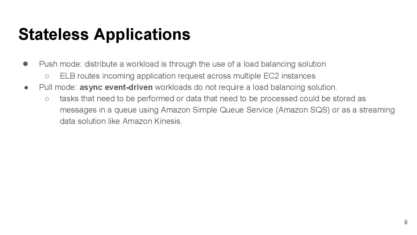 of a load balancing solution ◦ ELB routes incoming application request across multiple EC2 instances • Pull mode: async event-driven workloads do not require a load balancing solution. ◦ tasks that need to be performed or data that need to be processed could be stored as messages in a queue using Amazon Simple Queue Service (Amazon SQS) or as a streaming data solution like Amazon Kinesis. Stateless Applications 9