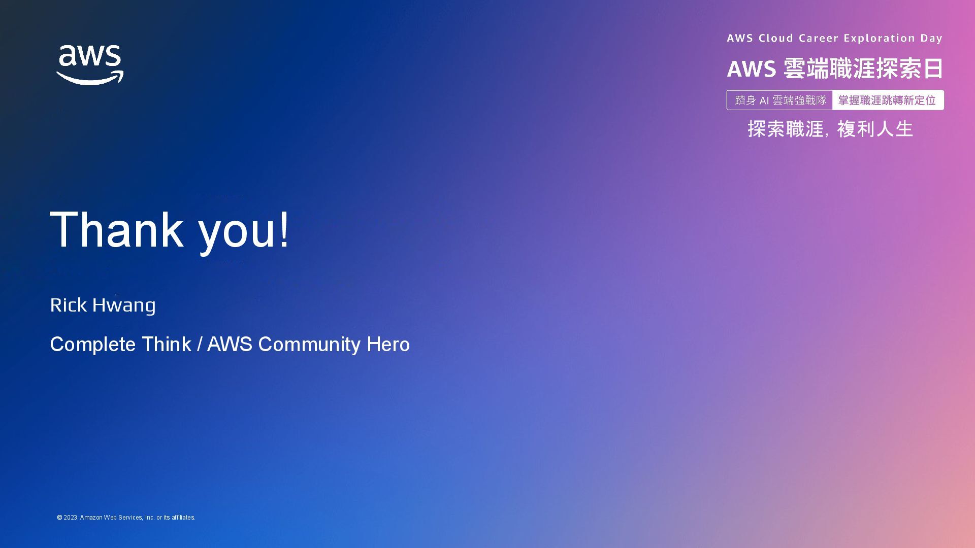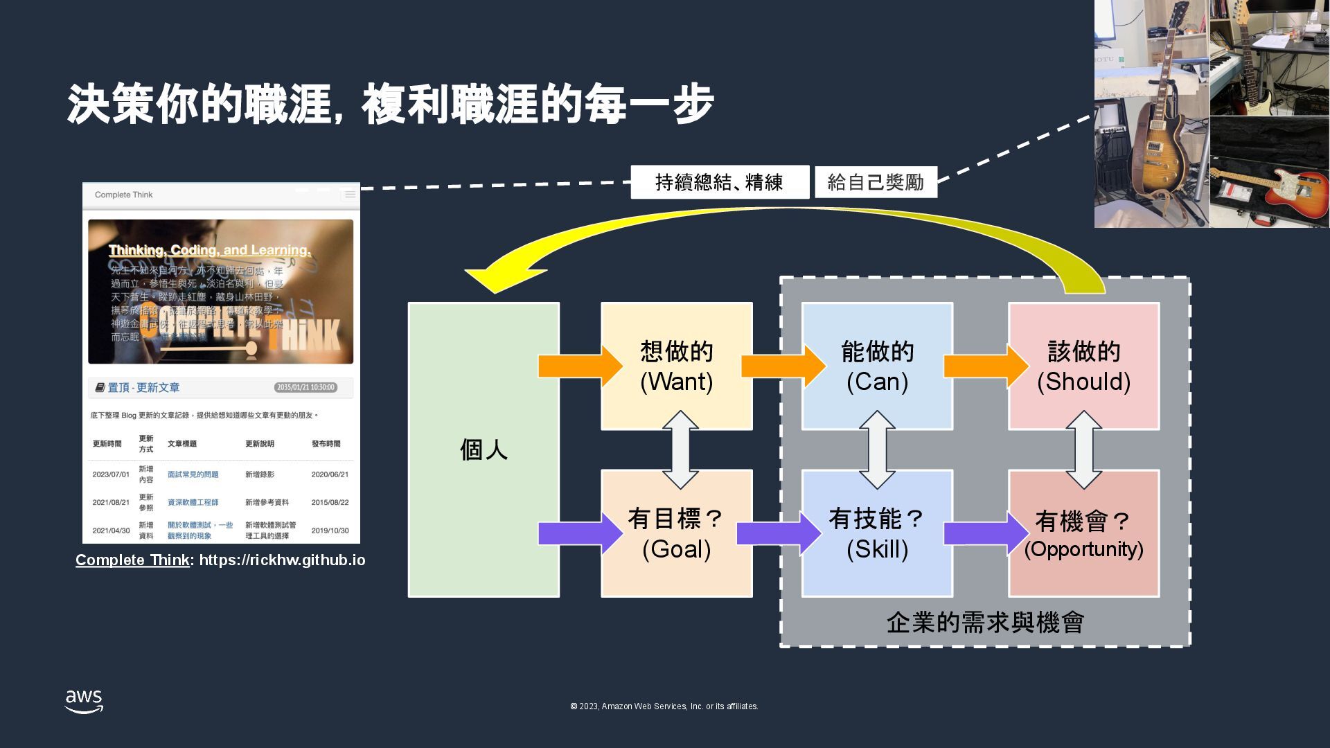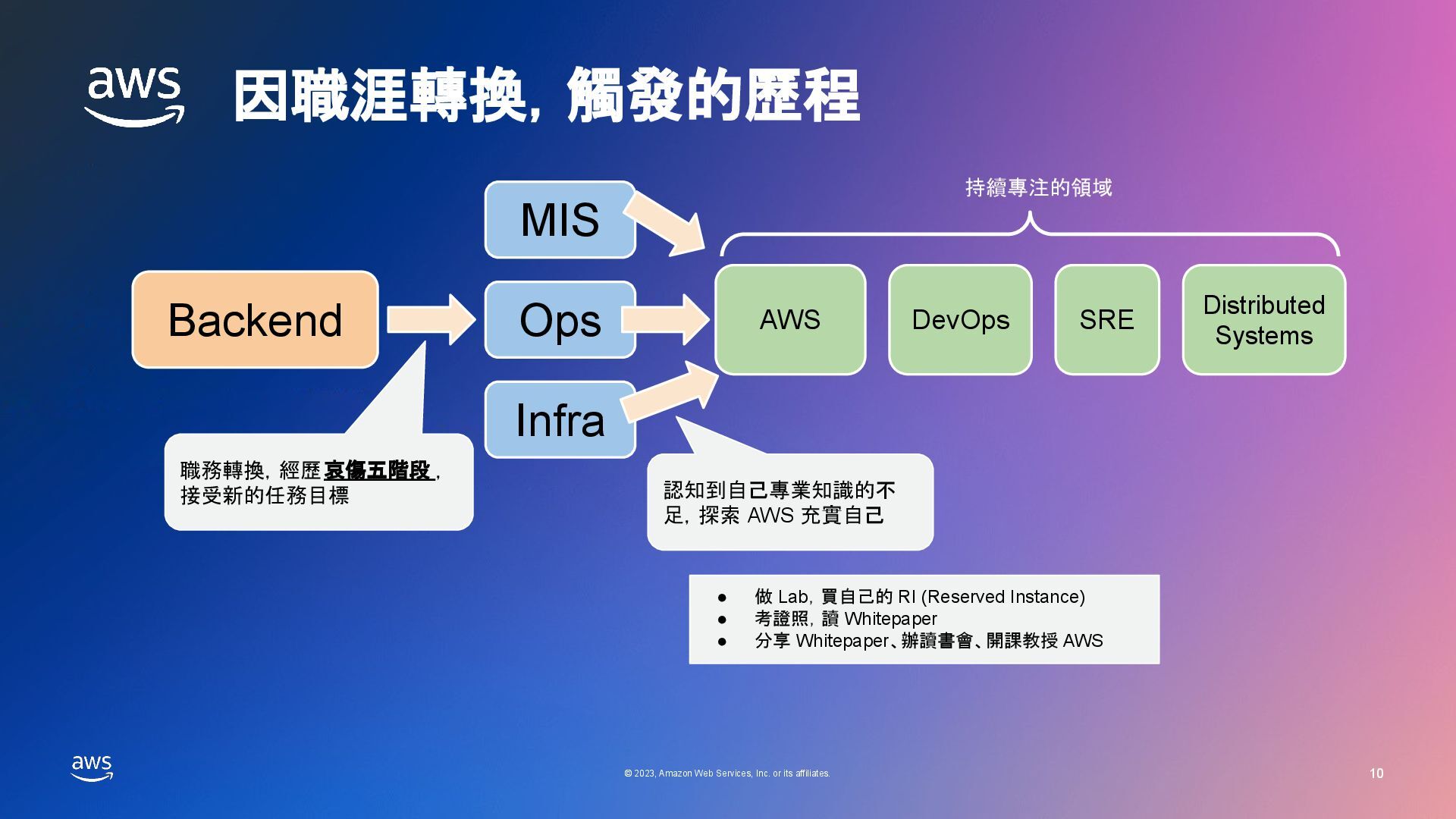 2023, Amazon Web Services, Inc. or its affiliates. 10 Backend Ops MIS Infra AWS DevOps SRE Distributed Systems 因職涯轉換,觸發的歷程 • 做 Lab,買自己的 RI (Reserved Instance) • 考證照,讀 Whitepaper • 分享 Whitepaper、辦讀書會、開課教授 AWS 持續專注的領域 認知到自己專業知識的不 足,探索 AWS 充實自己 職務轉換,經歷哀傷五階段 , 接受新的任務目標