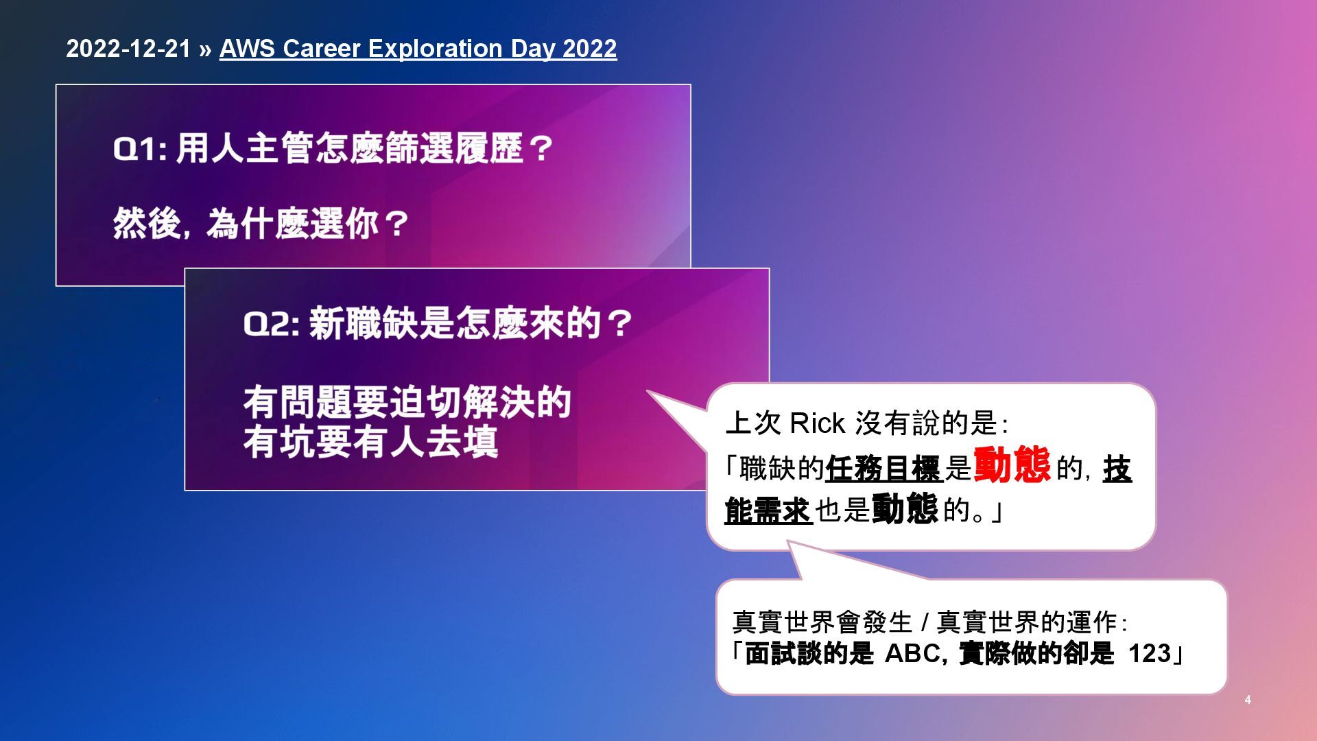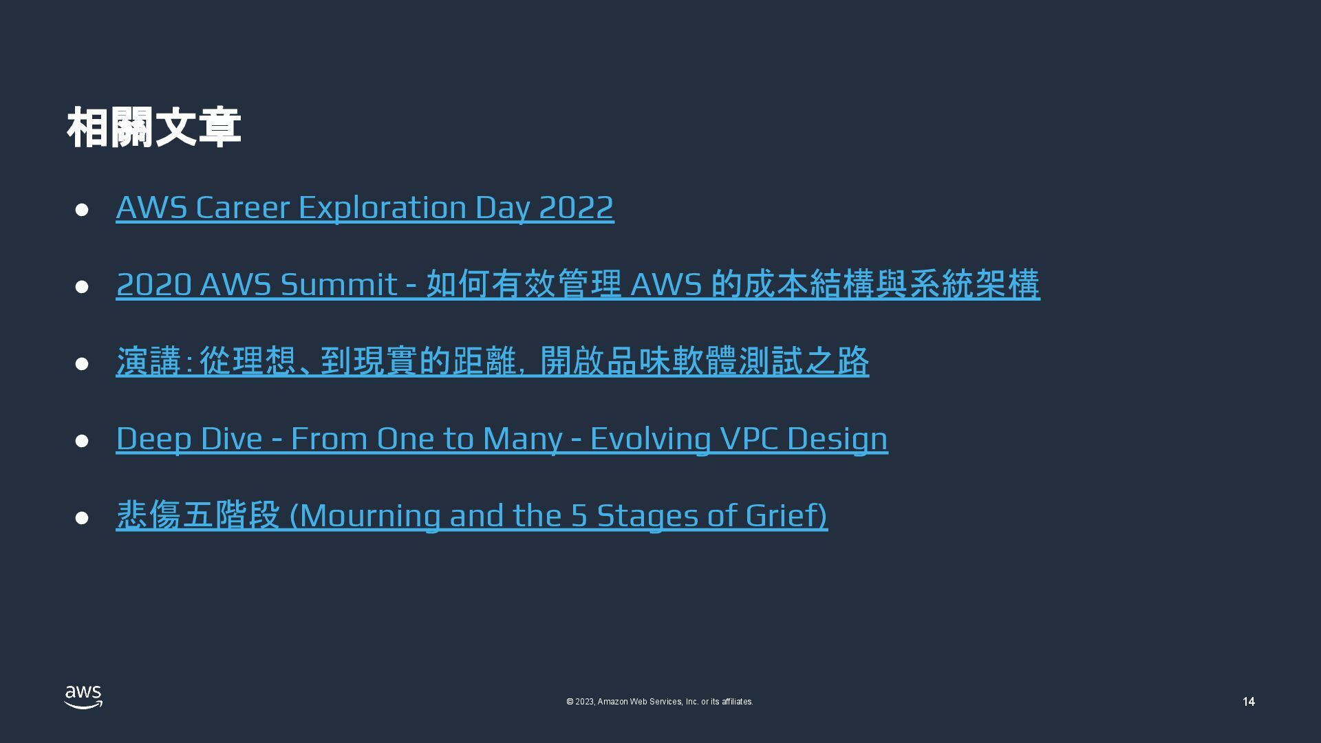 14 • AWS Career Exploration Day 2022 • 2020 AWS Summit - 如何有效管理 AWS 的成本結構與系統架構 • 演講:從理想、到現實的距離,開啟品味軟體測試之路 • Deep Dive - From One to Many - Evolving VPC Design • 悲傷五階段 (Mourning and the 5 Stages of Grief)