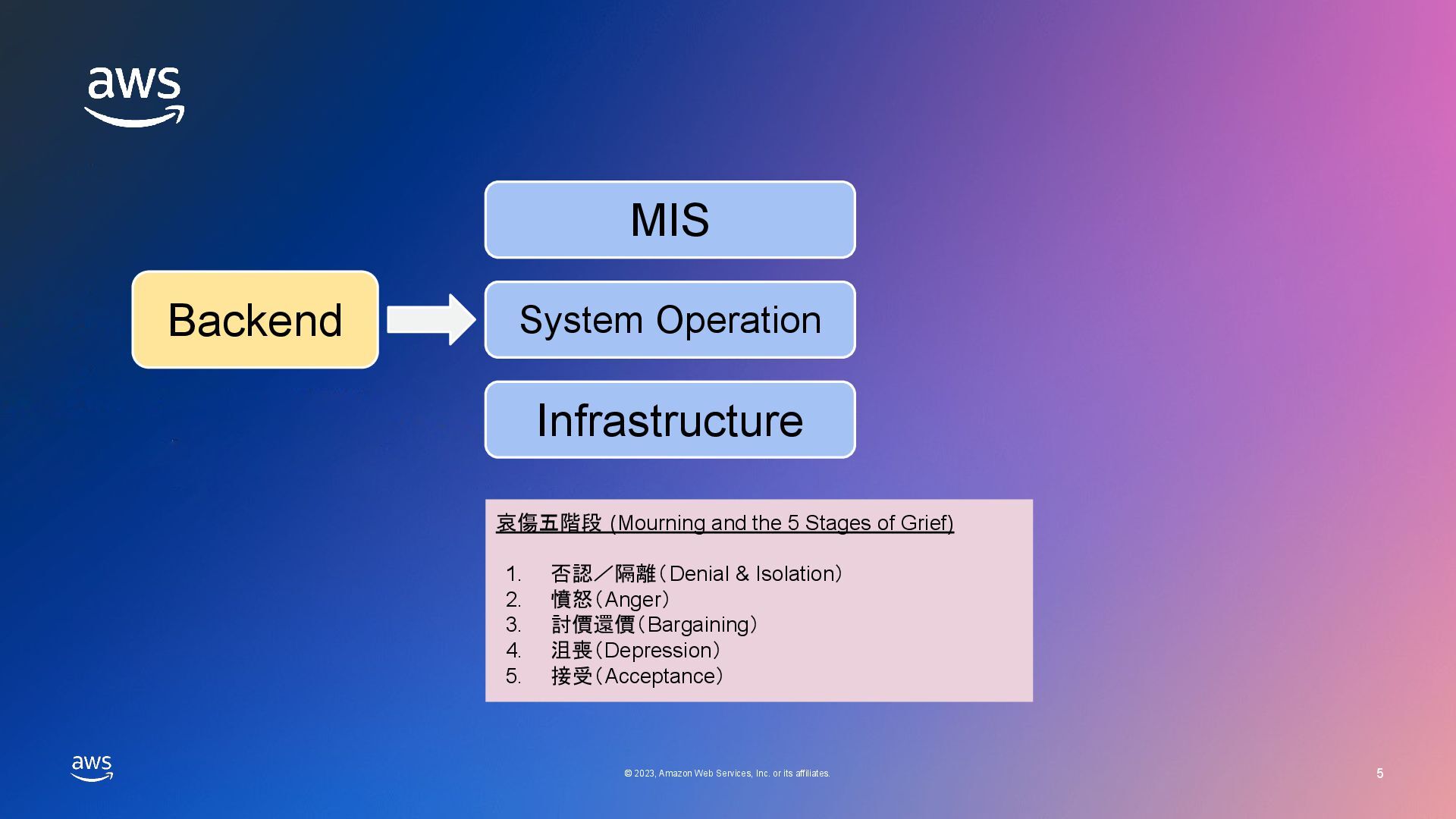 2023, Amazon Web Services, Inc. or its affiliates. 5 Backend System Operation MIS Infrastructure 哀傷五階段 (Mourning and the 5 Stages of Grief) 1. 否認/隔離(Denial & Isolation) 2. 憤怒(Anger) 3. 討價還價(Bargaining) 4. 沮喪(Depression) 5. 接受(Acceptance)