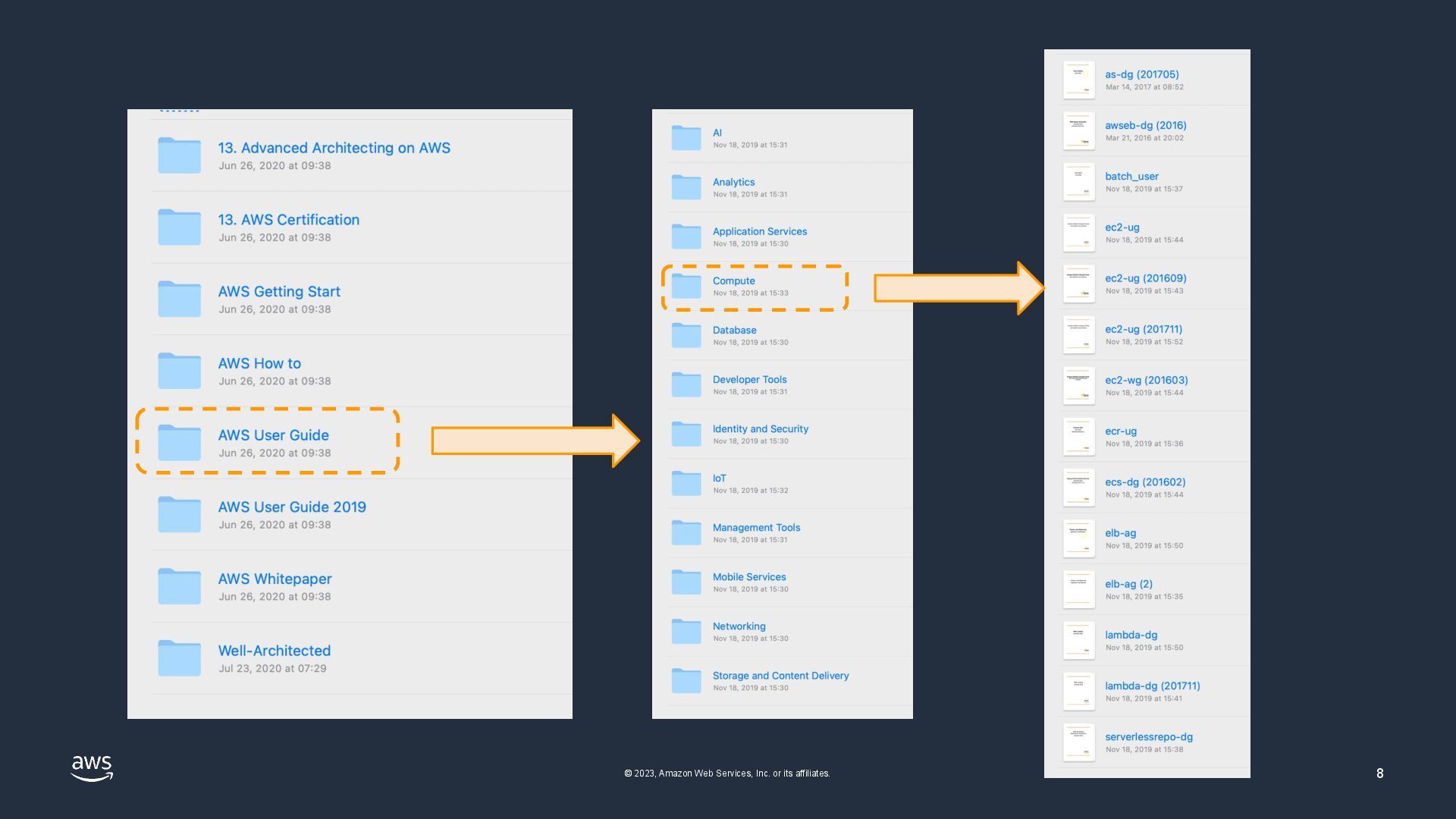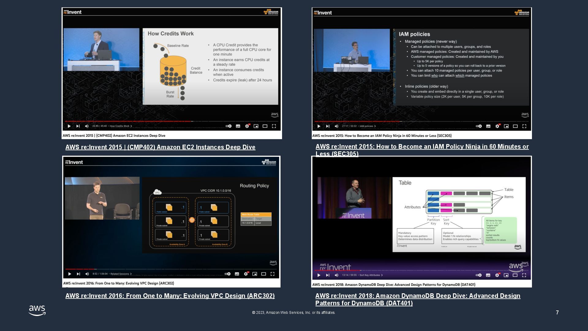 AWS re:Invent 2016: From One to Many: Evolving VPC Design (ARC302) AWS re:Invent 2015 | (CMP402) Amazon EC2 Instances Deep Dive AWS re:Invent 2018: Amazon DynamoDB Deep Dive: Advanced Design Patterns for DynamoDB (DAT401) AWS re:Invent 2015: How to Become an IAM Policy Ninja in 60 Minutes or Less (SEC305)