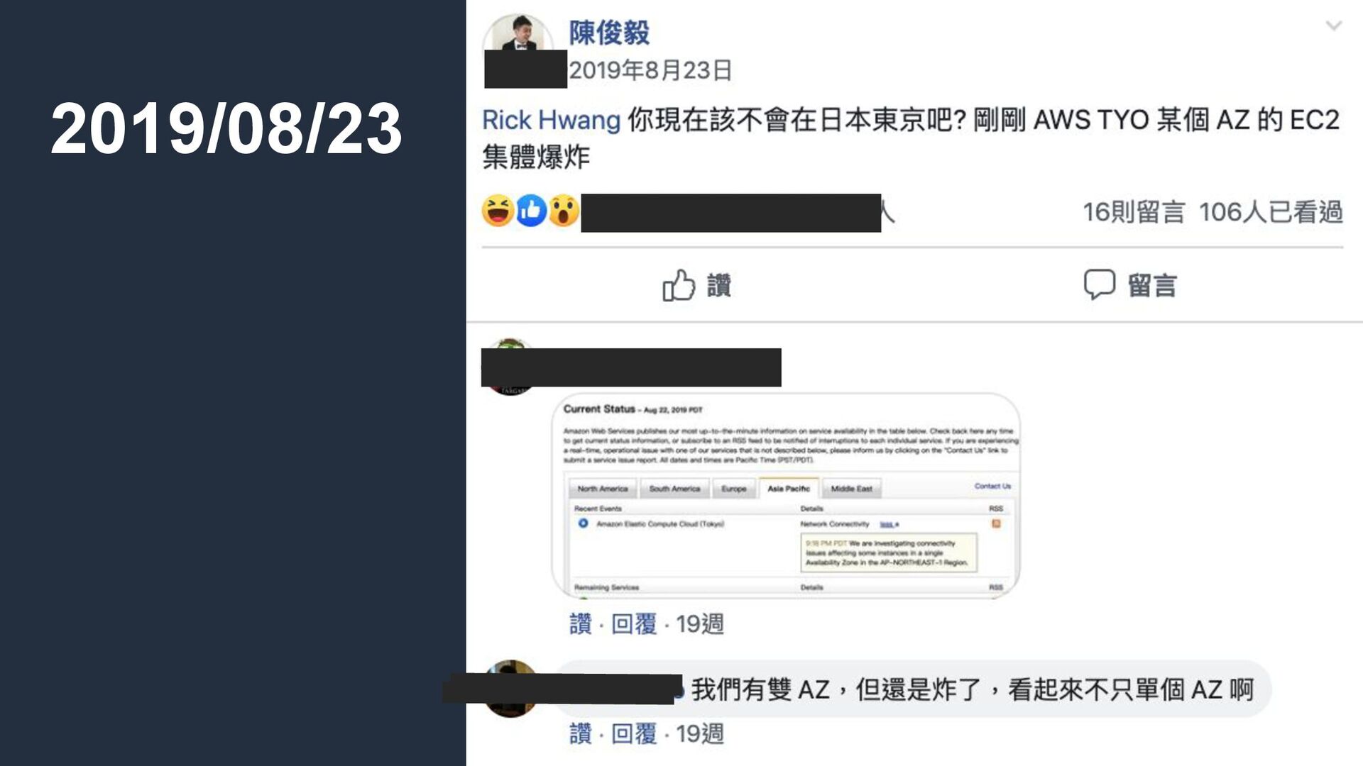 Cloudflare outage caused by bad software deploy 07/29 Issues with messages sending and slow performance 08/23 Summary of the Amazon EC2 and Amazon EBS Service Event in the Tokyo Region 09/04 虛擬主機供應商捕夢網驚傳磁碟陣列故障,造成用戶網站服務中斷 10/31 Google Compute Engine Incident #19008 7