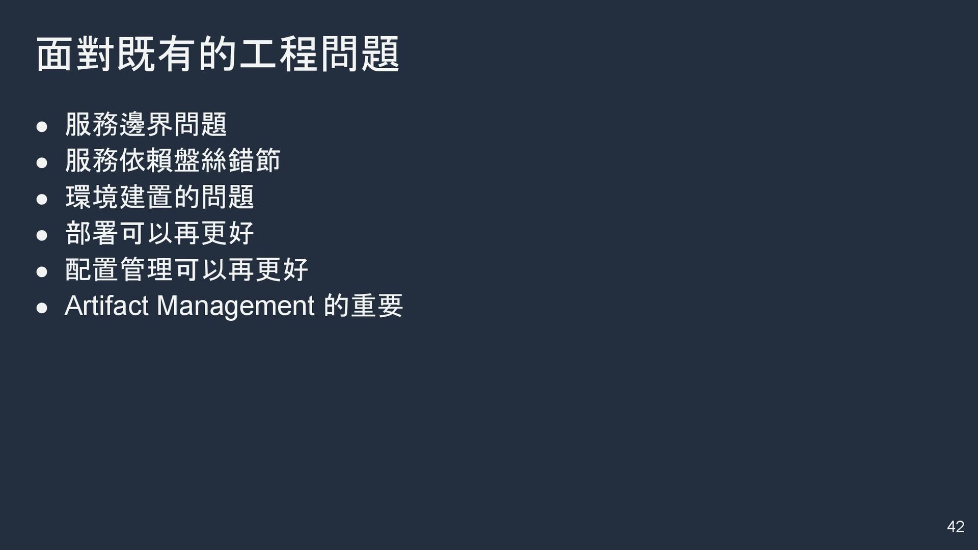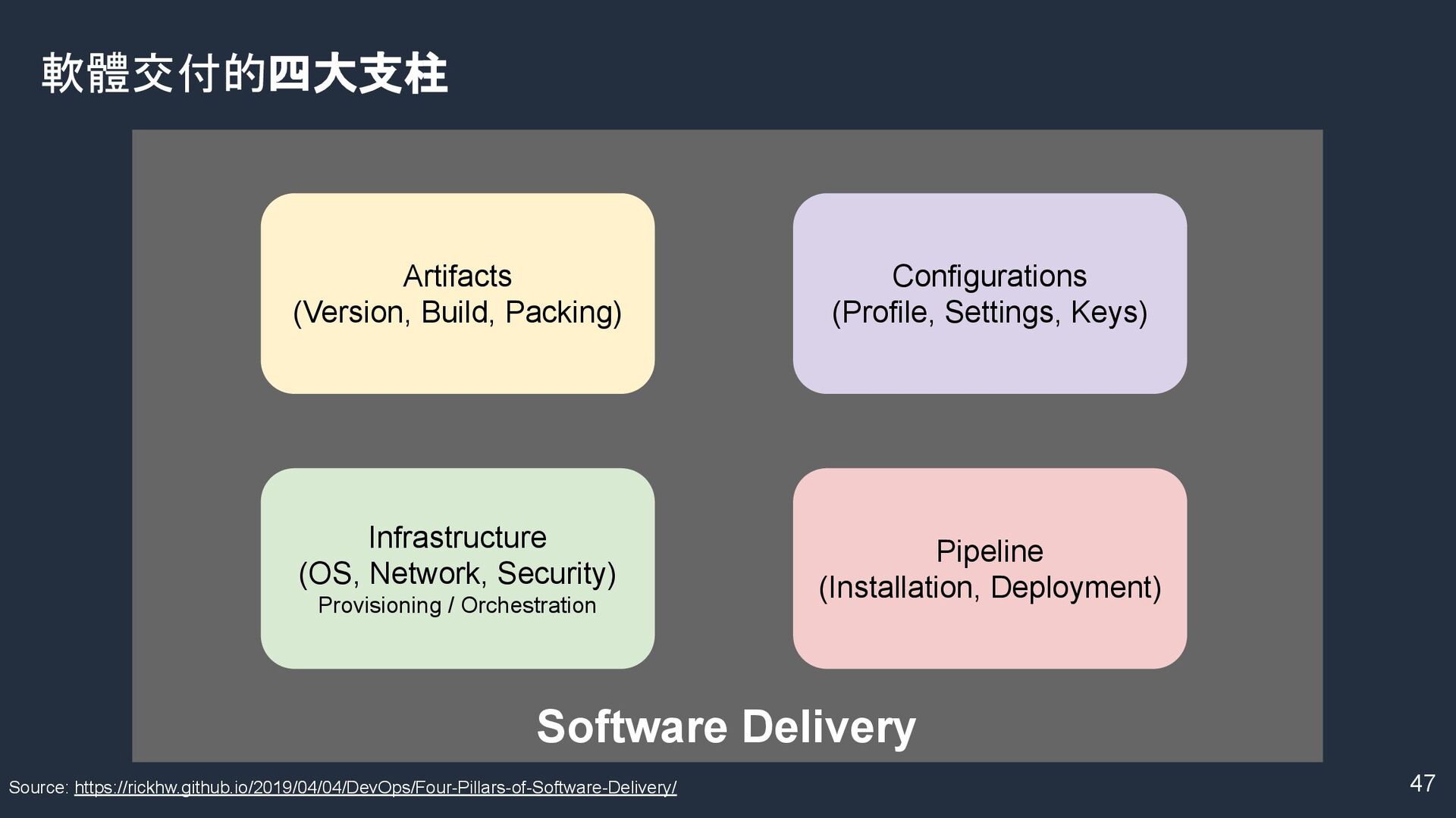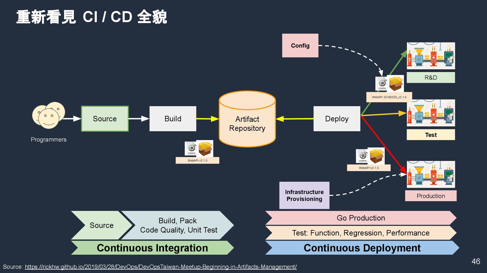 Production Test R&D Deploy WebAPI v2.1.0 WebAPI v2.1.0 Test: Function, Regression, Performance Go Production Build, Pack Code Quality, Unit Test Source WebAPI 20190323_v2.1.0 重新看見 CI / CD 全貌 Config Infrastructure Provisioning Source: https://rickhw.github.io/2019/03/28/DevOps/DevOpsTaiwan-Meetup-Beginning-in-Artifacts-Management/