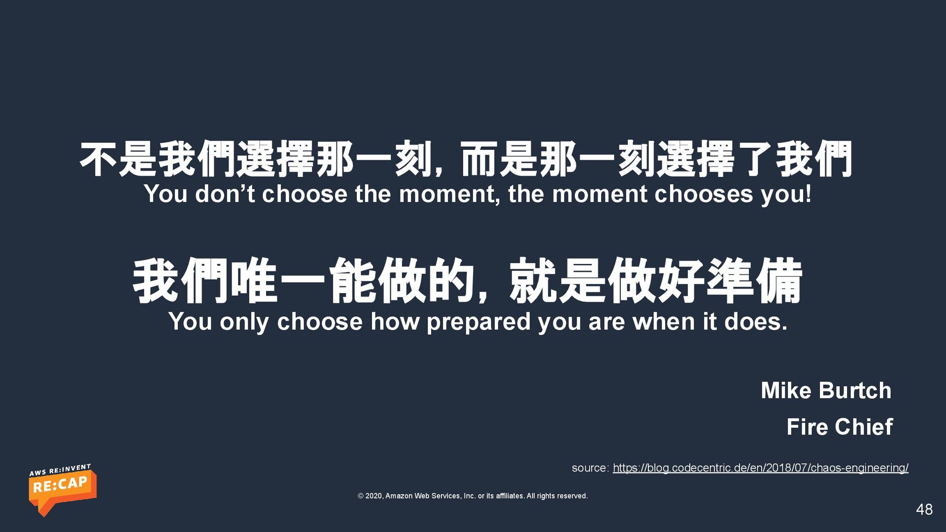 rights reserved. 不是我們選擇那一刻,而是那一刻選擇了我們 You don’t choose the moment, the moment chooses you! 我們唯一能做的,就是做好準備 You only choose how prepared you are when it does. Mike Burtch Fire Chief source: https://blog.codecentric.de/en/2018/07/chaos-engineering/ 48