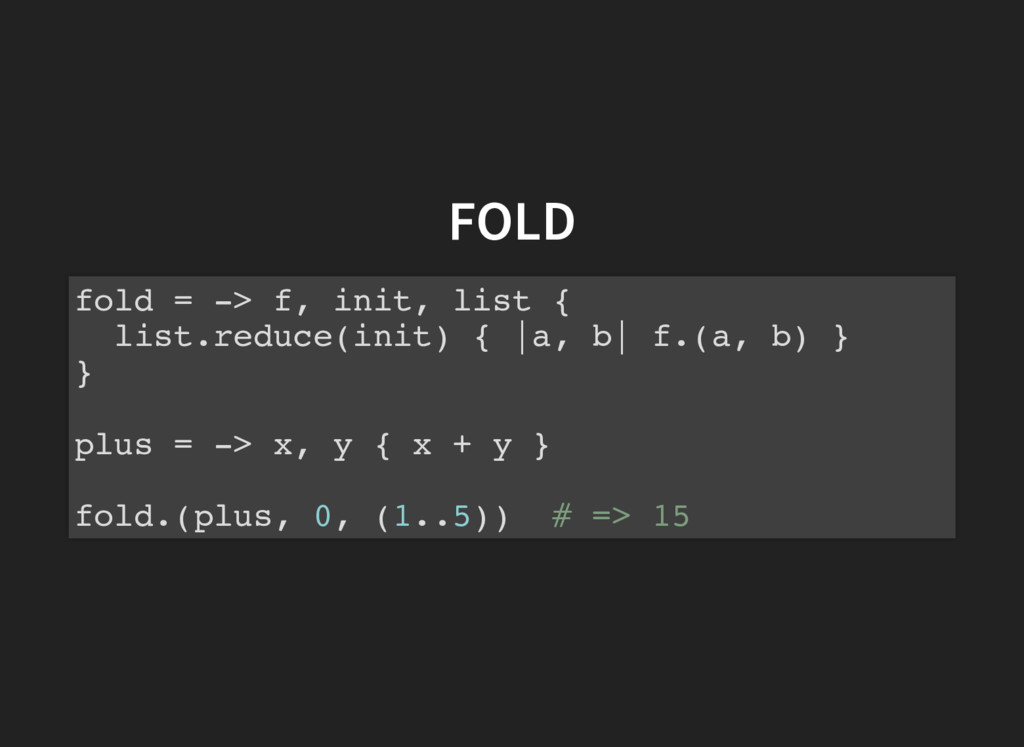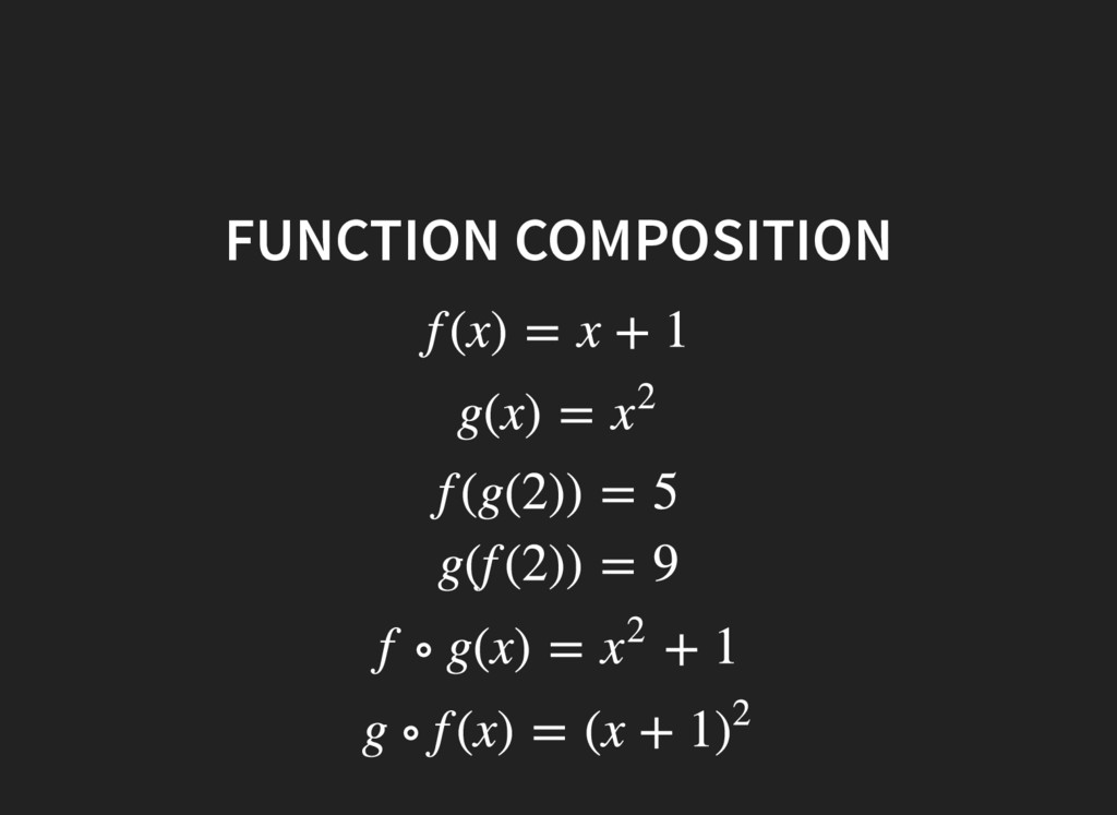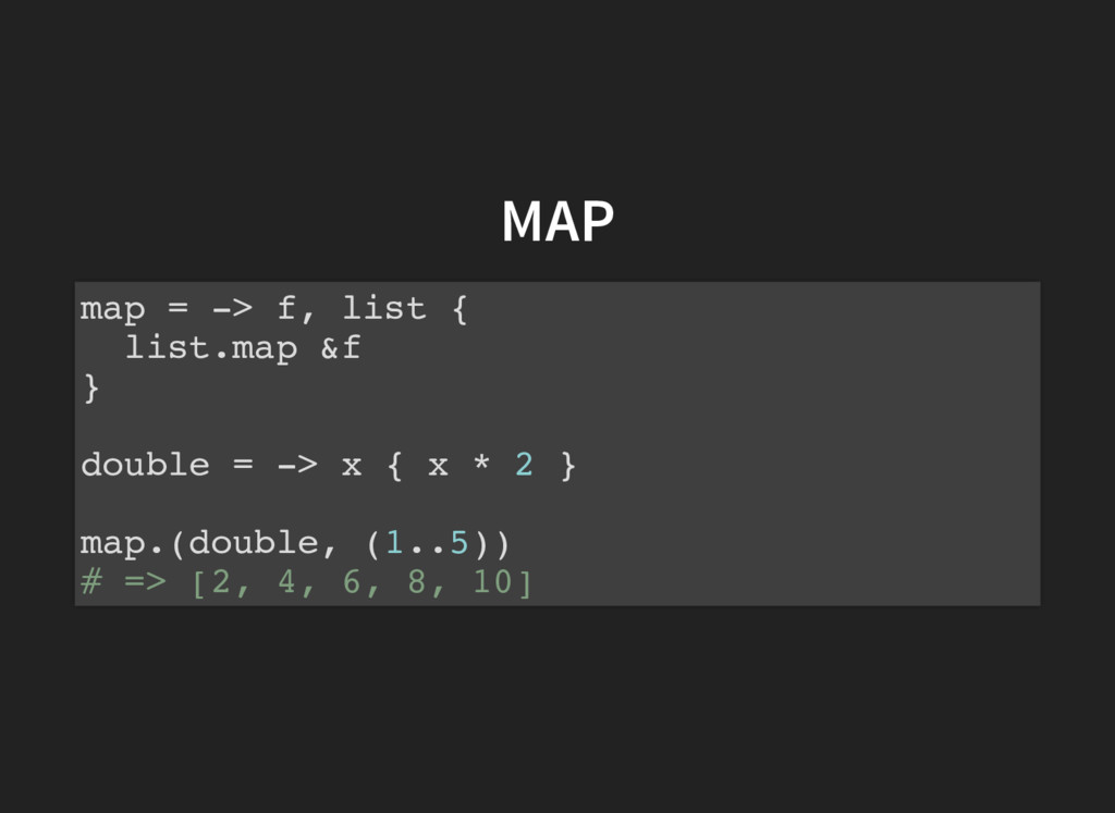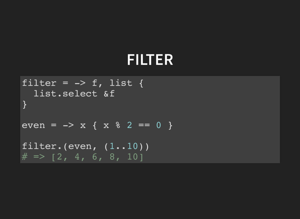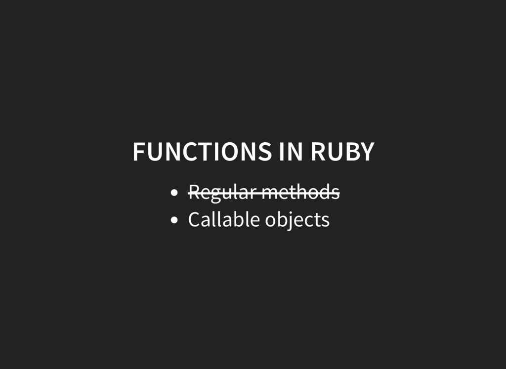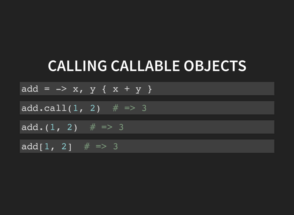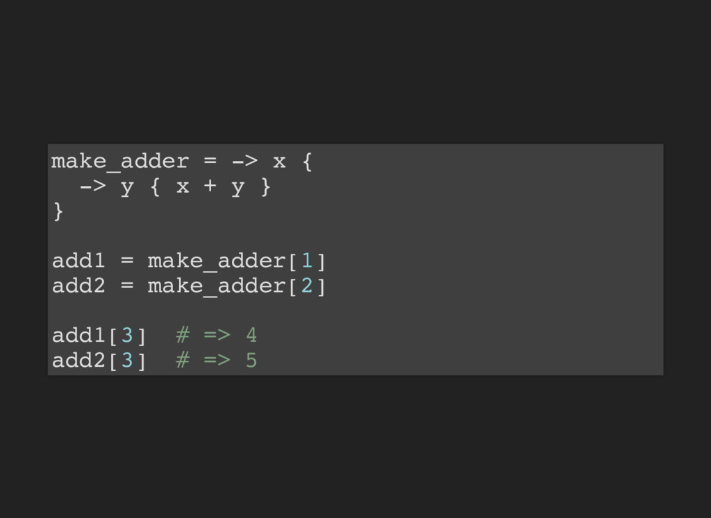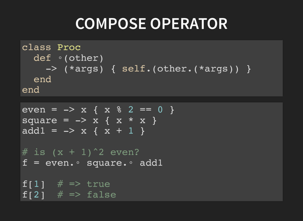 } end end even = -> x { x % 2 == 0 } square = -> x { x * x } add1 = -> x { x + 1 } # is (x + 1)^2 even? f = even.◦ square.◦ add1 f[1] # => true f[2] # => false