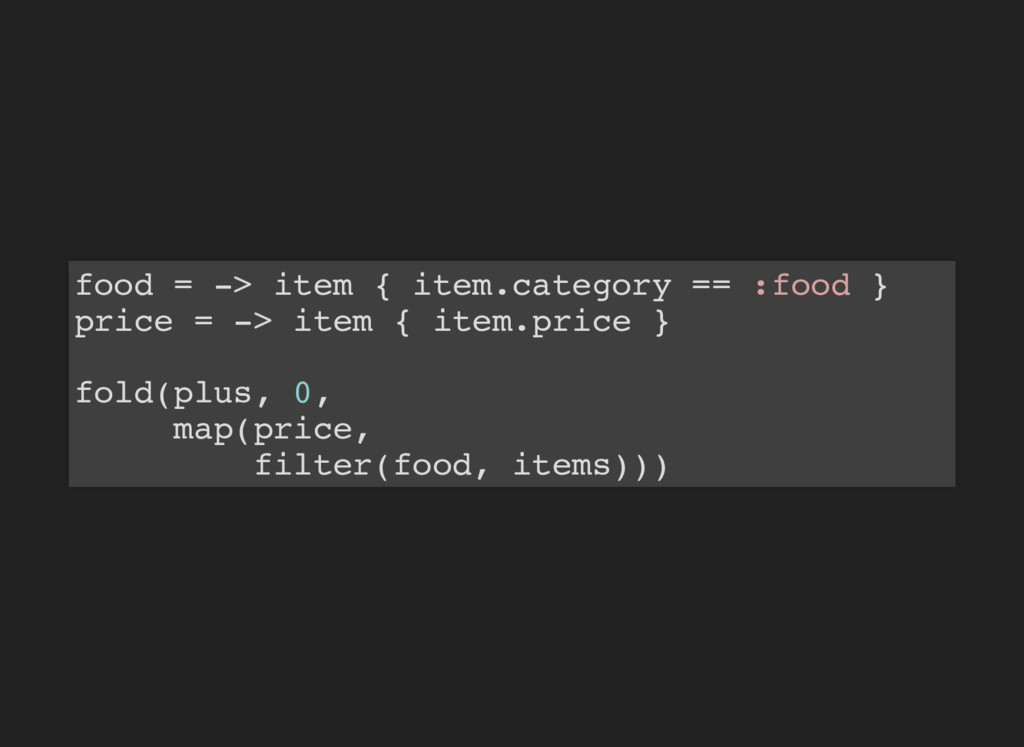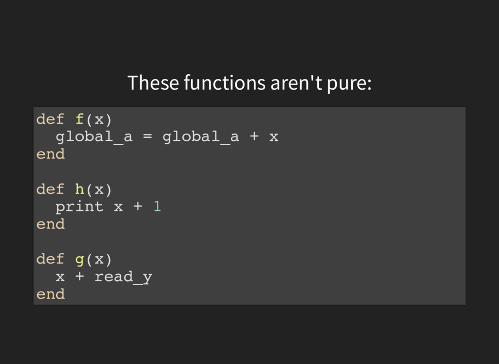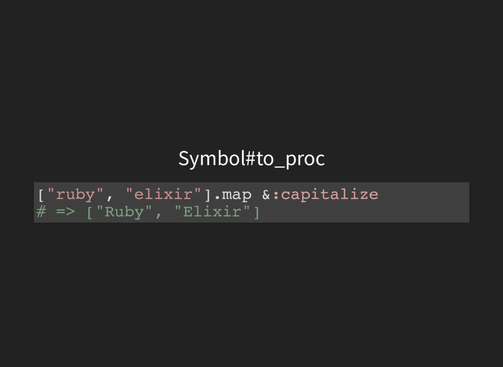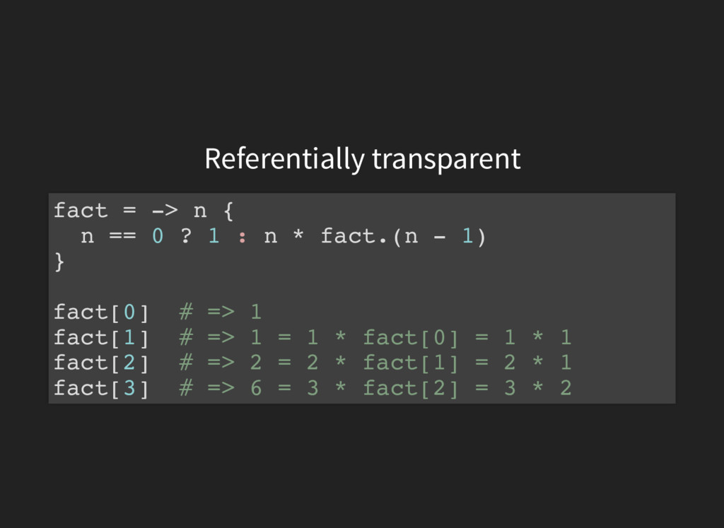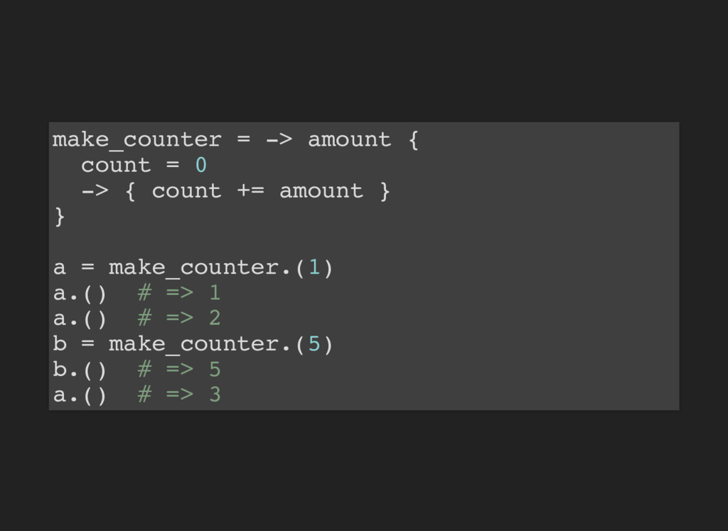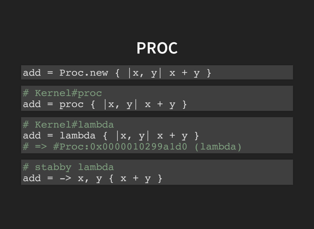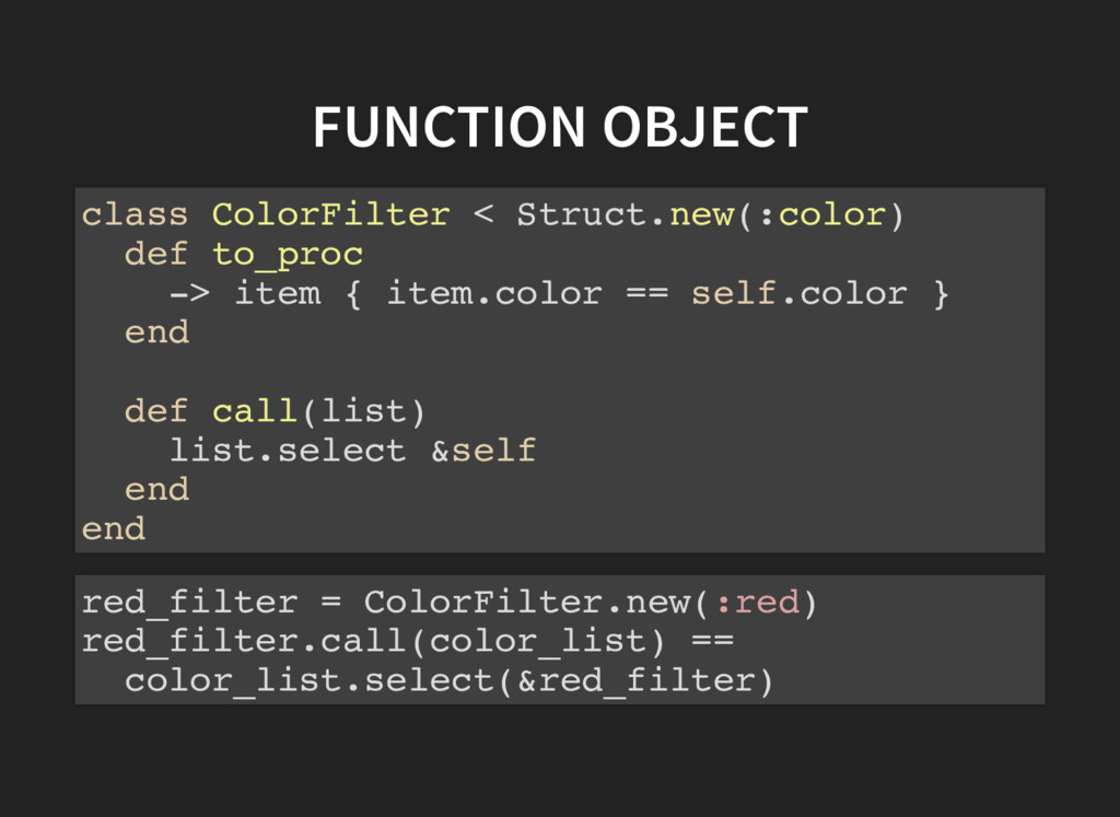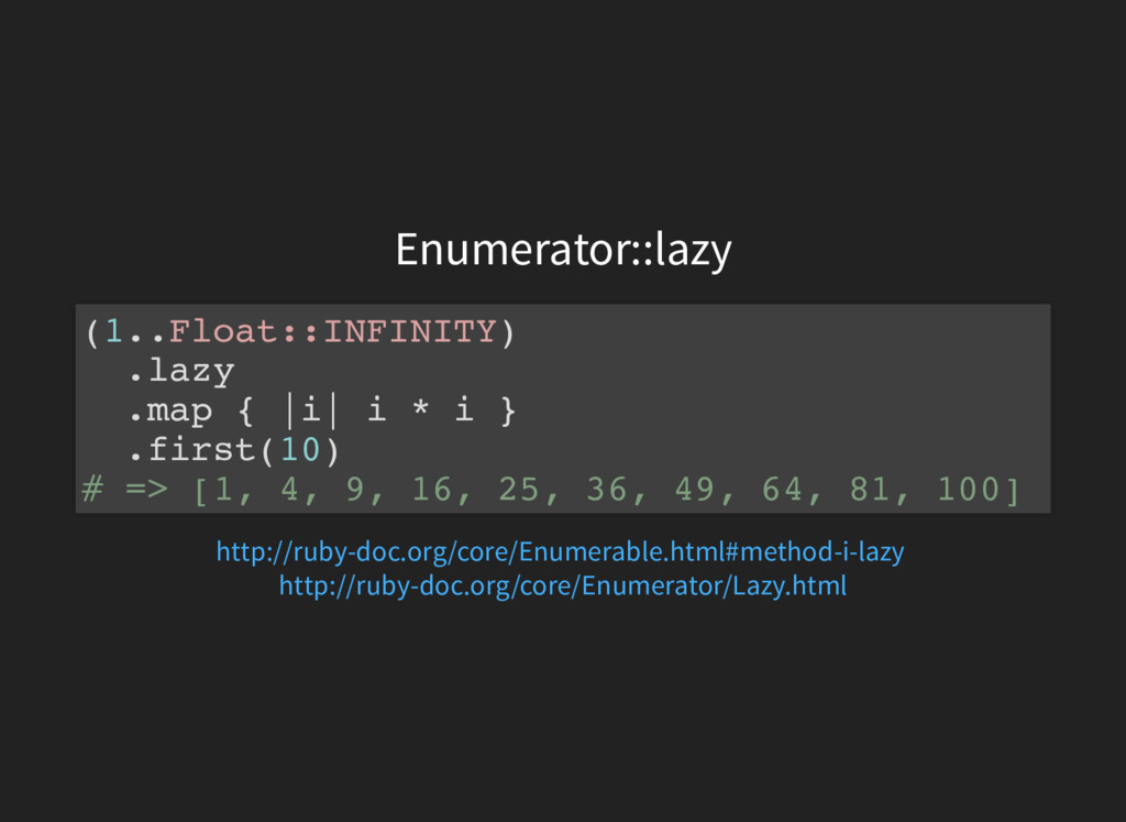 } end end even = -> x { x % 2 == 0 } square = -> x { x * x } add1 = -> x { x + 1 } # is (x + 1)^2 even? f = even.◦ square.◦ add1 f[1] # => true f[2] # => false