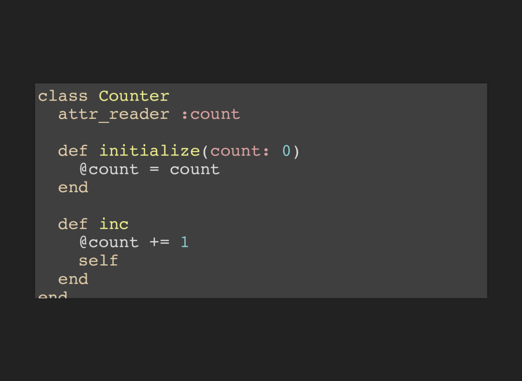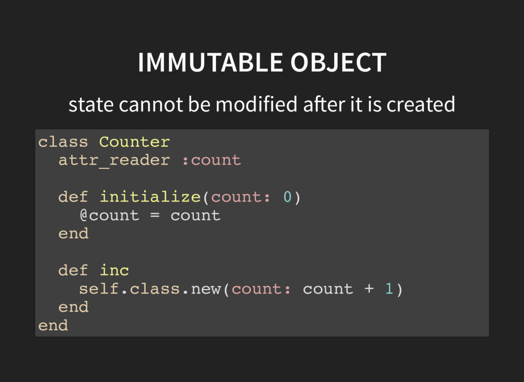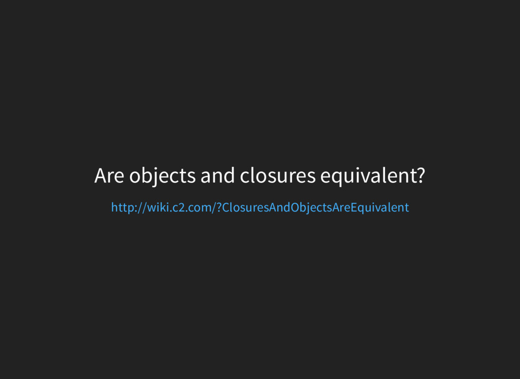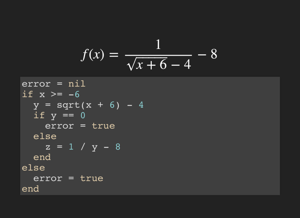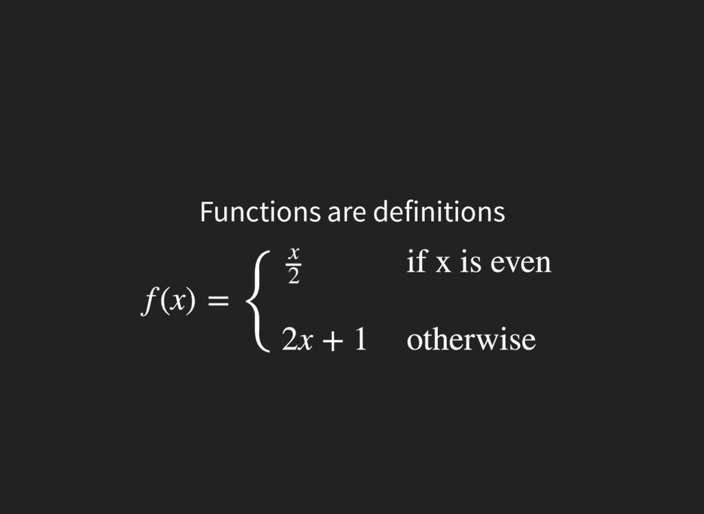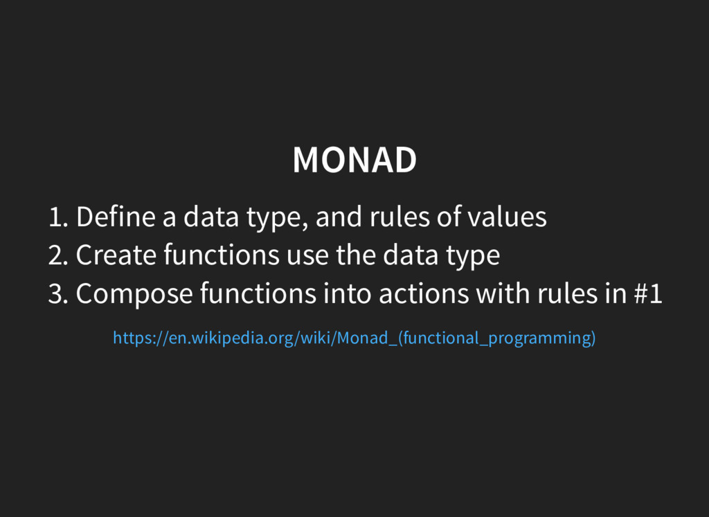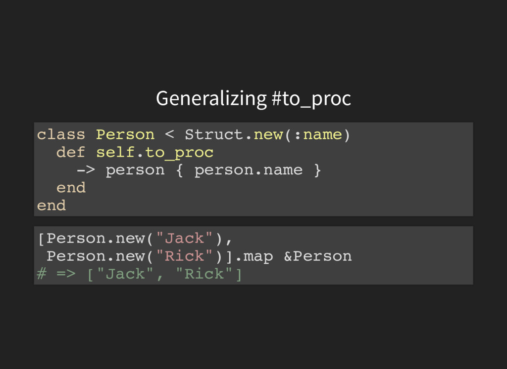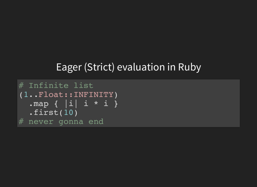 } end end even = -> x { x % 2 == 0 } square = -> x { x * x } add1 = -> x { x + 1 } # is (x + 1)^2 even? f = even.◦ square.◦ add1 f[1] # => true f[2] # => false