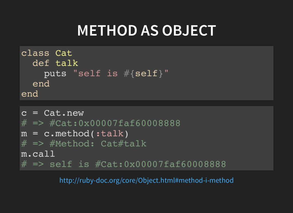 #{self}" end end c = Cat.new # => #Cat:0x00007faf60008888 m = c.method(:talk) # => #Method: Cat#talk m.call # => self is #Cat:0x00007faf60008888 http://ruby-doc.org/core/Object.html#method-i-method