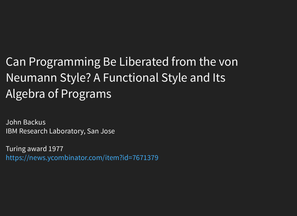 Functional Style and Its Algebra of Programs John Backus IBM Research Laboratory, San Jose Turing award 1977 https://news.ycombinator.com/item?id=7671379
