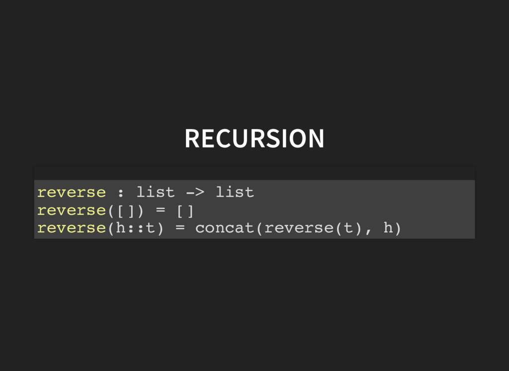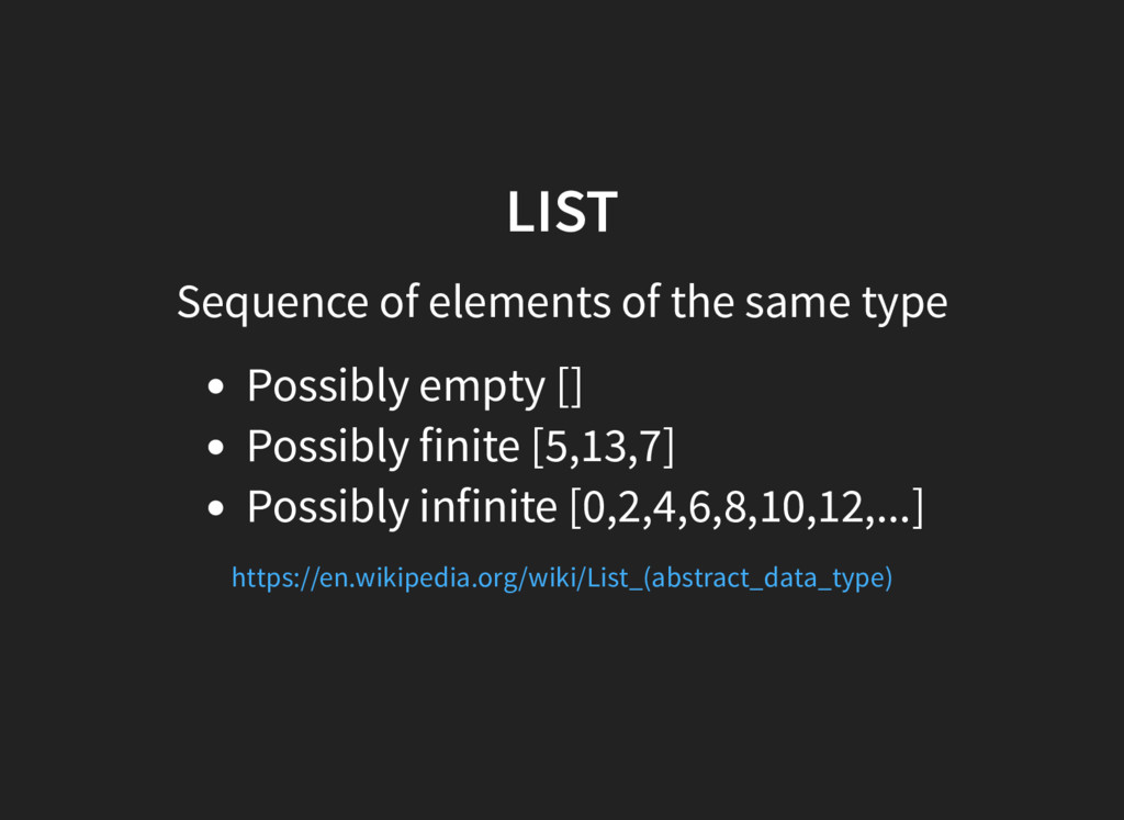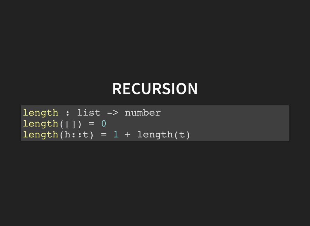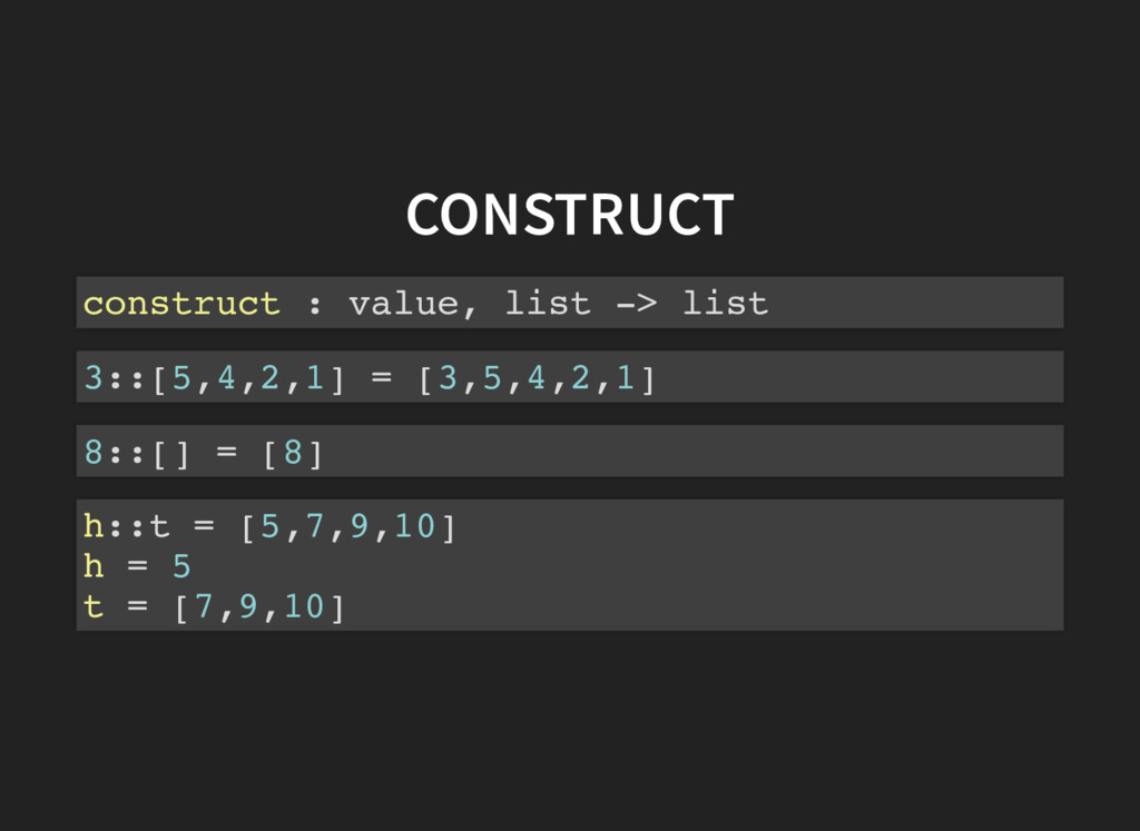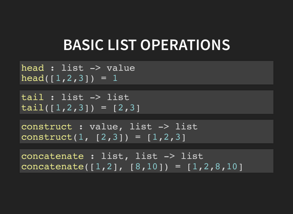 1 tail : list -> list tail([1,2,3]) = [2,3] construct : value, list -> list construct(1, [2,3]) = [1,2,3] concatenate : list, list -> list concatenate([1,2], [8,10]) = [1,2,8,10]