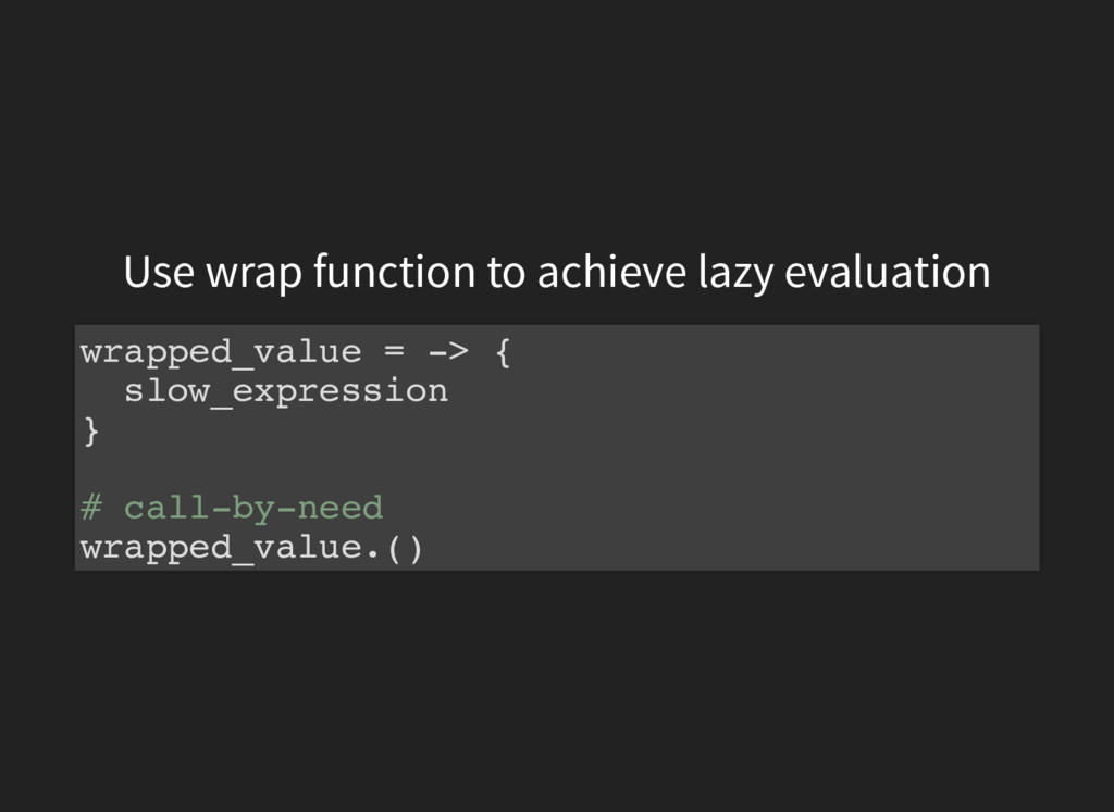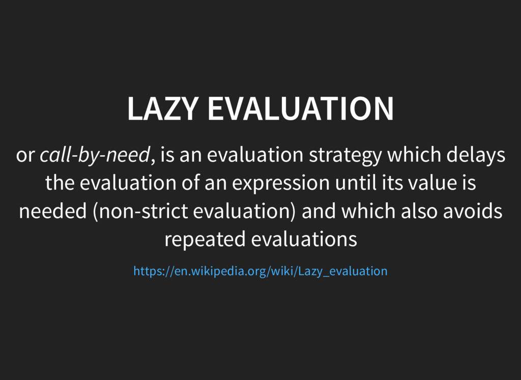 the evaluation of an expression until its value is needed (non-strict evaluation) and which also avoids repeated evaluations https://en.wikipedia.org/wiki/Lazy_evaluation