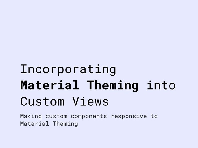 Custom Views can (and should) feel at home amongst the core components of Material Design. This presentation covers approaches to making Views responsive to Material Theming. With the aid of a practical example, this includes an intro to the capabilities of the Material Theming and MDC-Android, basic theme/style attribute support in Custom Views and a deep dive into key MDC-Android classes such as MaterialShapeDrawable, RippleUtils, ElevationOverlayProvider and more.