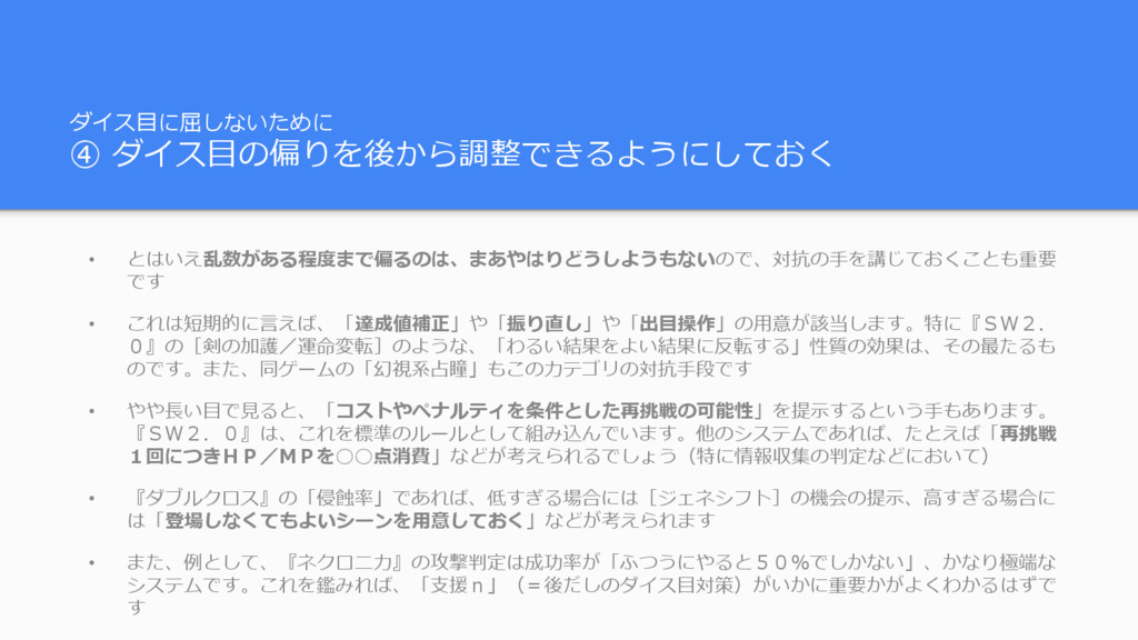 ダイス目に屈しないために ④ ダイス目の偏りを後から調整できるようにしておく • とはいえ乱数がある程度まで偏るのは、まあやはりどうしようもないので、対抗の手を講じておくことも重要 です • これは短期的に言えば、「達成値補正」や「振り直し」や「出目操作」の用意が該当します。特に『SW2. 0』の[剣の加護/運命変転]のような、「わるい結果をよい結果に反転する」性質の効果は、その最たるも のです。また、同ゲームの「幻視系占瞳」もこのカテゴリの対抗手段です