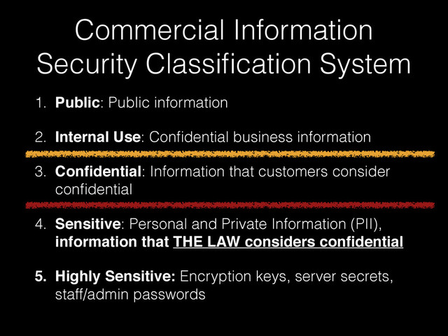 You may be familiar with information classification in the military, you hear about secret or top secret information. In a commercial application, such as yours there are other categories of information. The five categories are Public, Internal Use, Confidential, Sensitive, and Highly Sensitive. Most business information is Internal Use, most customer data is Confidential, except that checking account numbers and payment data and drivers license details are Sensitive. Encryption keys and staff passwords are Highly Sensitive.