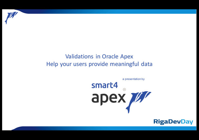 founding member (2010) • Oracle since 2002 (Oracle 8i) • PL/SQL, Apex, HTML(5), CSS(3), JavaScript, XML, XSLT • Special interest in UI • Trainer at skillbuilders.com • RIMA on Oracle Forums @rhjmartens richardmartens.blogspot.nl Richard Martens