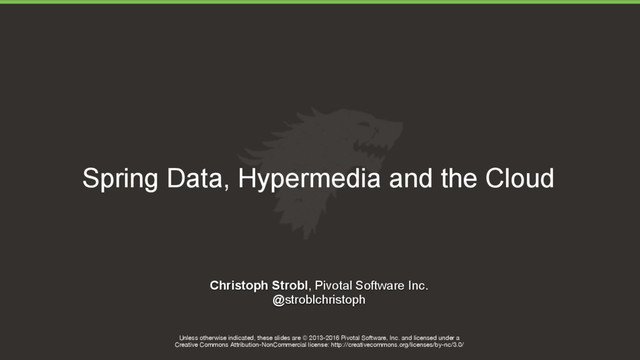 Inc. and licensed under a Creative Commons Attribution-NonCommercial license: http://creativecommons.org/licenses/by-nc/3.0/ Spring Data REST 16 @SpringBootApplication public class StoreApp { ! public static void main(String[] args) { SpringApplication.run(StoreApp.class, args); } ! interface StoreRepository extends PagingAndSortingRepository<Store, String> { ! ! } } Page<Store> findByAddressLocationNear(Point location, Distance distance, Pageable pageable); @RestResource(rel = "by-location") <groupId>org.springframework.boot</groupId> <artifactId>spring-boot-starter-data-rest</artifactId>