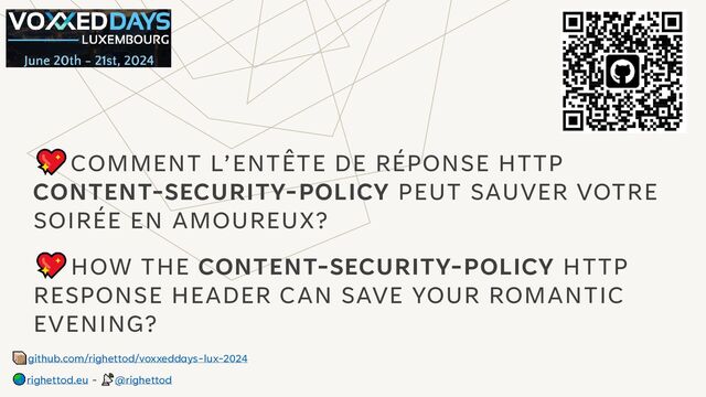 the CISO/PO: 1. The effective CSP you created, with the help, of your team! 2. The little update needed: One line in a single JS file! • You sent the status mail with all technical details, packed your stuff and leave to prepare for your romantic evening. 03:45 P.M.