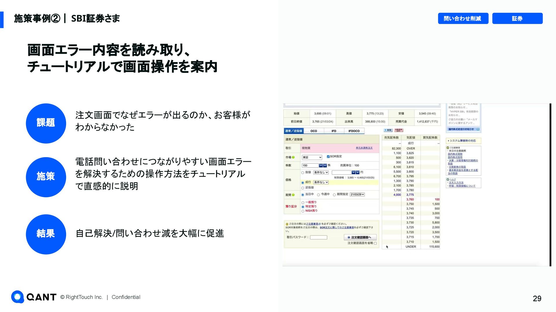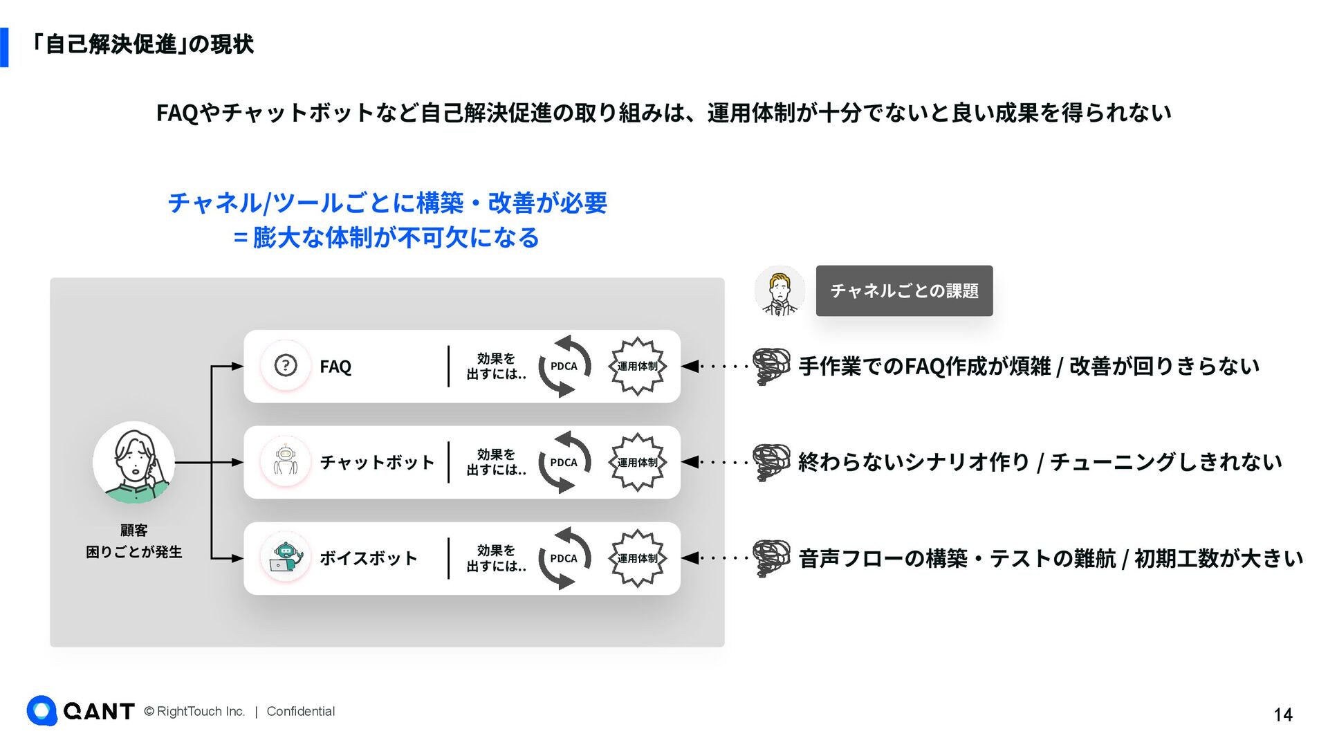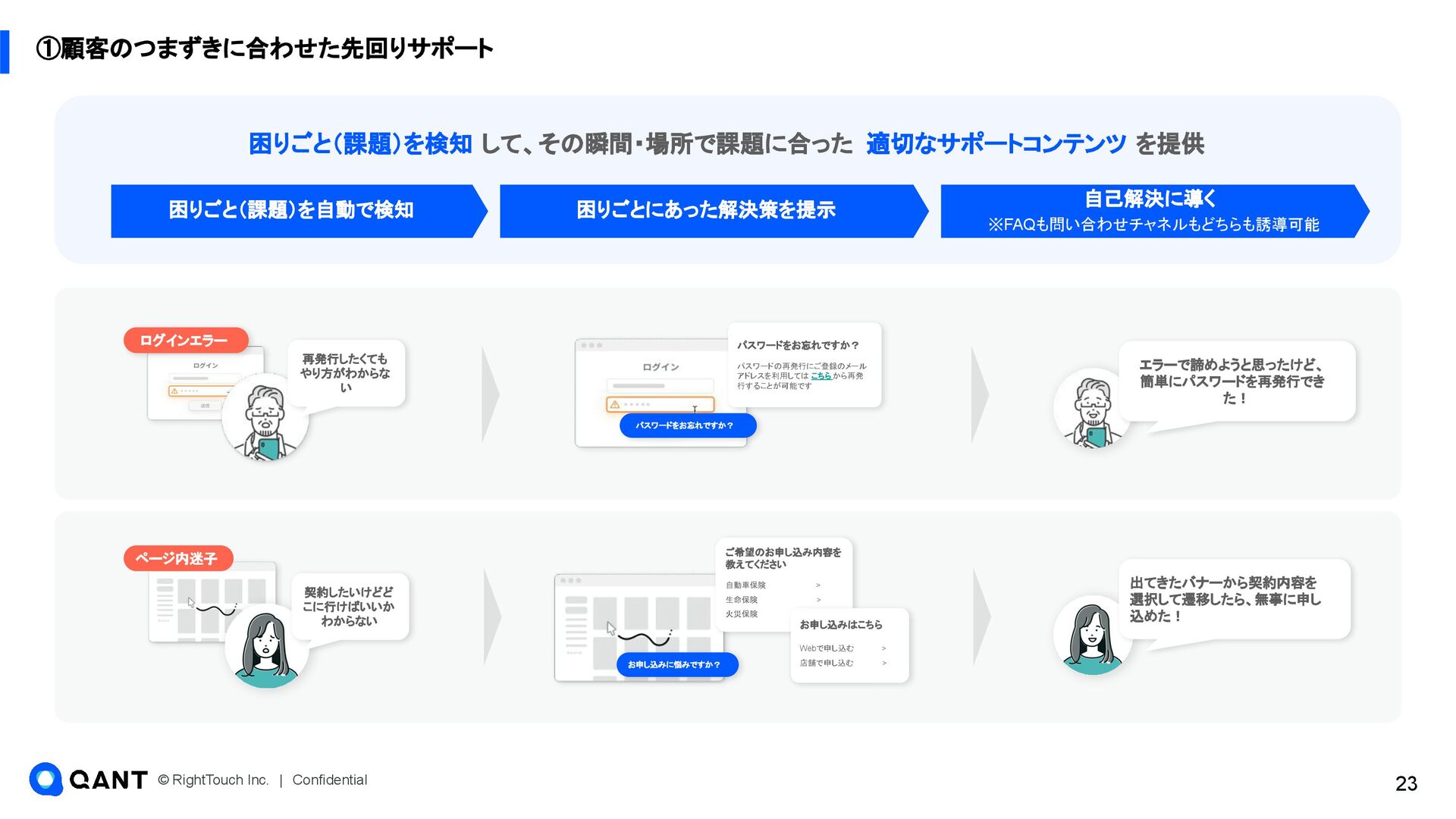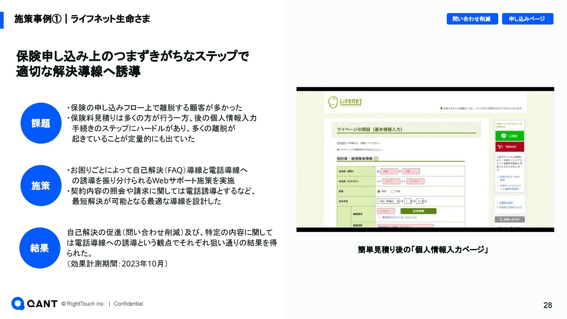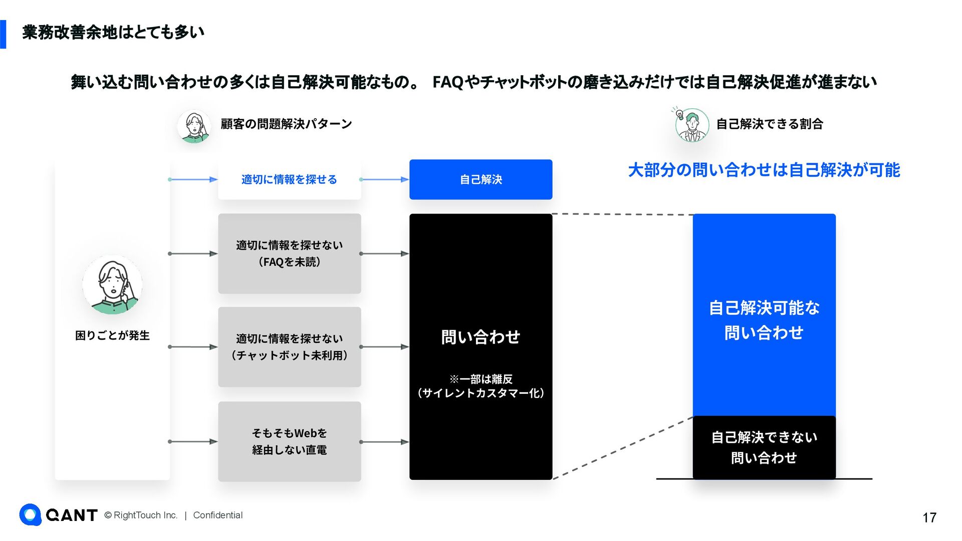 元記事: https://cxclip.karte.io/friends/story/rt_au_jibun_bank/ https://newspicks.com/news/10834345/body/ • 従来型のChatbotやFAQだと、⾃⼰解決促進が進まなかった • スムーズに問題解決できるようなサポートチャネルの設計、それによる⾃⼰解決の促進 👏 RightSupport導入後の成 果 • 喫緊課題だったフィッシング被害への対応施策、サポートページ上で問 題に適した答えへ振り分ける施策等で問い合わせ数を⼤きく削減 (⽉間約27,000件の問い合わせのうち約4,000件の⾃⼰解決を創出) • ⾃⼰解決の促進により、これまでに約7700万円の⼈件費削減に成功 ✅ QANT Web導入の決め手 顧客の困りごと特定‧困りごとに合ったサポート施策が出せる両機能をまとめて使えること Webに詳しくないメンバーでもデータから課題仮説を⽴て、施策をスピーディに出せる 社会的なインフラの役割を持つ銀⾏でも活⽤できる情報管理要件を満たしている 🔍 導入前の背景・課題