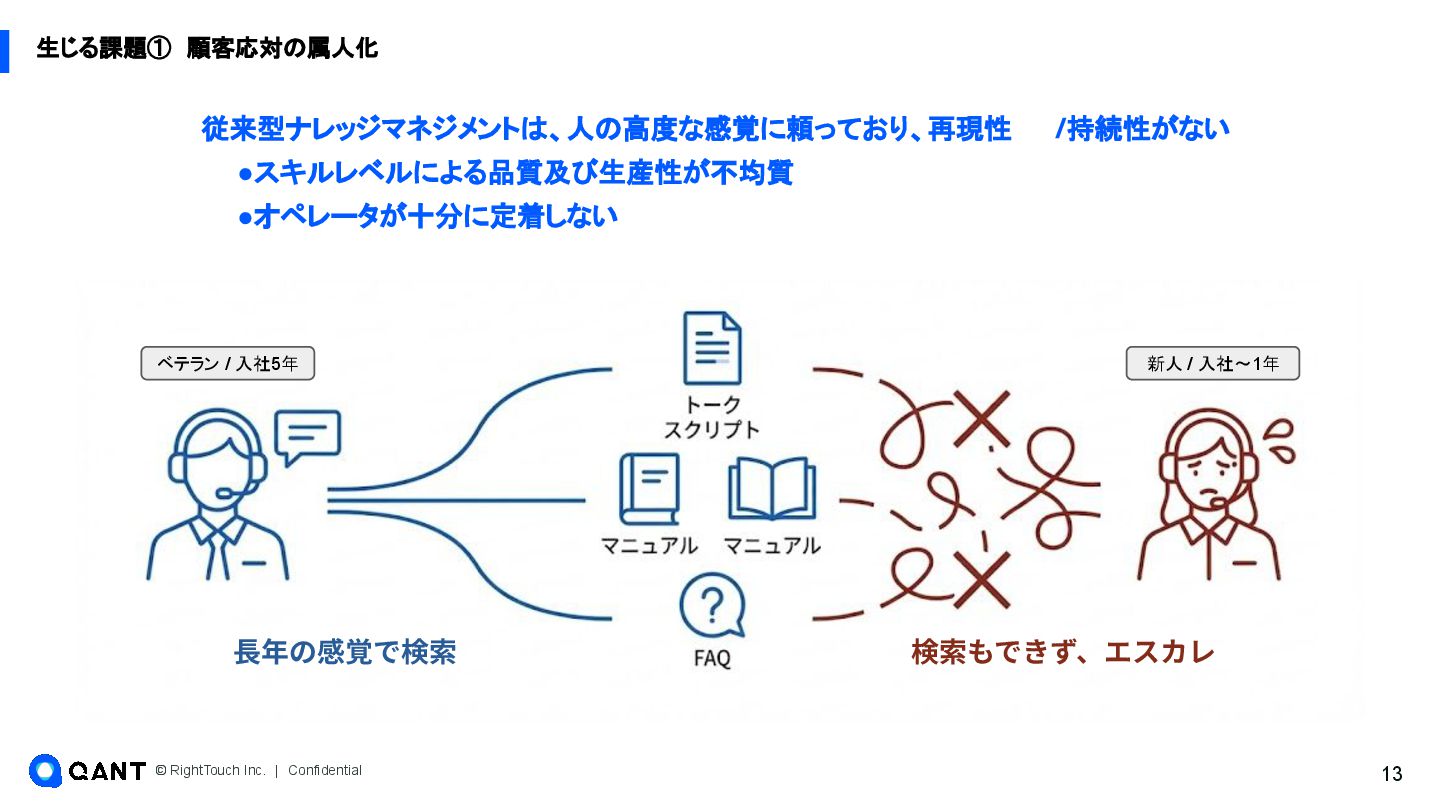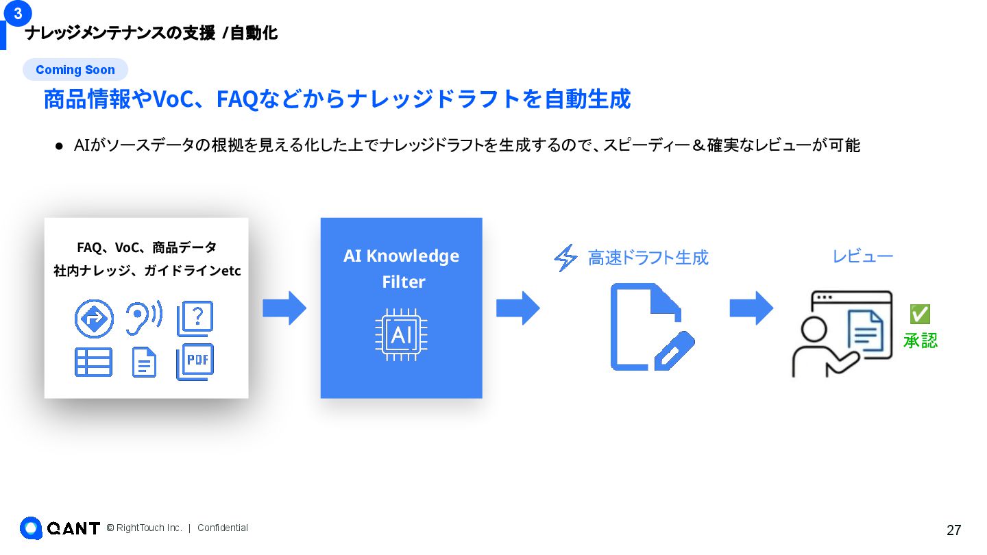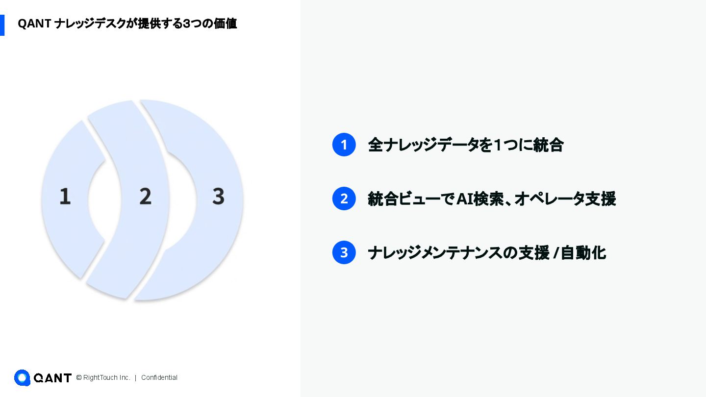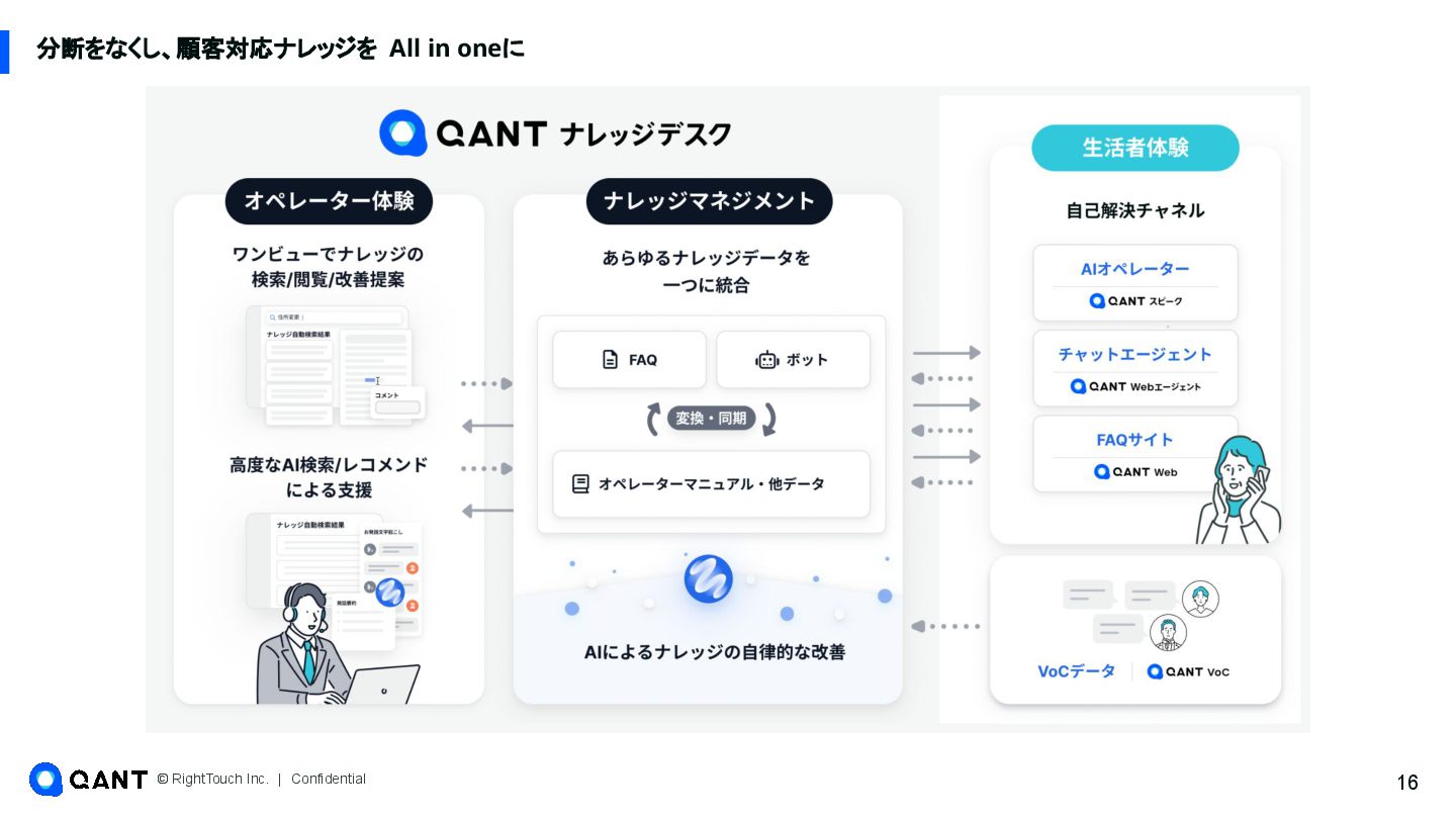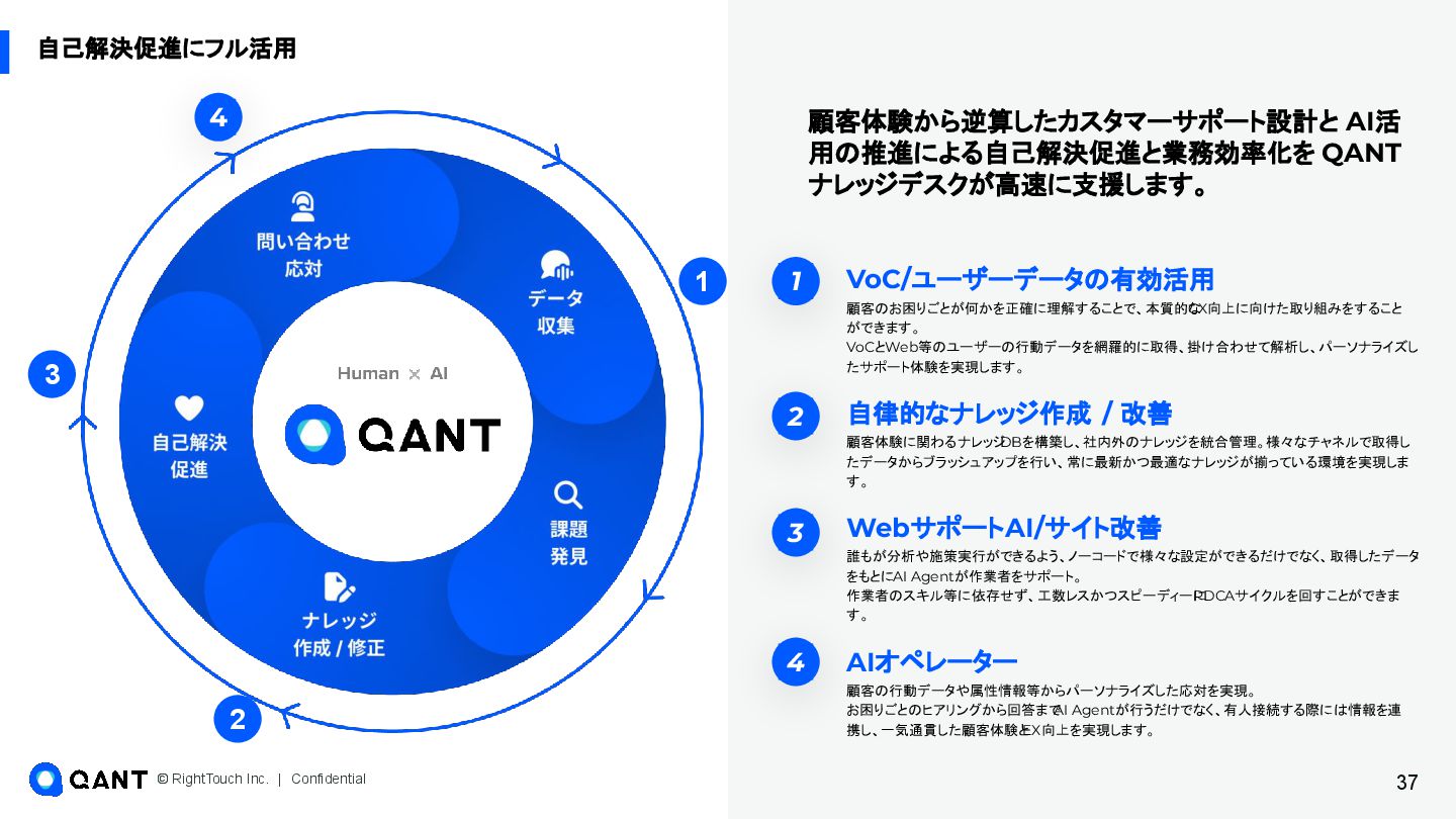 顧客のお困りごとが何かを正確に理解することで、本質的な CX向上に向けた取り組みをすること ができます。 VoCとWeb等のユーザーの行動データを網羅的に取得、掛け合わせて解析し、パーソナライズし たサポート体験を実現します。 自律的なナレッジ作成 / 改善 顧客体験に関わるナレッジ DBを構築し、社内外のナレッジを統合管理。様々なチャネルで取得し たデータからブラッシュアップを行い、常に最新かつ最適なナレッジが揃っている環境を実現しま す。 WebサポートAI/サイト改善 誰もが分析や施策実行ができるよう、ノーコードで様々な設定ができるだけでなく、取得したデータ をもとにAI Agentが作業者をサポート。 作業者のスキル等に依存せず、工数レスかつスピーディーに PDCAサイクルを回すことができま す。 AIオペレーター 顧客の行動データや属性情報等からパーソナライズした応対を実現。 お困りごとのヒアリングから回答まで AI Agentが行うだけでなく、有人接続する際には情報を連 携し、一気通貫した顧客体験と EX向上を実現します。 1 2 3 4 4 顧客体験から逆算したカスタマーサポート設計と AI活 用の推進による自己解決促進と業務効率化を QANT ナレッジデスクが高速に支援します。