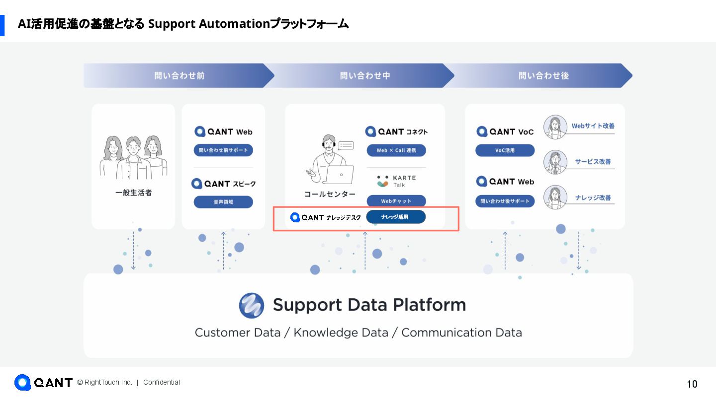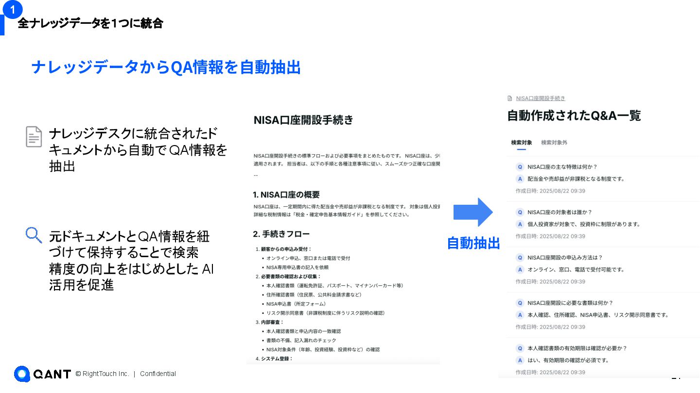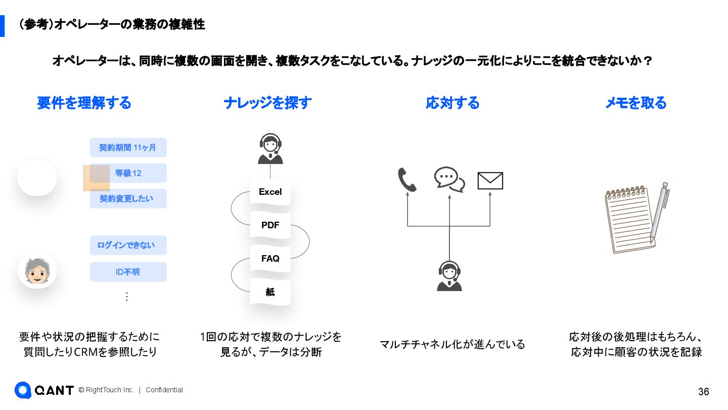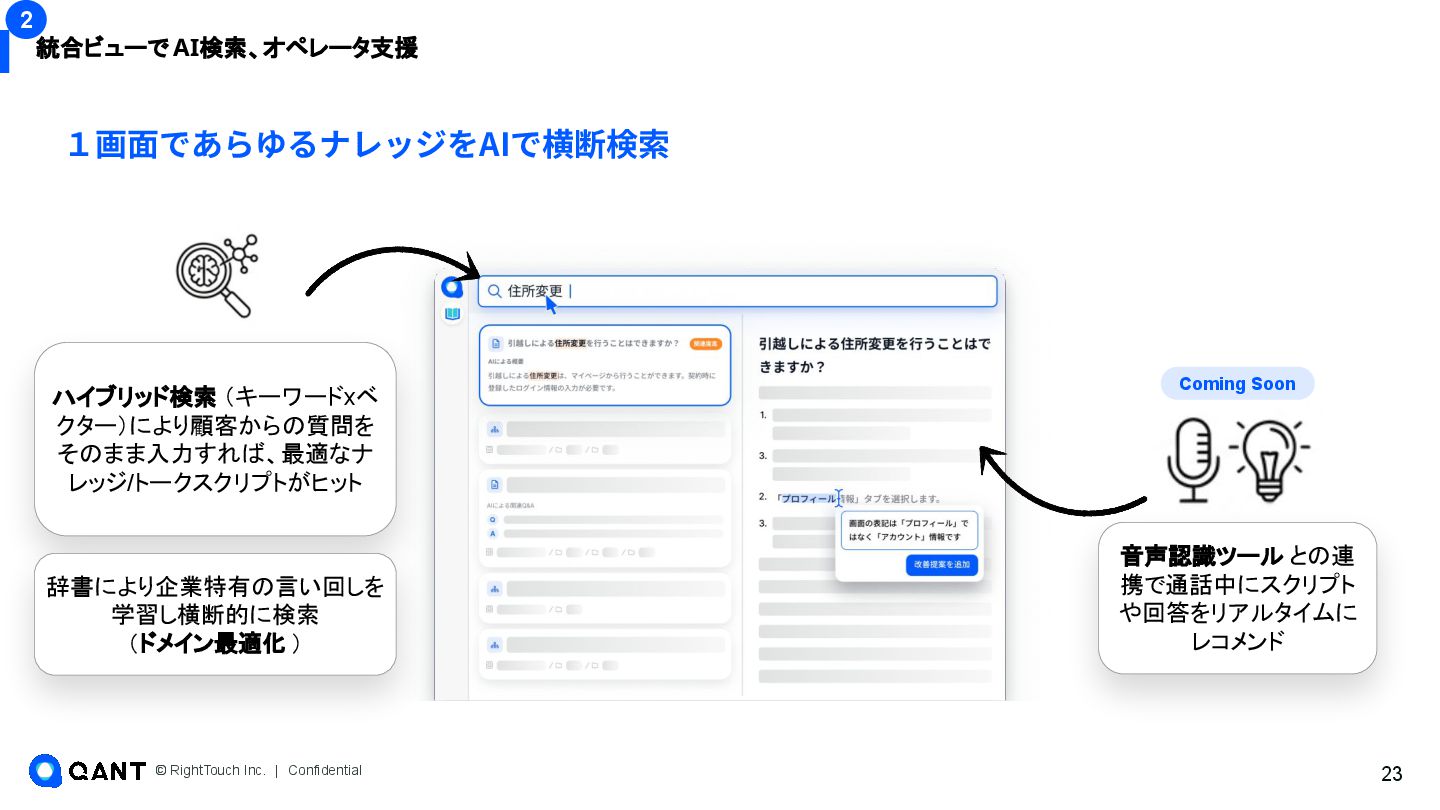 顧客のお困りごとが何かを正確に理解することで、本質的な CX向上に向けた取り組みをすること ができます。 VoCとWeb等のユーザーの行動データを網羅的に取得、掛け合わせて解析し、パーソナライズし たサポート体験を実現します。 自律的なナレッジ作成 / 改善 顧客体験に関わるナレッジ DBを構築し、社内外のナレッジを統合管理。様々なチャネルで取得し たデータからブラッシュアップを行い、常に最新かつ最適なナレッジが揃っている環境を実現しま す。 WebサポートAI/サイト改善 誰もが分析や施策実行ができるよう、ノーコードで様々な設定ができるだけでなく、取得したデータ をもとにAI Agentが作業者をサポート。 作業者のスキル等に依存せず、工数レスかつスピーディーに PDCAサイクルを回すことができま す。 AIオペレーター 顧客の行動データや属性情報等からパーソナライズした応対を実現。 お困りごとのヒアリングから回答まで AI Agentが行うだけでなく、有人接続する際には情報を連 携し、一気通貫した顧客体験と EX向上を実現します。 1 2 3 4 4 顧客体験から逆算したカスタマーサポート設計と AI活 用の推進による自己解決促進と業務効率化を QANT ナレッジデスクが高速に支援します。