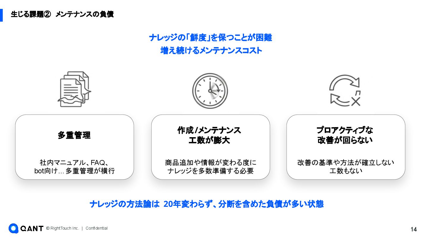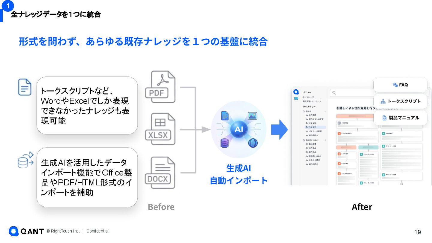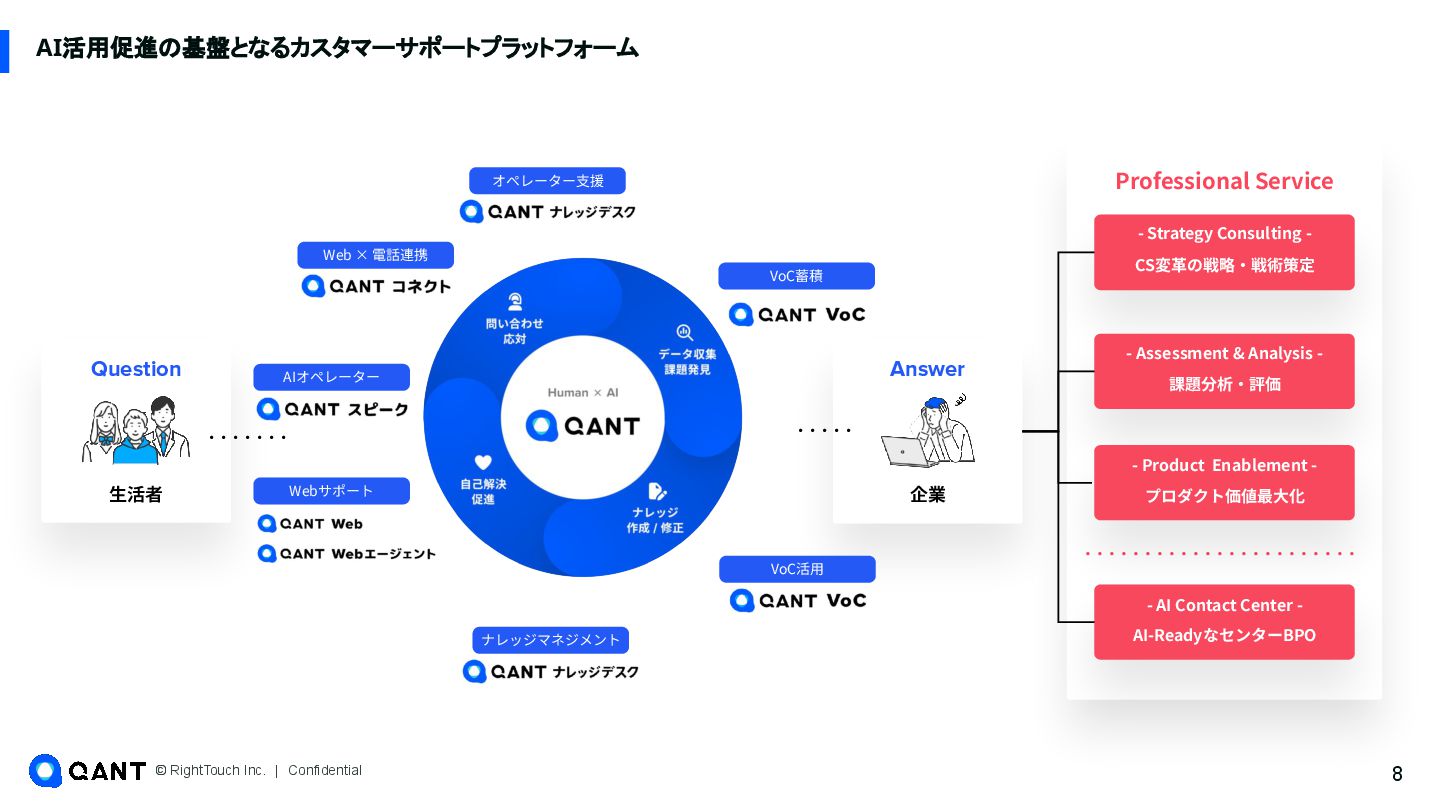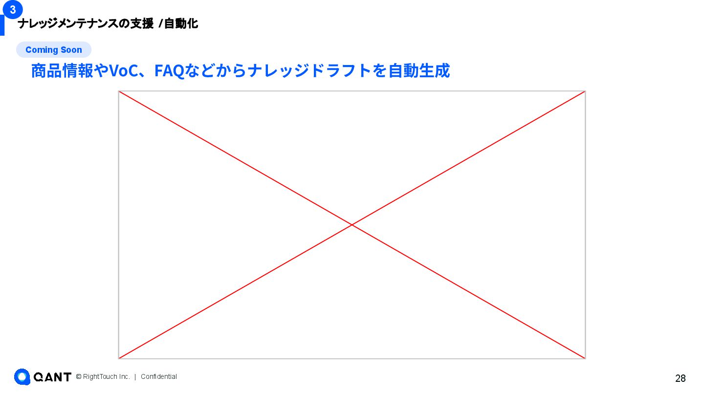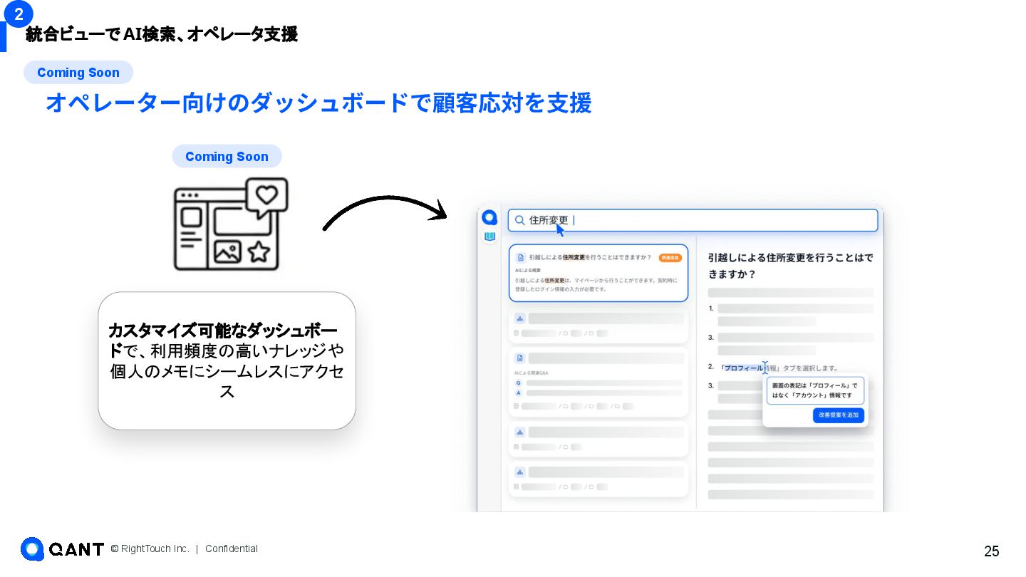 顧客のお困りごとが何かを正確に理解することで、本質的な CX向上に向けた取り組みをすること ができます。 VoCとWeb等のユーザーの行動データを網羅的に取得、掛け合わせて解析し、パーソナライズし たサポート体験を実現します。 自律的なナレッジ作成 / 改善 顧客体験に関わるナレッジ DBを構築し、社内外のナレッジを統合管理。様々なチャネルで取得し たデータからブラッシュアップを行い、常に最新かつ最適なナレッジが揃っている環境を実現しま す。 WebサポートAI/サイト改善 誰もが分析や施策実行ができるよう、ノーコードで様々な設定ができるだけでなく、取得したデータ をもとにAI Agentが作業者をサポート。 作業者のスキル等に依存せず、工数レスかつスピーディーに PDCAサイクルを回すことができま す。 AIオペレーター 顧客の行動データや属性情報等からパーソナライズした応対を実現。 お困りごとのヒアリングから回答まで AI Agentが行うだけでなく、有人接続する際には情報を連 携し、一気通貫した顧客体験と EX向上を実現します。 1 2 3 4 4 顧客体験から逆算したカスタマーサポート設計と AI活 用の推進による自己解決促進と業務効率化を QANT ナレッジデスクが高速に支援します。