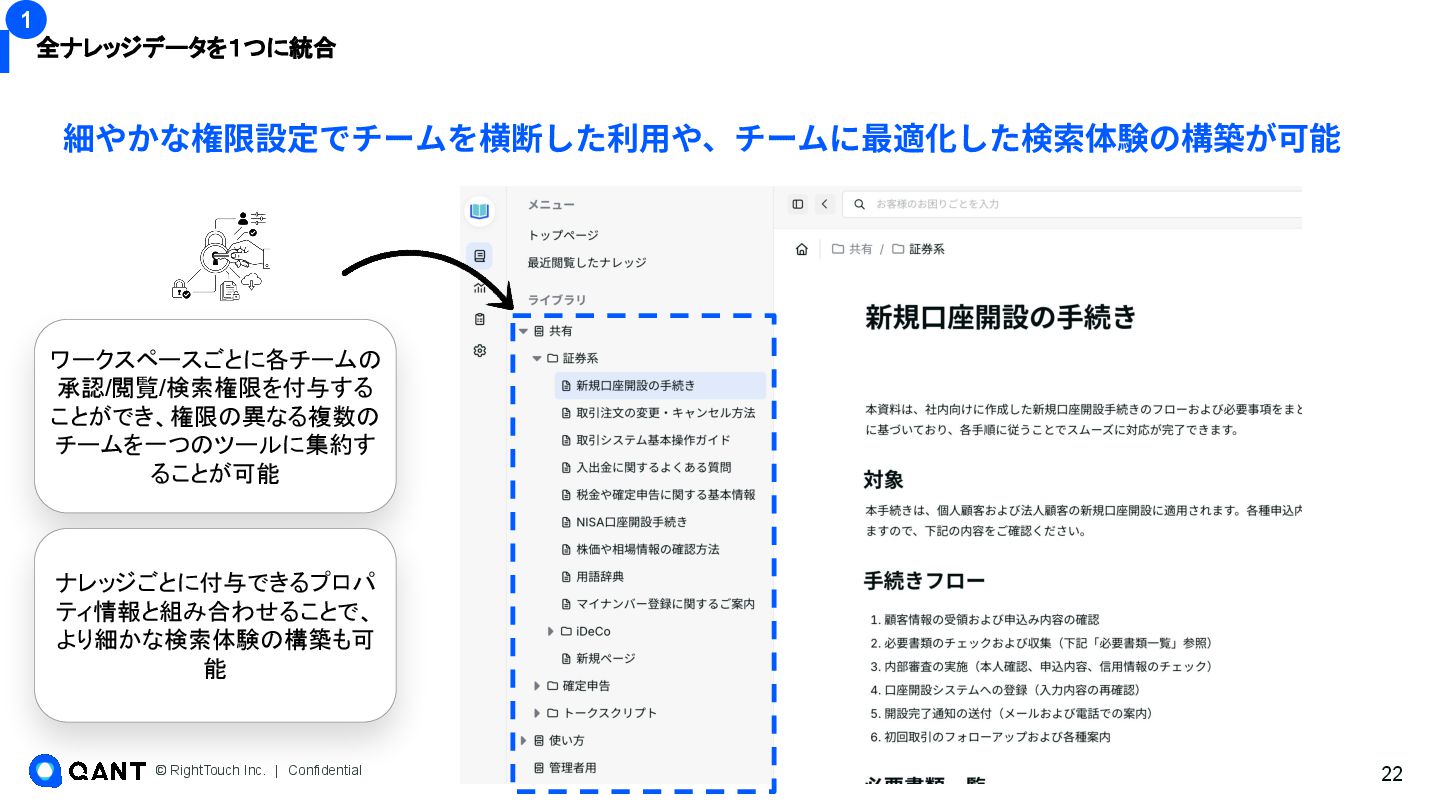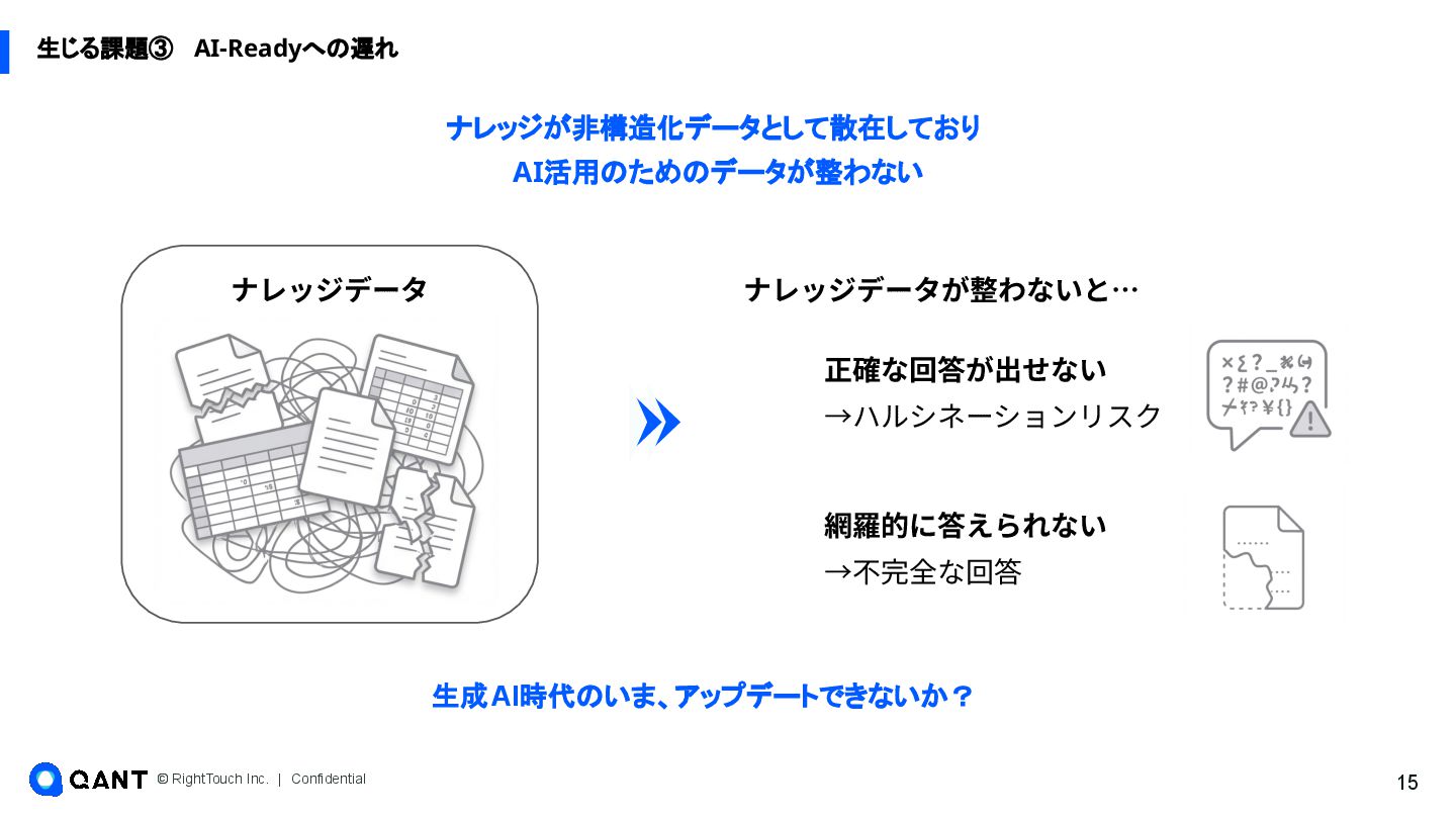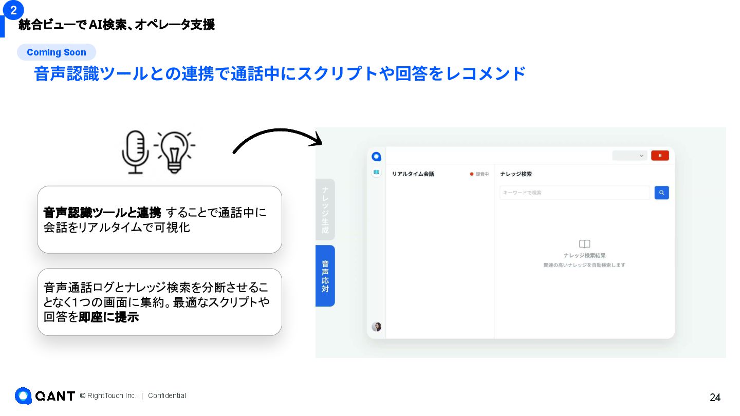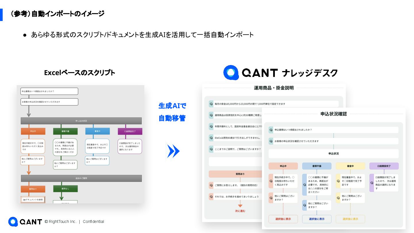 顧客のお困りごとが何かを正確に理解することで、本質的な CX向上に向けた取り組みをすること ができます。 VoCとWeb等のユーザーの行動データを網羅的に取得、掛け合わせて解析し、パーソナライズし たサポート体験を実現します。 自律的なナレッジ作成 / 改善 顧客体験に関わるナレッジ DBを構築し、社内外のナレッジを統合管理。様々なチャネルで取得し たデータからブラッシュアップを行い、常に最新かつ最適なナレッジが揃っている環境を実現しま す。 WebサポートAI/サイト改善 誰もが分析や施策実行ができるよう、ノーコードで様々な設定ができるだけでなく、取得したデータ をもとにAI Agentが作業者をサポート。 作業者のスキル等に依存せず、工数レスかつスピーディーに PDCAサイクルを回すことができま す。 AIオペレーター 顧客の行動データや属性情報等からパーソナライズした応対を実現。 お困りごとのヒアリングから回答まで AI Agentが行うだけでなく、有人接続する際には情報を連 携し、一気通貫した顧客体験と EX向上を実現します。 1 2 3 4 4 顧客体験から逆算したカスタマーサポート設計と AI活 用の推進による自己解決促進と業務効率化を QANT ナレッジデスクが高速に支援します。