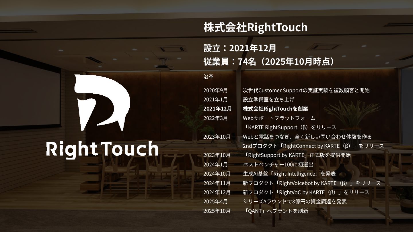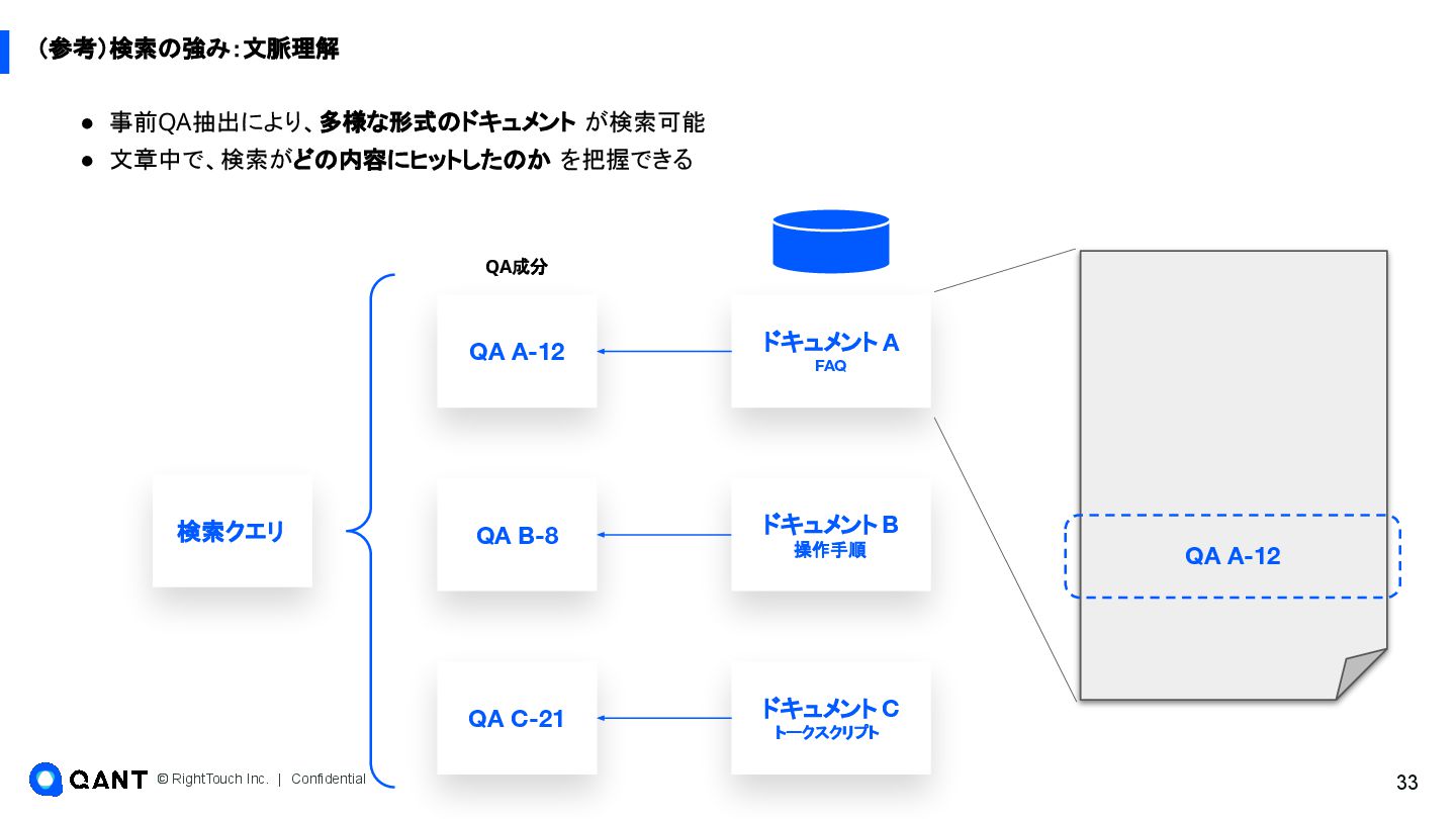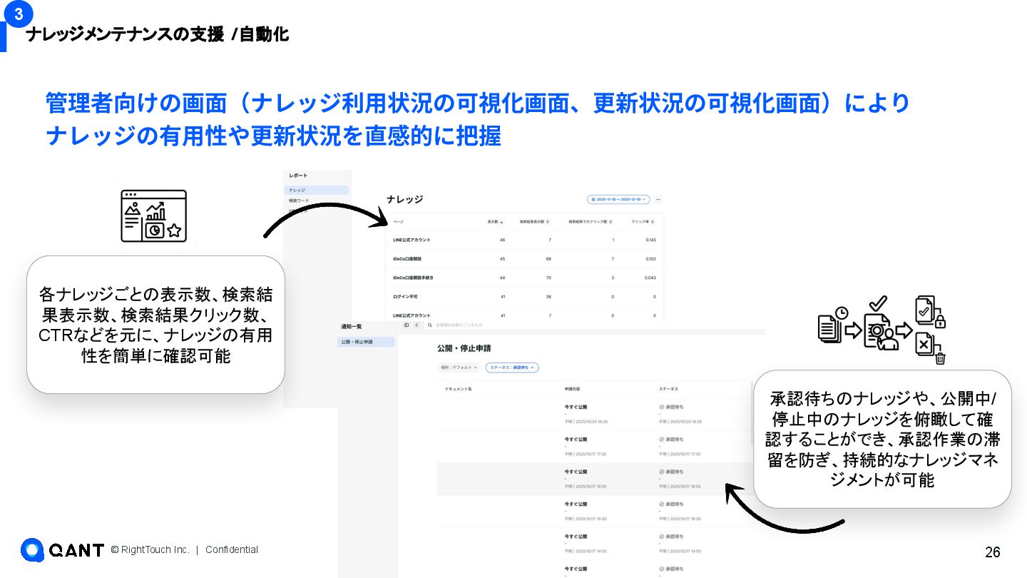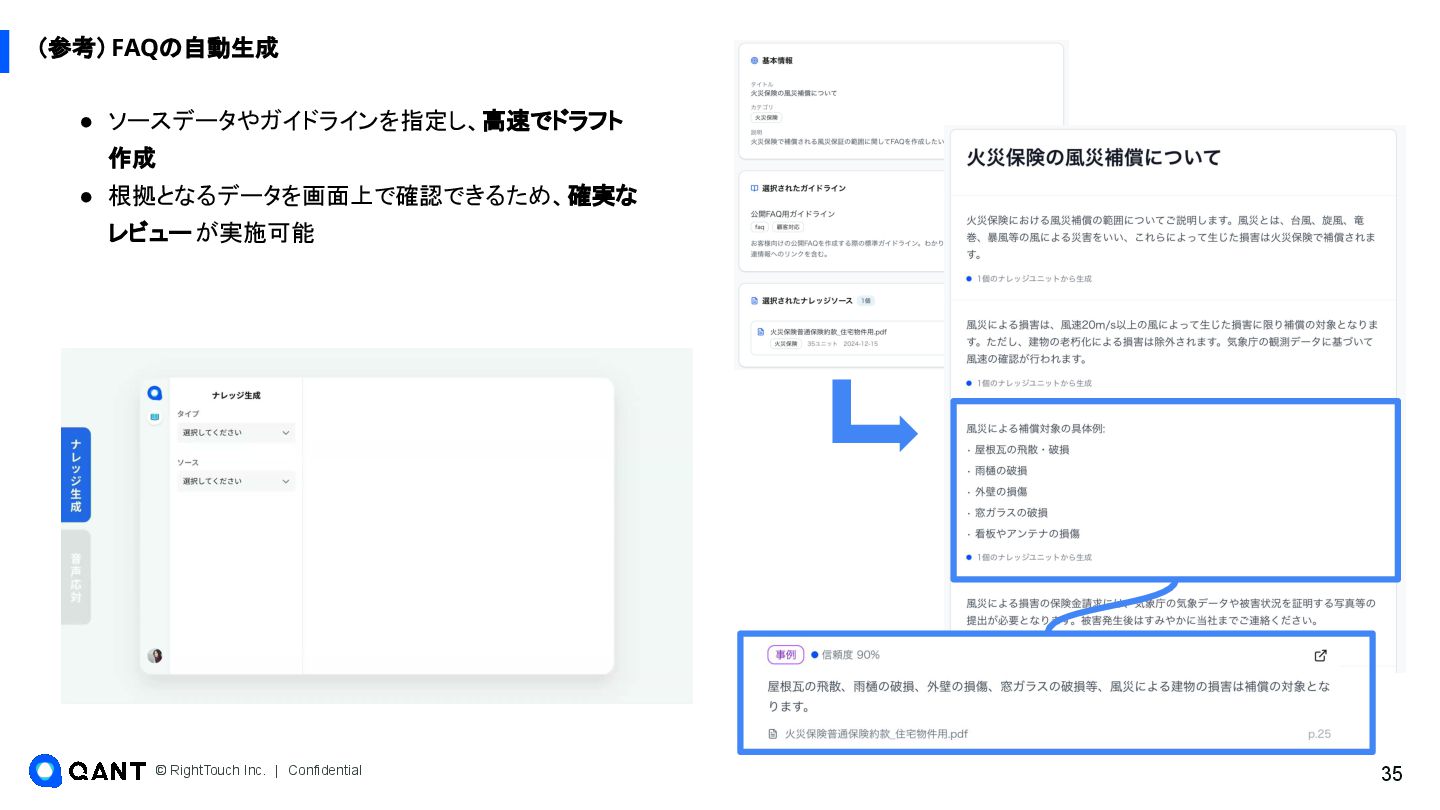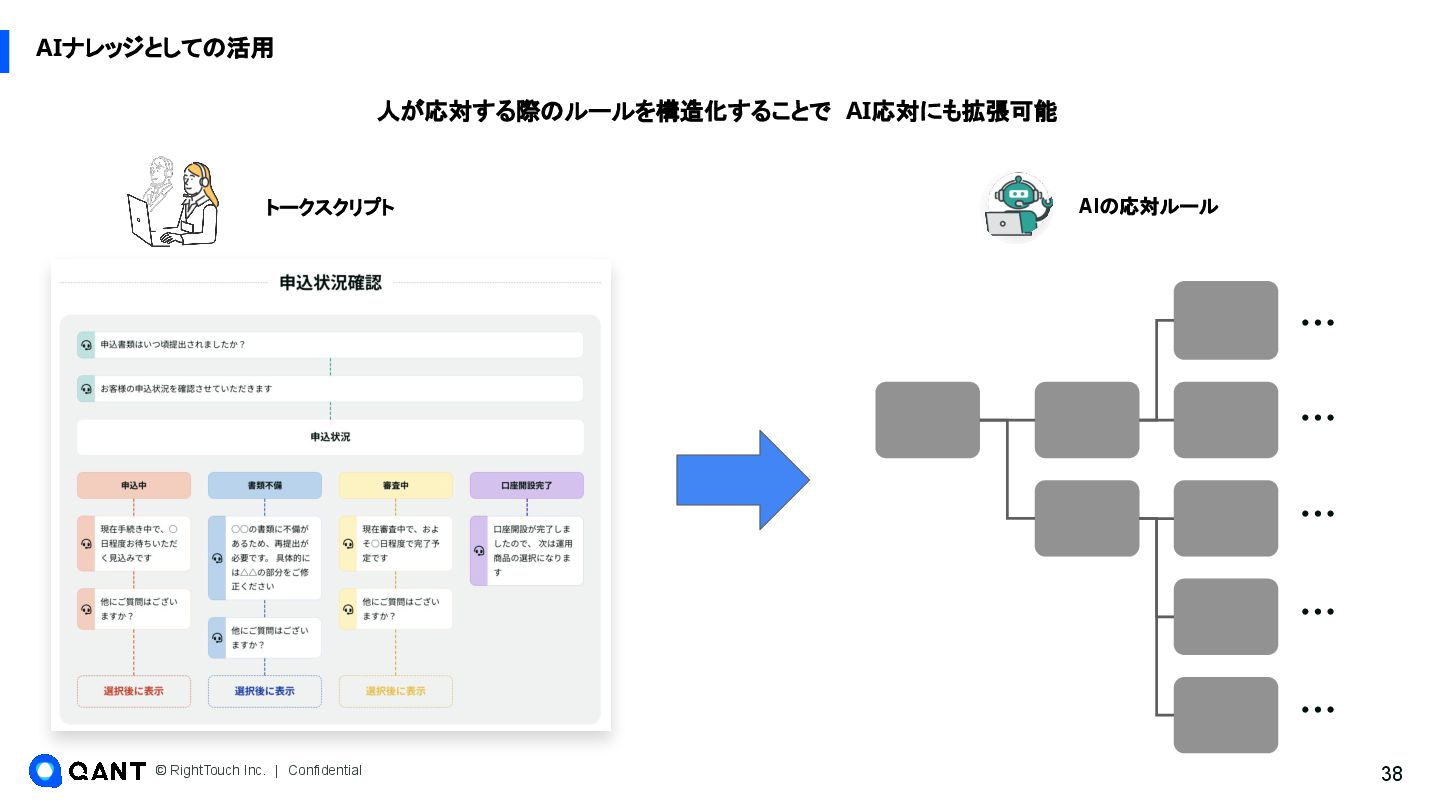 顧客のお困りごとが何かを正確に理解することで、本質的な CX向上に向けた取り組みをすること ができます。 VoCとWeb等のユーザーの行動データを網羅的に取得、掛け合わせて解析し、パーソナライズし たサポート体験を実現します。 自律的なナレッジ作成 / 改善 顧客体験に関わるナレッジ DBを構築し、社内外のナレッジを統合管理。様々なチャネルで取得し たデータからブラッシュアップを行い、常に最新かつ最適なナレッジが揃っている環境を実現しま す。 WebサポートAI/サイト改善 誰もが分析や施策実行ができるよう、ノーコードで様々な設定ができるだけでなく、取得したデータ をもとにAI Agentが作業者をサポート。 作業者のスキル等に依存せず、工数レスかつスピーディーに PDCAサイクルを回すことができま す。 AIオペレーター 顧客の行動データや属性情報等からパーソナライズした応対を実現。 お困りごとのヒアリングから回答まで AI Agentが行うだけでなく、有人接続する際には情報を連 携し、一気通貫した顧客体験と EX向上を実現します。 1 2 3 4 4 顧客体験から逆算したカスタマーサポート設計と AI活 用の推進による自己解決促進と業務効率化を QANT ナレッジデスクが高速に支援します。