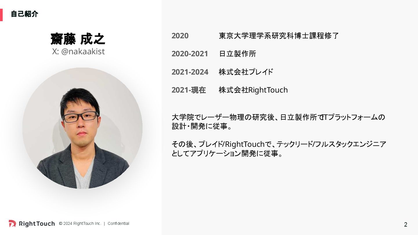 2020-2021 日立製作所 2021-2024 株式会社プレイド 2021-現在 株式会社RightTouch 大学院でレーザー物理の研究後、日立製作所で ITプラットフォームの 設計・開発に従事。 その後、プレイド/RightTouchで、テックリード/フルスタックエンジニア としてアプリケーション開発に従事。 齋藤 成之 X: @nakaakist