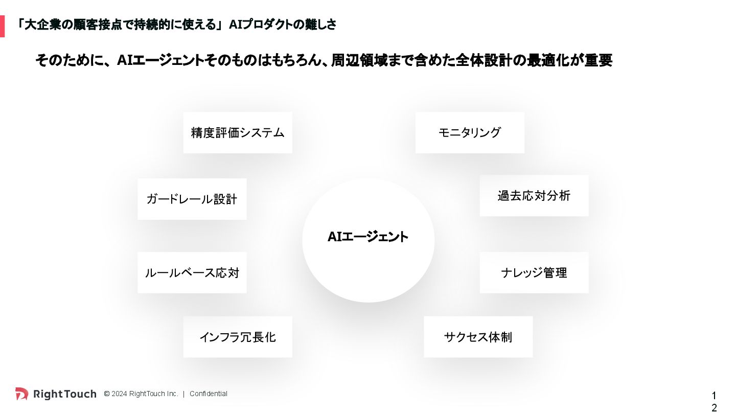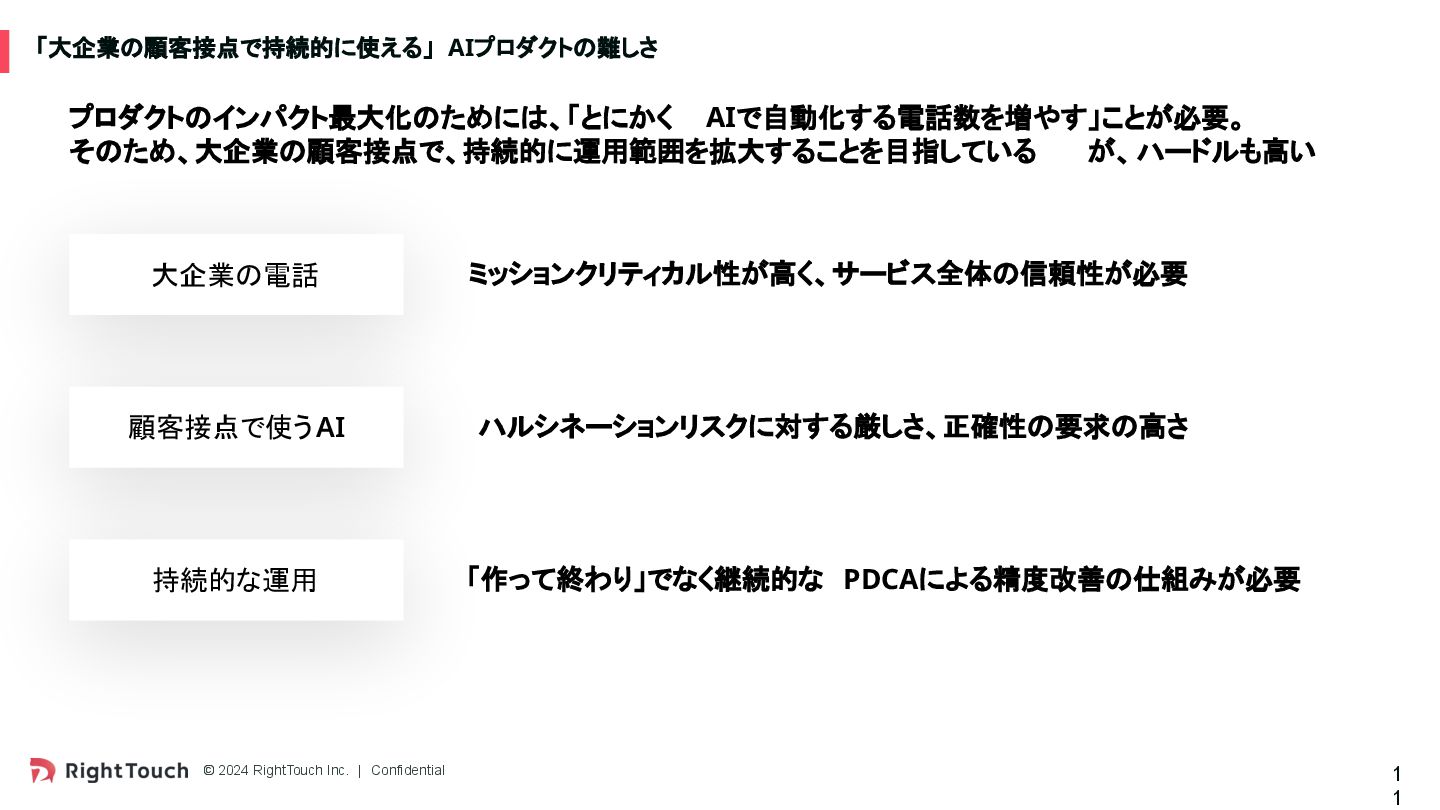 © 2024 RightTouch Inc. | Confidential 1 2 「大企業の顧客接点で持続的に使える」 AIプロダクトの難しさ そのために、