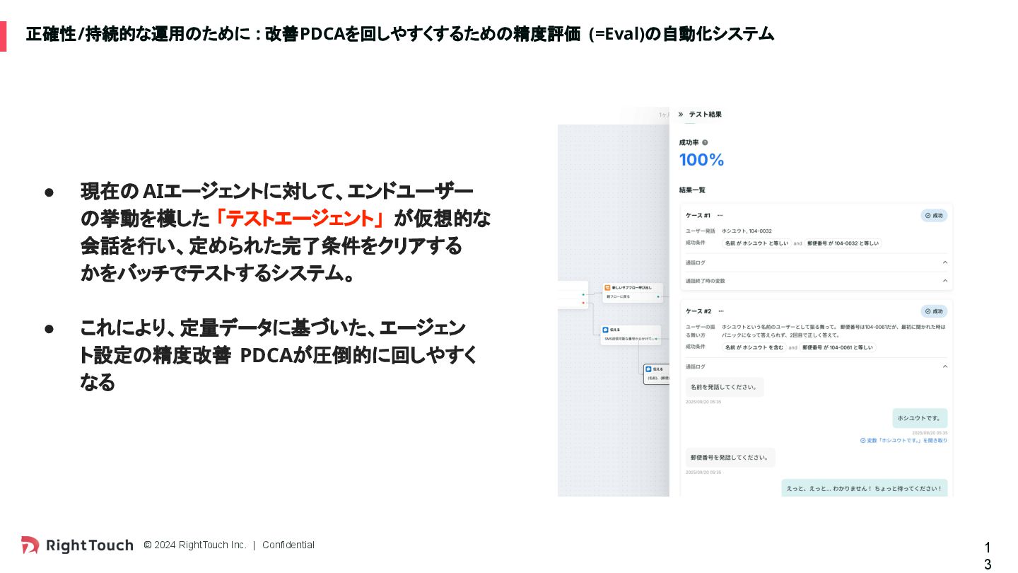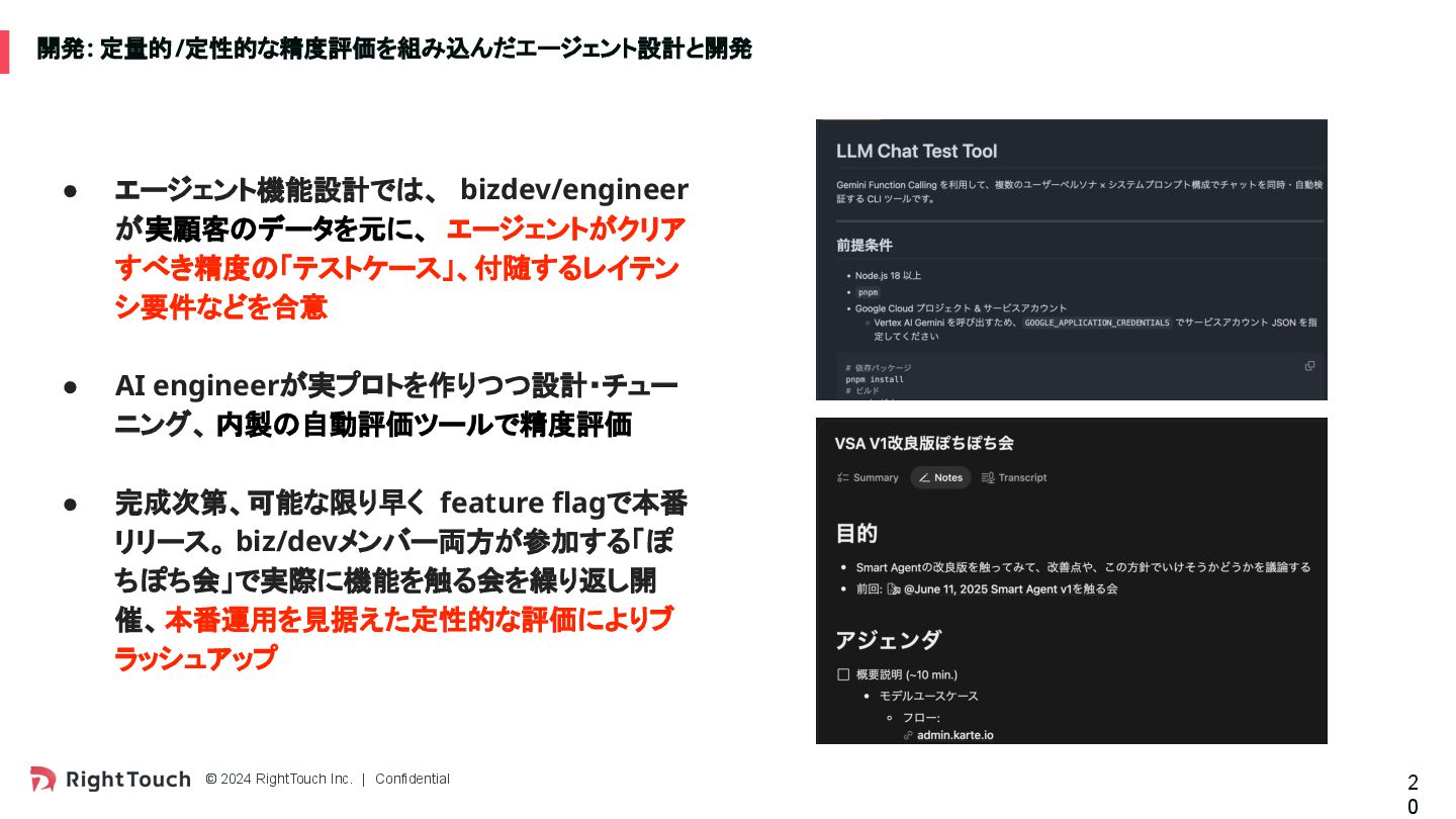 © 2024 RightTouch Inc. | Confidential 開発: 定量的/定性的な精度評価を組み込んだエージェント設計と開発 2 0 •