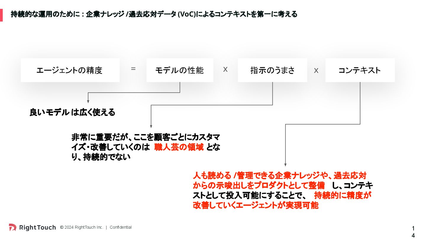 (VoC)によるコンテキストを第一に考える エージェントの精度 モデルの性能 指示のうまさ コンテキスト x x = 良いモデルは広く使える 非常に重要だが、ここを顧客ごとにカスタマ イズ・改善していくのは 職人芸の領域 とな り、持続的でない 人も読める /管理できる企業ナレッジや、過去応対 からの示唆出しをプロダクトとして整備 し、コンテキ ストとして投入可能にすることで、 持続的に精度が 改善していくエージェントが実現可能