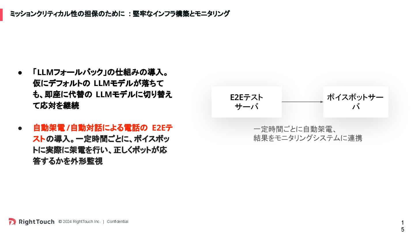 • 「LLMフォールバック」の仕組みの導入。 仮にデフォルトの LLMモデルが落ちて も、即座に代替の LLMモデルに切り替え て応対を継続 • 自動架電 /自動対話による電話の E2Eテ ストの導入。一定時間ごとに、ボイスボッ トに実際に架電を行い、正しくボットが応 答するかを外形監視 ボイスボットサー バ E2Eテスト サーバ 一定時間ごとに自動架電、 結果をモニタリングシステムに連携