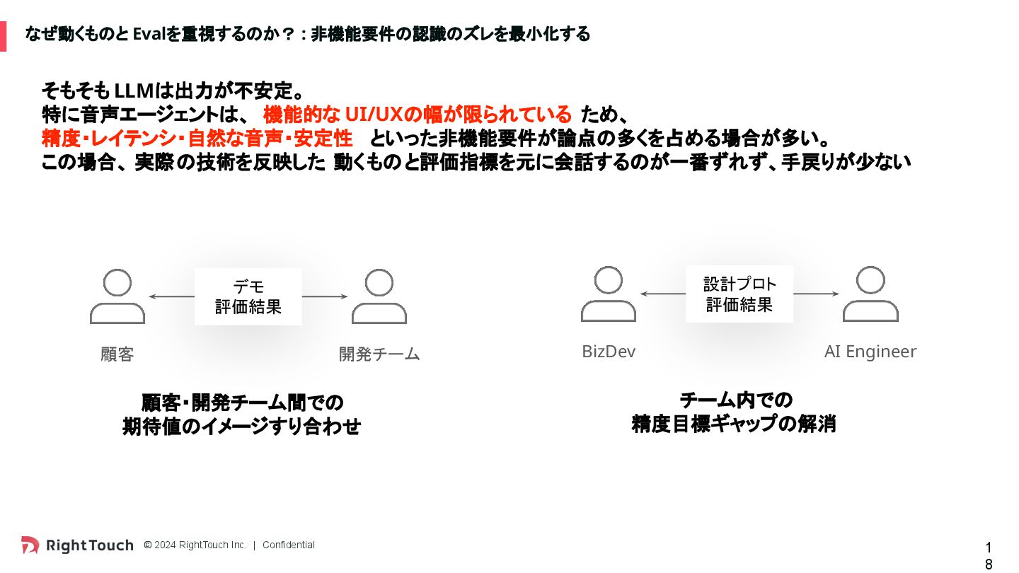 © 2024 RightTouch Inc. | Confidential 1 8 なぜ動くものと Evalを重視するのか? : 非機能要件の認識のズレを最小化する