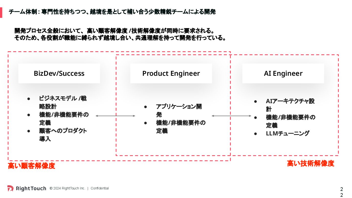 開発プロセス全般において、 高い顧客解像度 /技術解像度が同時に要求される。 そのため、各役割が職能に縛られず越境し合い、共通理解を持って開発を行っている。 BizDev/Success AI Engineer Product Engineer 高い顧客解像度 高い技術解像度 • ビジネスモデル /戦 略設計 • 機能/非機能要件の 定義 • 顧客へのプロダクト 導入 • アプリケーション開 発 • 機能/非機能要件の 定義 • AIアーキテクチャ設 計 • 機能/非機能要件の 定義 • LLMチューニング