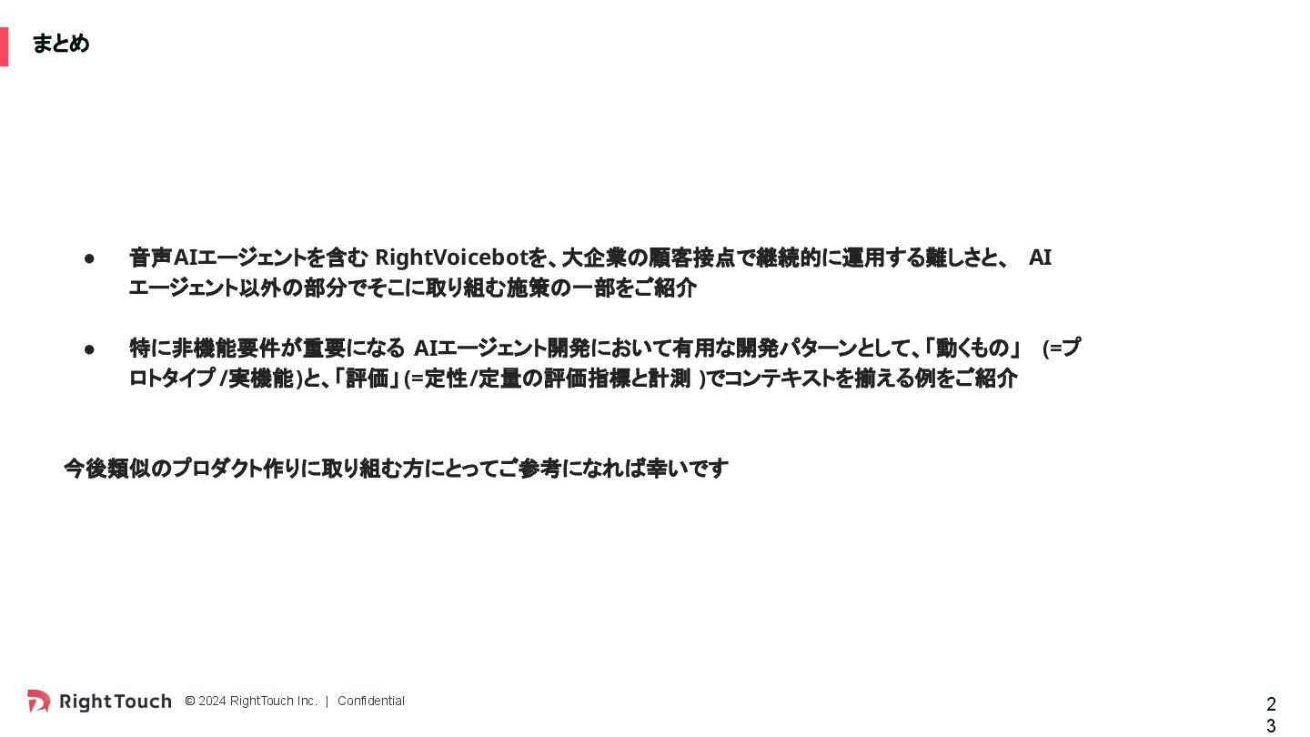 © 2024 RightTouch Inc. | Confidential まとめ 2 3 • 音声AIエージェントを含む RightVoicebotを、大企業の顧客接点で継続的に運用する難しさと、