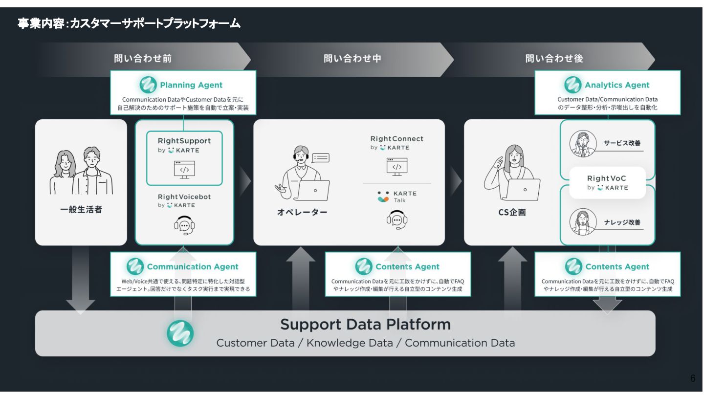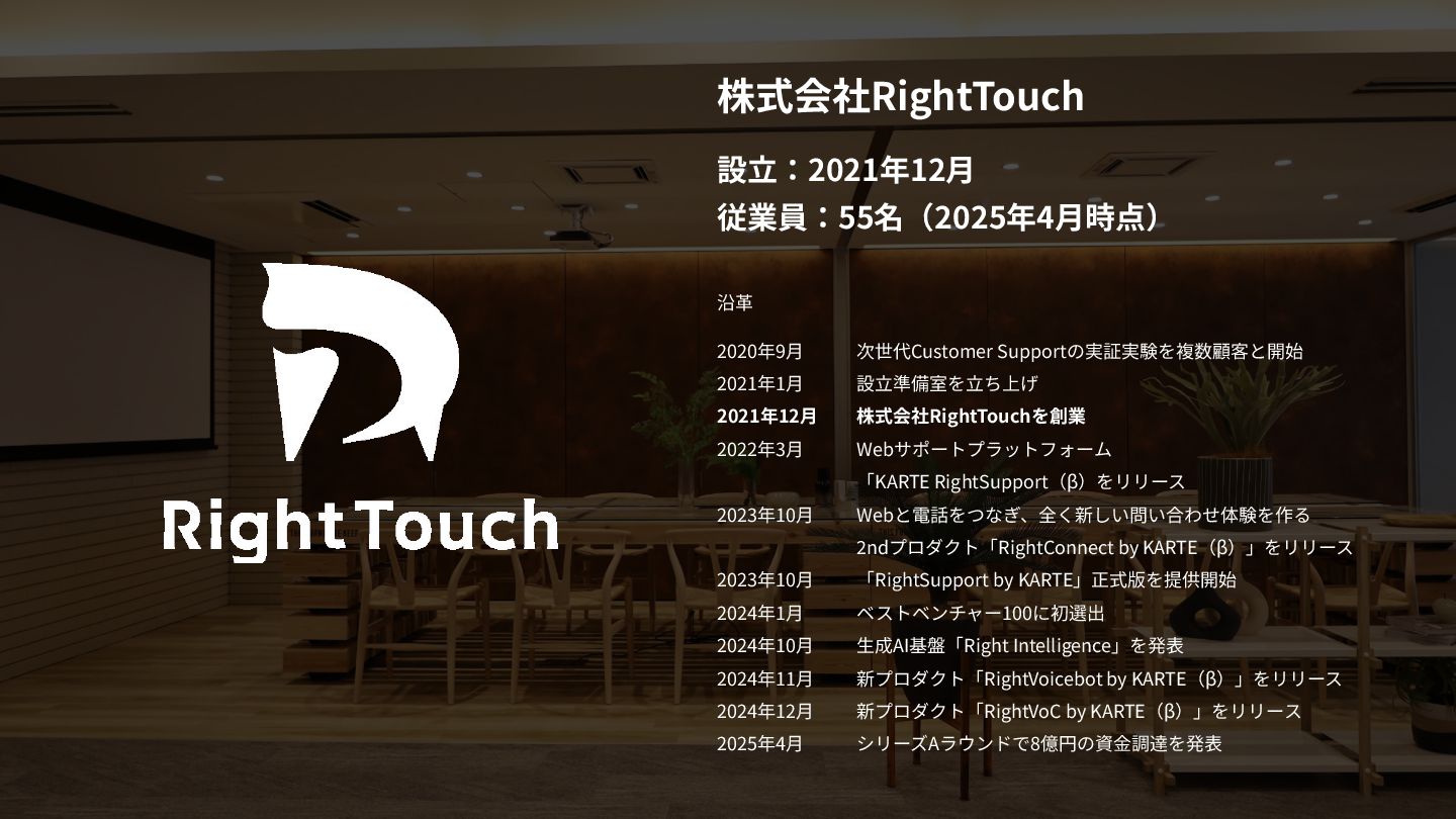 2024年1⽉ 2024年10⽉ 2024年11⽉ 2024年12⽉ 2025年4⽉ 次世代Customer Supportの実証実験を複数顧客と開始 設⽴準備室を⽴ち上げ 株式会社RightTouchを創業 Webサポートプラットフォーム 「KARTE RightSupport(β)をリリース Webと電話をつなぎ、全く新しい問い合わせ体験を作る 2ndプロダクト「RightConnect by KARTE(β)」をリリース 「RightSupport by KARTE」正式版を提供開始 ベストベンチャー100に初選出 ⽣成AI基盤「Right Intelligence」を発表 新プロダクト「RightVoicebot by KARTE(β)」をリリース 新プロダクト「RightVoC by KARTE(β)」をリリース シリーズAラウンドで8億円の資⾦調達を発表 沿⾰