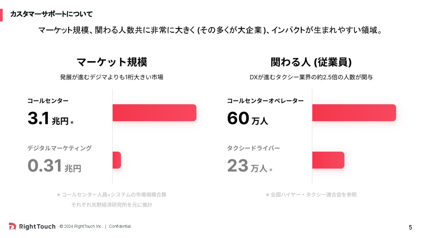 © 2024 RightTouch Inc. | Confidential 5 カスタマーサポートについて マーケット規模、関わる人数共に非常に大きく (その多くが大企業)、インパクトが生まれやすい領域。