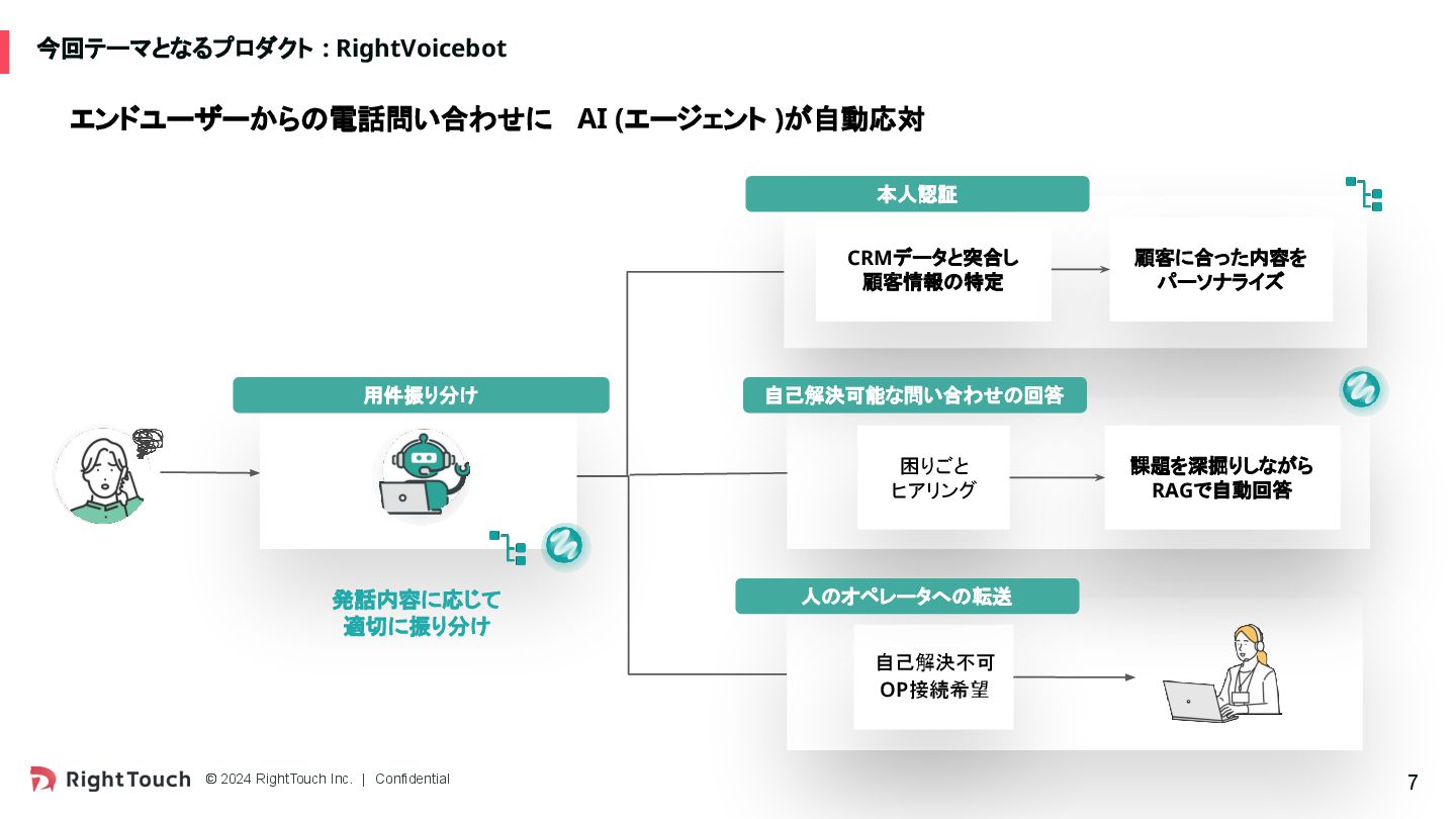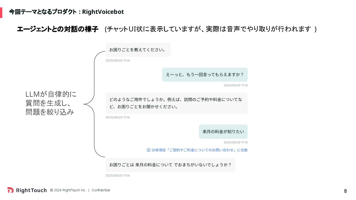 © 2024 RightTouch Inc. | Confidential 7 今回テーマとなるプロダクト : RightVoicebot 自己解決不可 OP接続希望