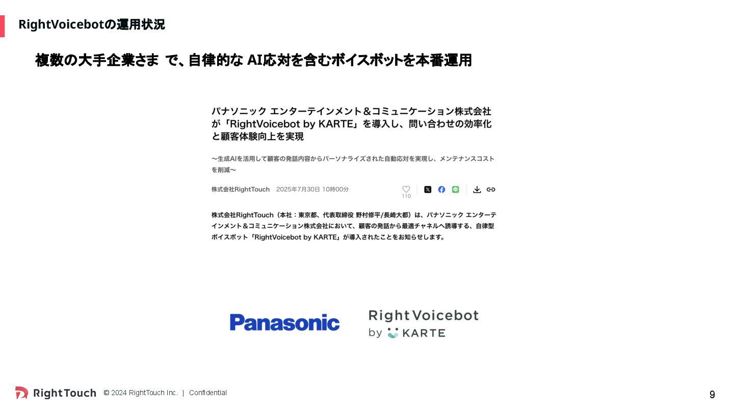 © 2024 RightTouch Inc. | Confidential 9 RightVoicebotの運用状況 複数の大手企業さま で、自律的な AI応対を含むボイスボットを本番運用