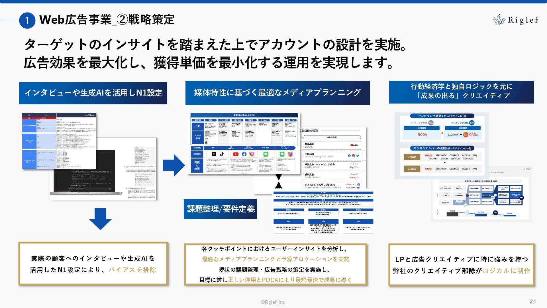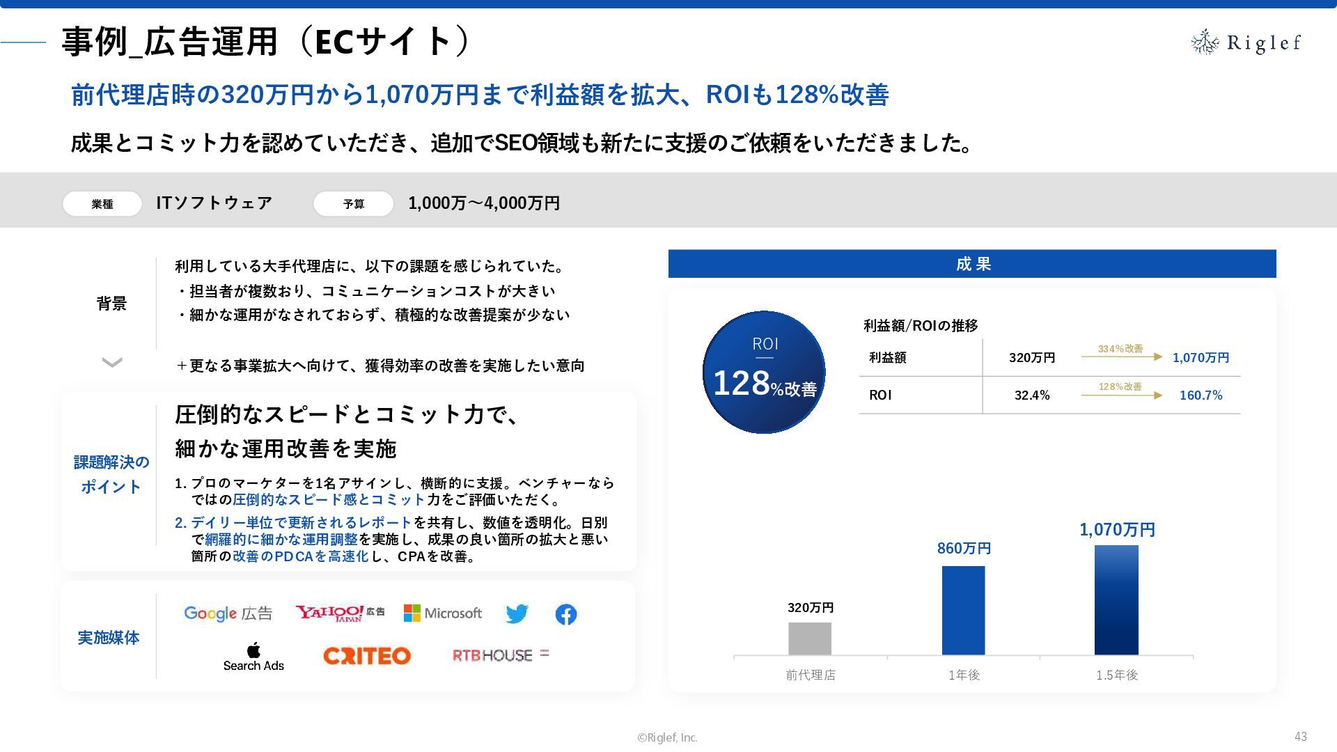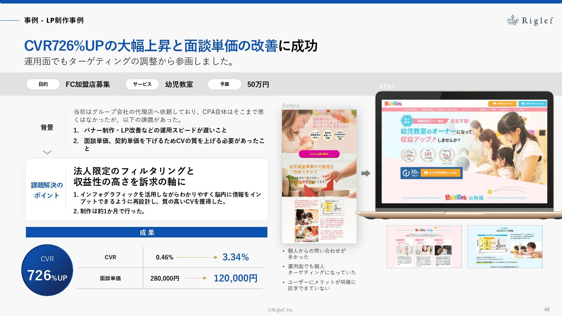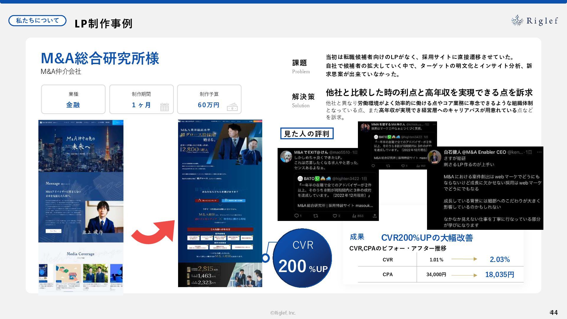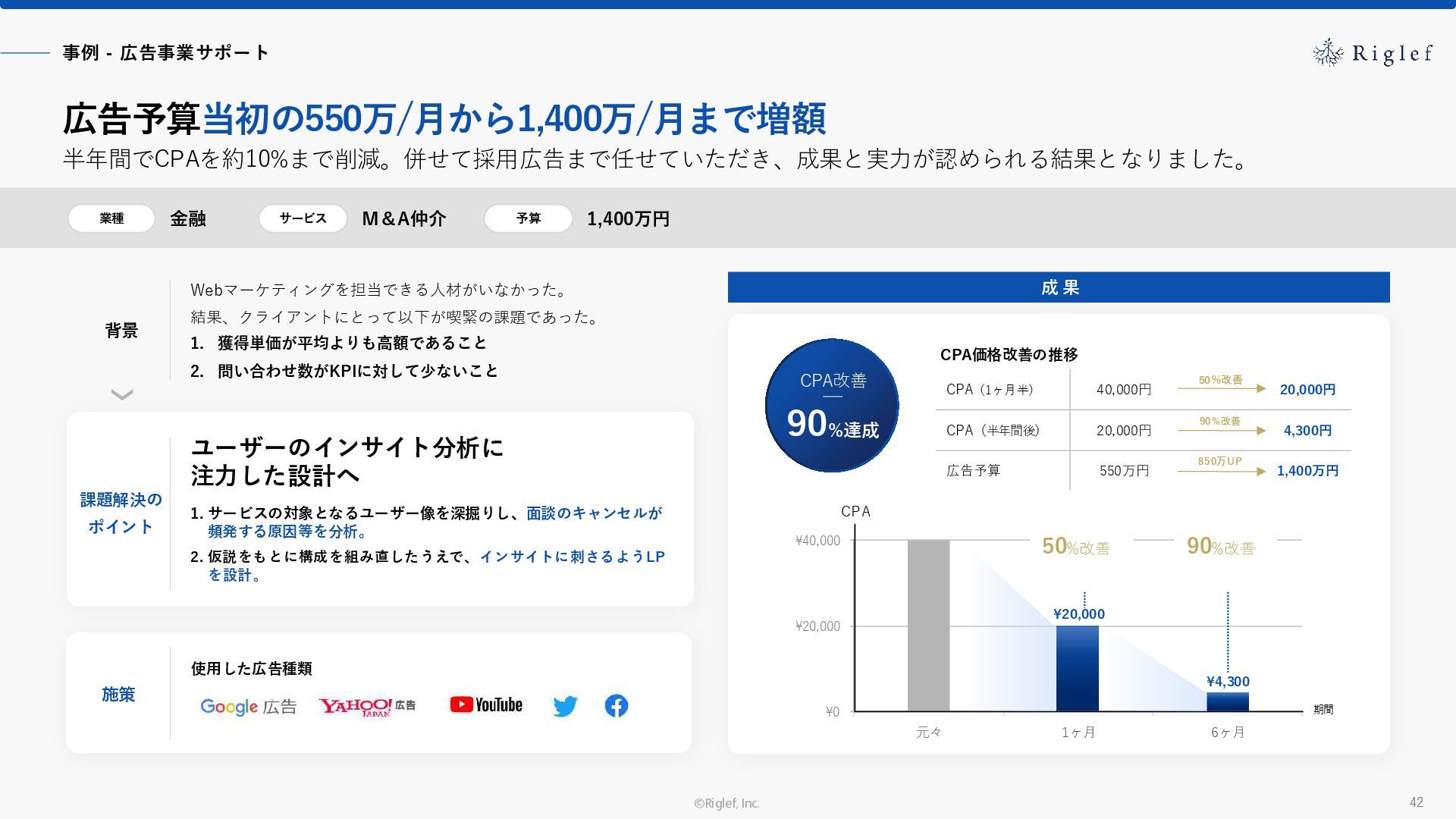 果 背景 課題解決の ポイント 業種 サービス 金融 M&A仲介 Webマーケティングを担当できる人材がいなかった。 結果、クライアントにとって以下が喫緊の課題であった。 1. 獲得単価が平均よりも高額であること 2. 問い合わせ数がKPIに対して少ないこと ユーザーのインサイト分析に 注力した設計へ 予算 1,400万円 施策 CPA(1ヶ月半) 40,000円 50%改善 20,000円 CPA(半年間後) 20,000円 90%改善 4,300円 広告予算 550万円 850万UP 1,400万円 CPA改善 90%達成 ¥20,000 ¥4,300 ¥0 ¥20,000 ¥40,000 元々 1ヶ月 6ヶ月 期間 CPA 50%改善 90%改善 CPA価格改善の推移 使用した広告種類 1. サービスの対象となるユーザー像を深掘りし、面談のキャンセルが 頻発する原因等を分析。 2. 仮説をもとに構成を組み直したうえで、インサイトに刺さるようLP を設計。