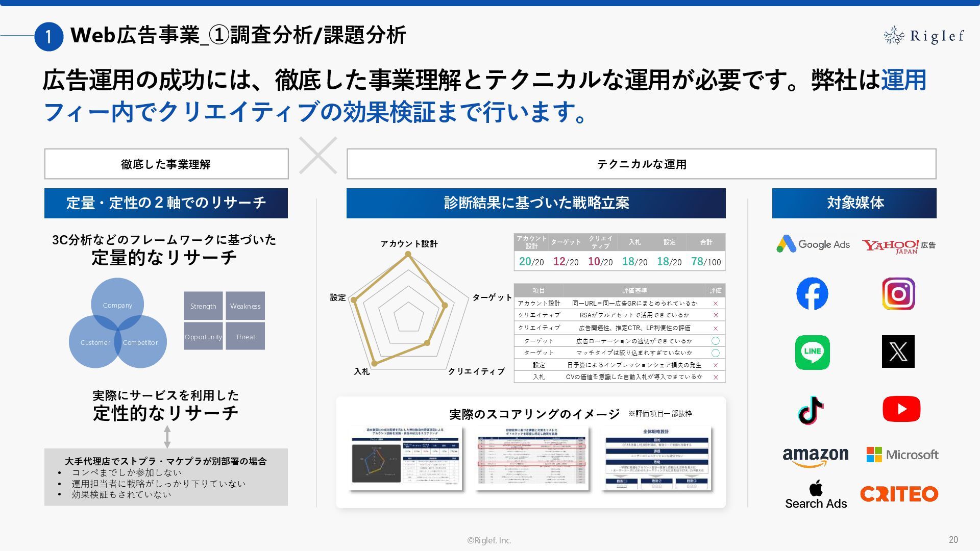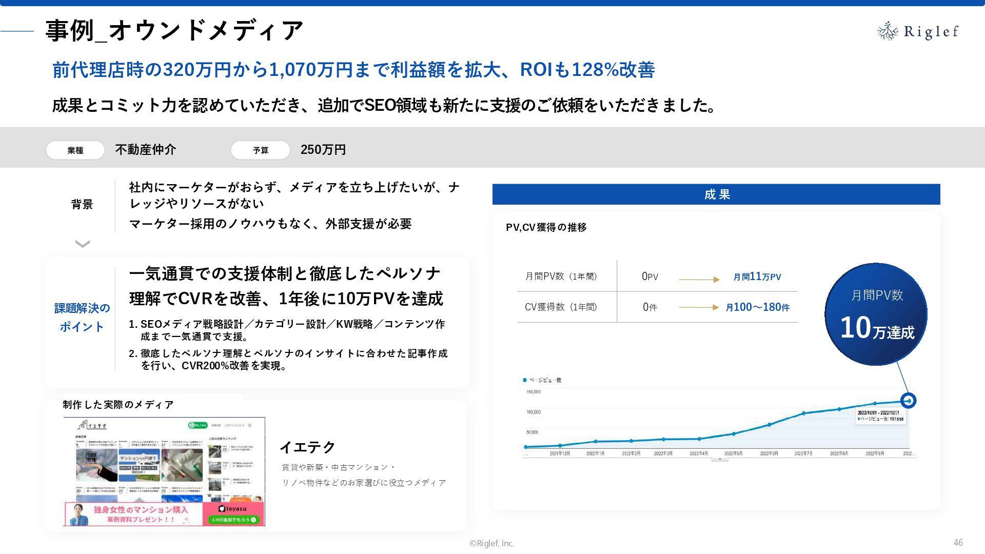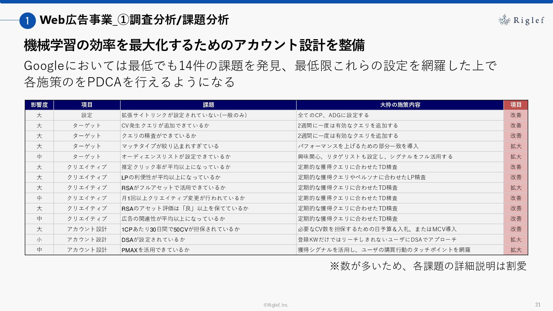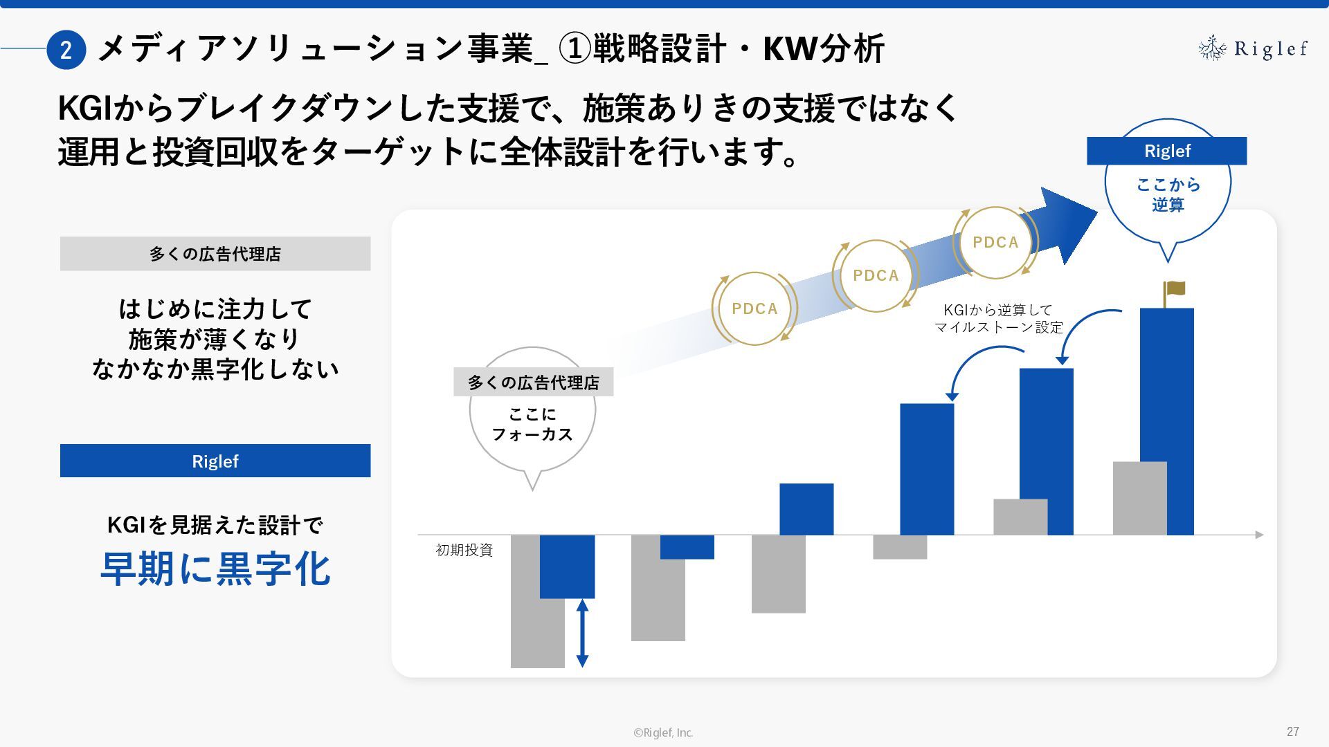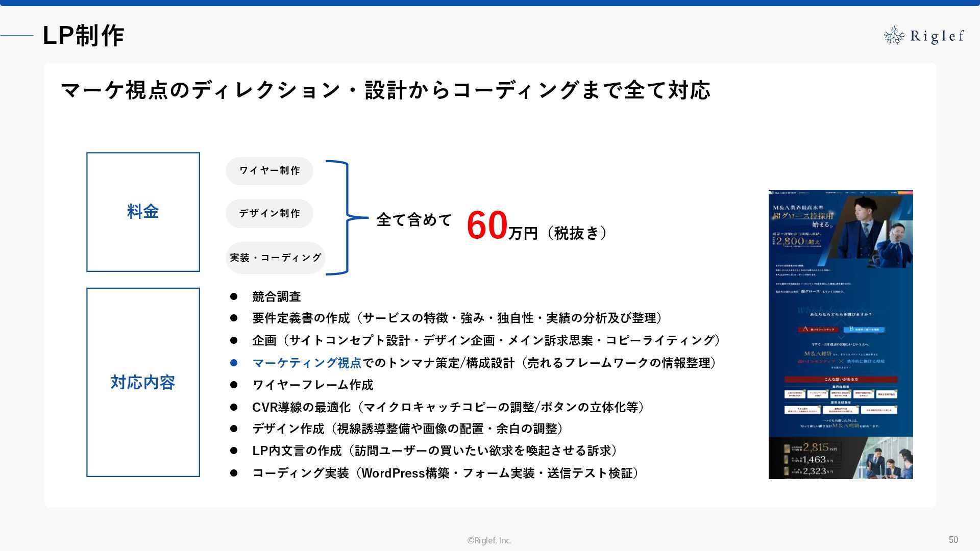 果 背景 課題解決の ポイント 業種 サービス 金融 M&A仲介 Webマーケティングを担当できる人材がいなかった。 結果、クライアントにとって以下が喫緊の課題であった。 1. 獲得単価が平均よりも高額であること 2. 問い合わせ数がKPIに対して少ないこと ユーザーのインサイト分析に 注力した設計へ 予算 1,400万円 施策 CPA(1ヶ月半) 40,000円 50%改善 20,000円 CPA(半年間後) 20,000円 90%改善 4,300円 広告予算 550万円 850万UP 1,400万円 CPA改善 90%達成 ¥20,000 ¥4,300 ¥0 ¥20,000 ¥40,000 元々 1ヶ月 6ヶ月 期間 CPA 50%改善 90%改善 CPA価格改善の推移 使用した広告種類 1. サービスの対象となるユーザー像を深掘りし、面談のキャンセルが 頻発する原因等を分析。 2. 仮説をもとに構成を組み直したうえで、インサイトに刺さるようLP を設計。